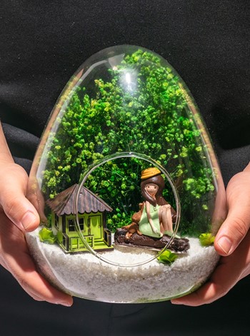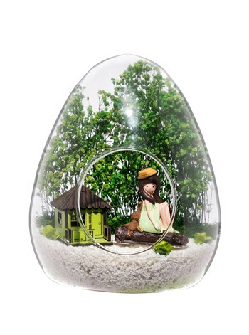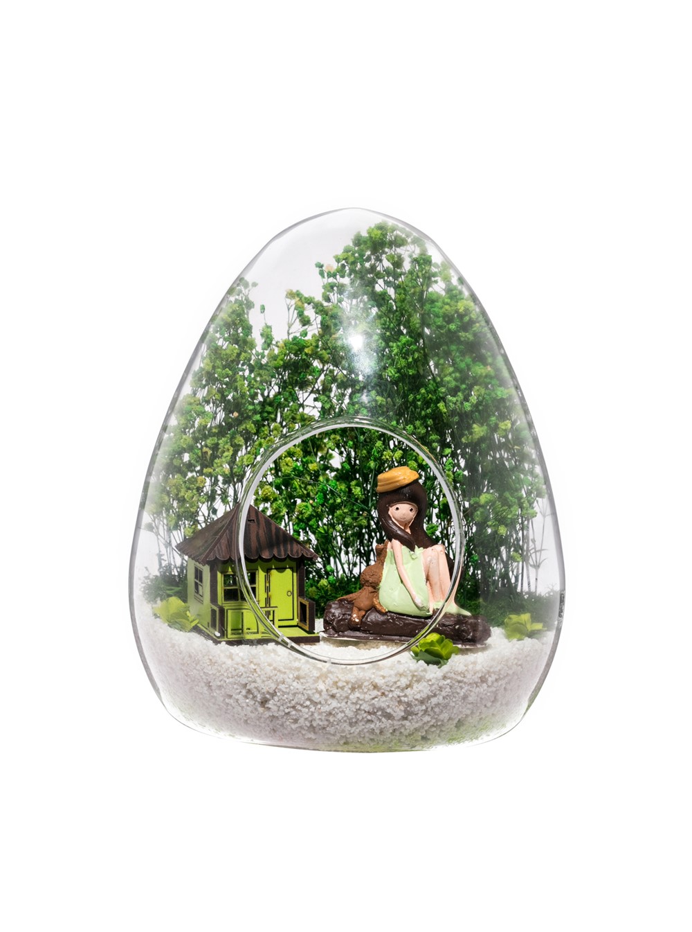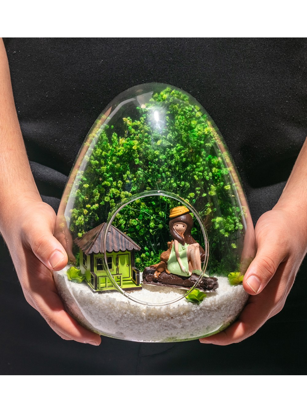 Küçük boy yumurta cam fanus içerisinde tasarladığımız, bu özgün teraryum; beyaz kum, kuru bitkiler, şoklanmış yosunlar, yapay mini güller, bir adet bayan obje ve bir adet yeşil ahşap ev objeleri kullanılarak tamamlanmıştır. Ev ve ofis ortamlarının tamamında sergilenebilir teraryumun içinde, kurutulmuş ve şoklanmış bitkiler olduğundan hava alması önemlidir. Açık olan kısmının kapatılmaması veya büfe vb. kapalı alanlara konulmaması gereklidir. Özellikle her ortamda yıllarca, zevkle izlenebilecek özel bir teraryumdur. Yaklaşık Ölçüleri: 18x22cm NOT: Teraryumlarda kullanılan camlar, üfleme cam işçiliğiyle üretildiğinden bazı detaylarda farklılıklar gözlenebilir. Örneğin, ağız bitiş noktalarının her biri kendine özgüdür.