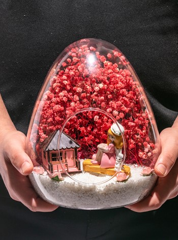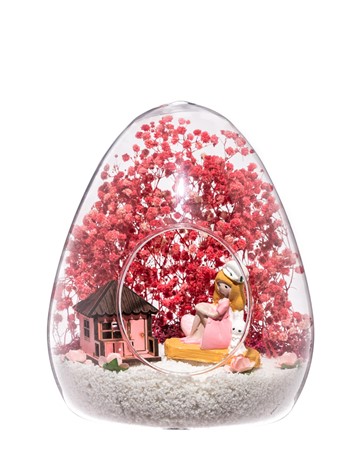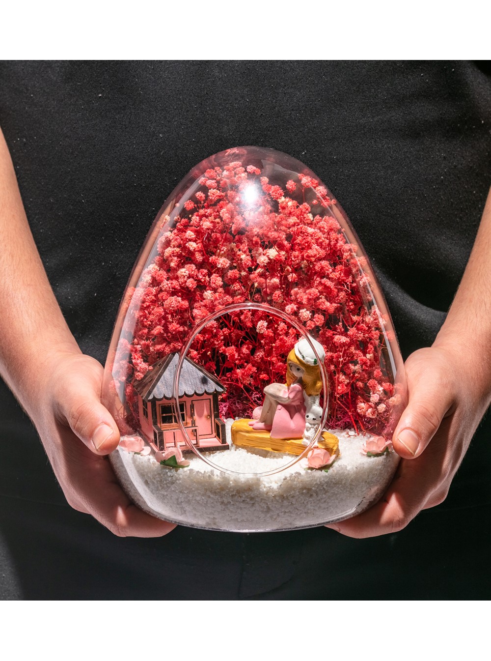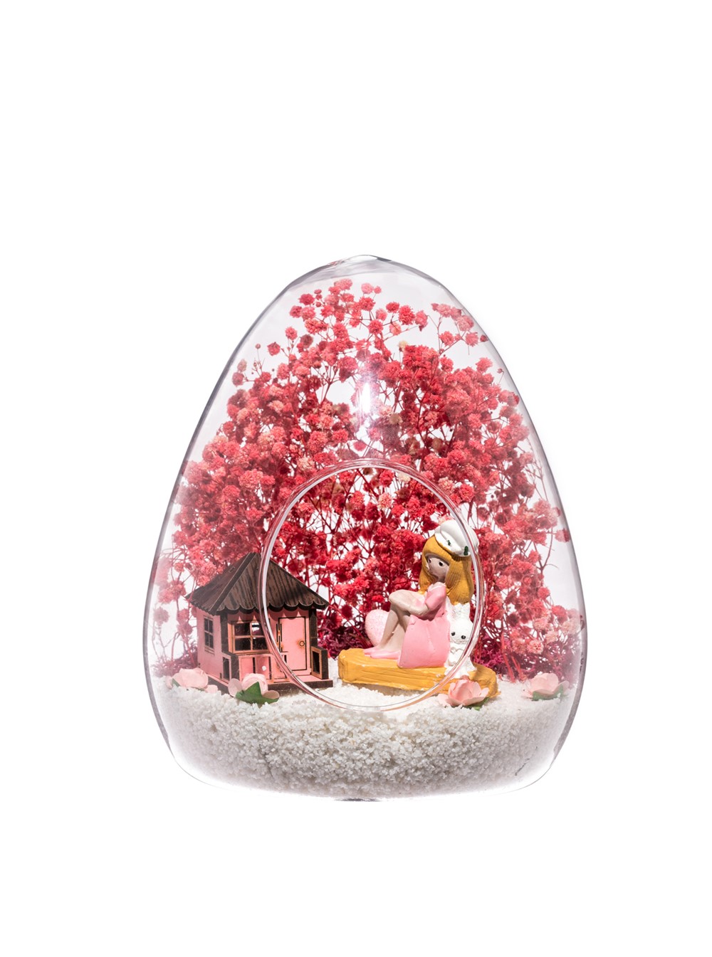 Küçük boy yumurta cam fanus içerisinde tasarladığımız, bu özgün teraryum; beyaz kum, kuru bitkiler, şoklanmış yosunlar, yapay mini güller, bir adet bayan obje ve bir adet pembe ahşap ev objeleri kullanılarak tamamlanmıştır. Ev ve ofis ortamlarının tamamında sergilenebilir teraryumun içinde, kurutulmuş ve şoklanmış bitkiler olduğundan hava alması önemlidir. Açık olan kısmının kapatılmaması veya büfe vb. kapalı alanlara konulmaması gereklidir. Özellikle her ortamda yıllarca, zevkle izlenebilecek özel bir teraryumdur. Yaklaşık Ölçüleri: 18x22cm NOT: Teraryumlarda kullanılan camlar, üfleme cam işçiliğiyle üretildiğinden bazı detaylarda farklılıklar gözlenebilir. Örneğin, ağız bitiş noktalarının her biri kendine özgüdür.