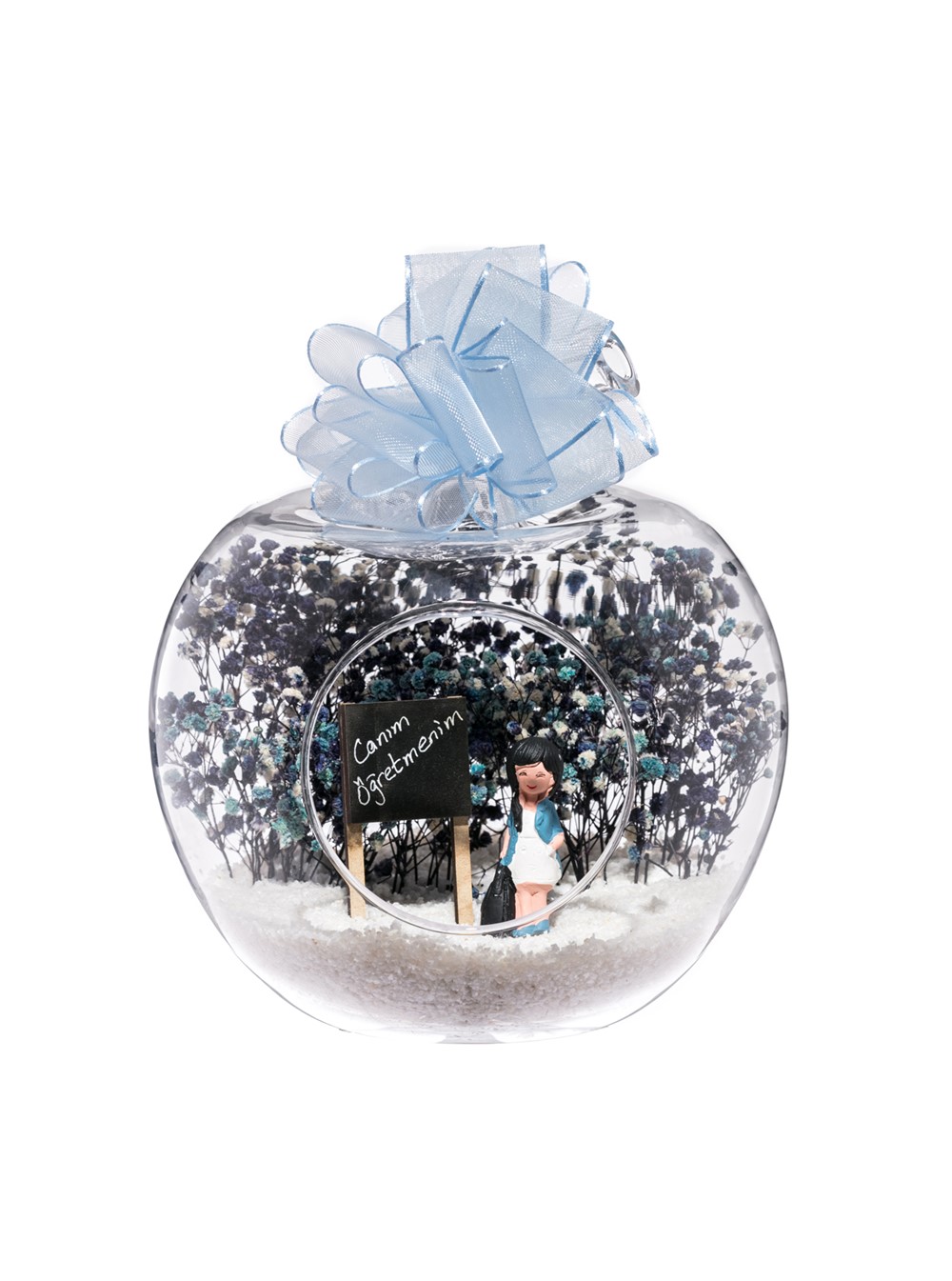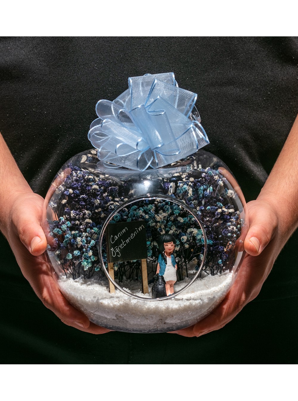 Küçük boy elma cam fanus içerisinde tasarladığımız bu kurdeleli teraryum, sevgili öğretmenlerimizi, gördükleri anda mutlu edecek şekilde tasarlandı. Tasarımımız; beyaz kum, kurutulmuş bitkilerle beraber bir adet CANIM ÖĞRETMENİM yazılı kara tahta görseli ve bir adet bayan objeyle tamamlanmıştır. Ev ve ofis ortamlarının tamamında sergilenebilir teraryumun içinde, kurutulmuş bitkiler bulunduğundan hava alması önemlidir. Açık olan kısmının kapatılmaması veya büfe vb. kapalı alanlara konulmaması gereklidir.. Özellikle her ortamda, zevkle izlenebilecek çok özel bir teraryumdur. Yaklaşık Ölçüleri: 20x20cm NOT: Teraryumlarda kullanılan camlar, üfleme cam işçiliğiyle üretildiğinden bazı detaylarda farklılıklar gözlenebilir. Örneğin, sap kısmı ve ağız bitiş noktalarının her biri kendine özgüdür.