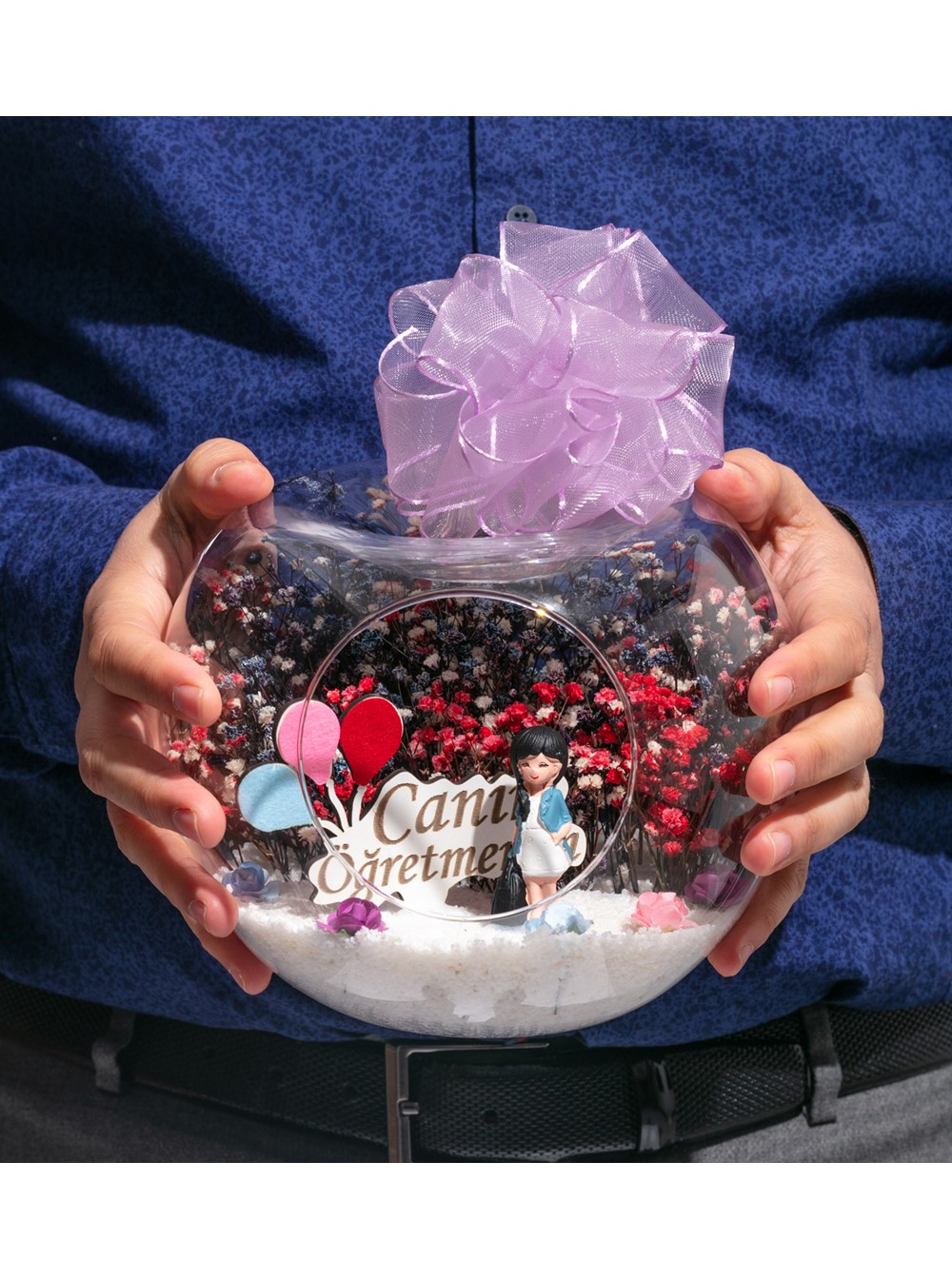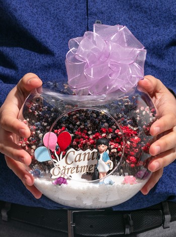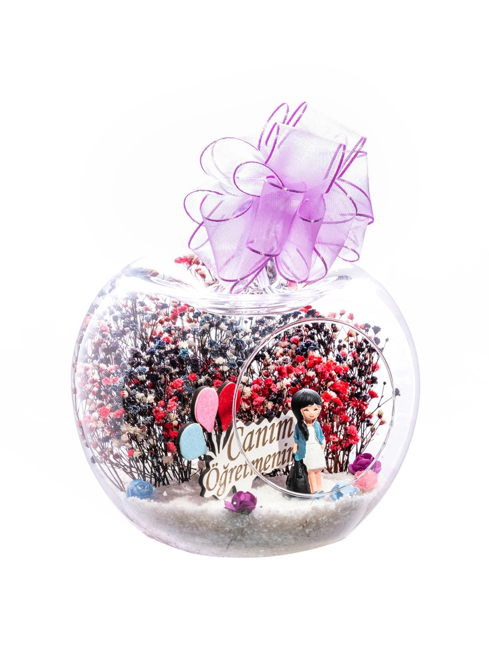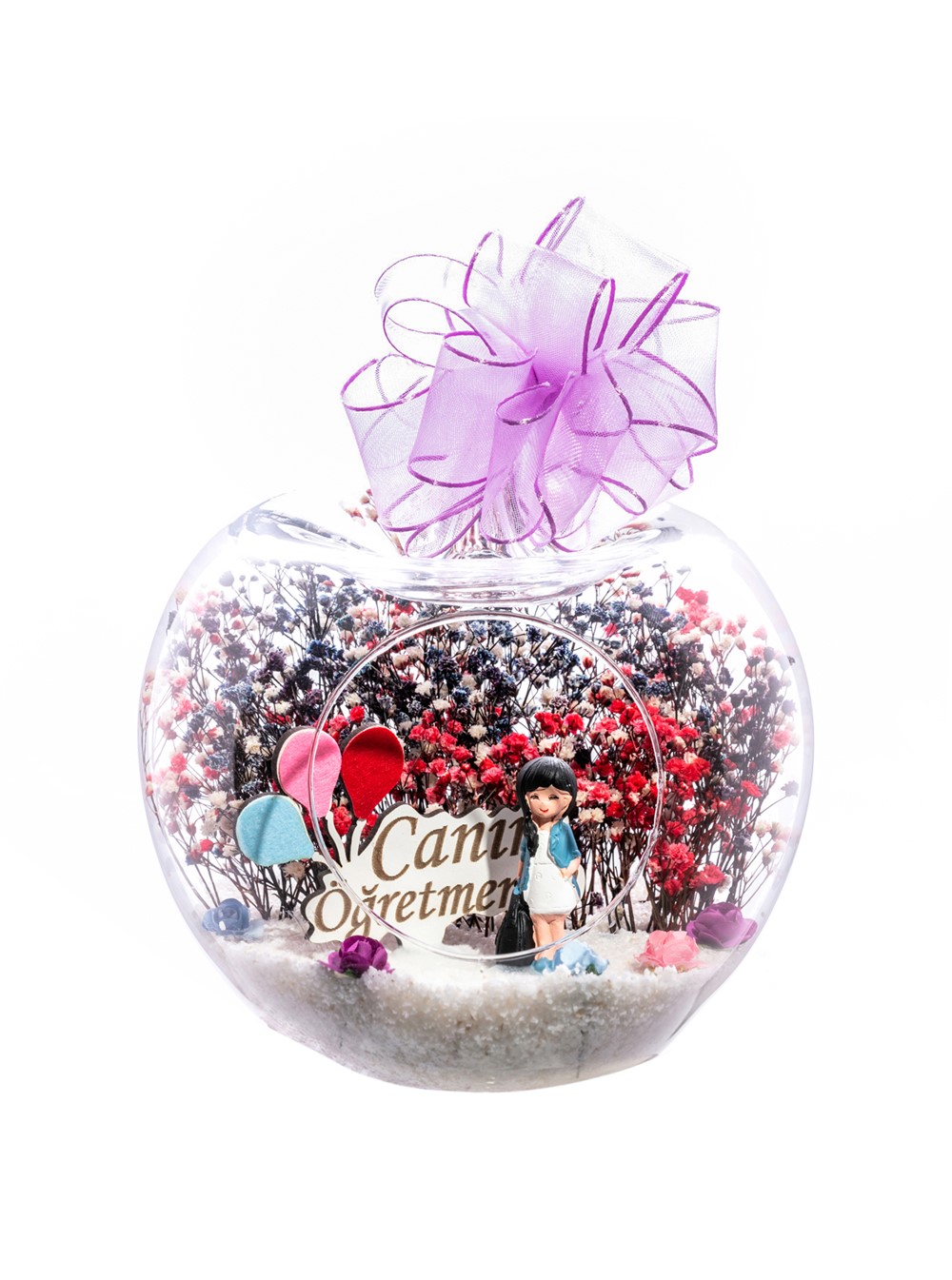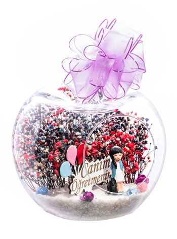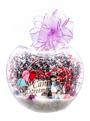 Küçük boy elma cam fanus içerisinde tasarladığımız bu kurdeleli güzel teraryum; beyaz kum, karışık renkli kurutulmuş bitkiler, renkli yapay mini güller, bir adet ahşap canım öğretmenim yazılı balonlu tabela ve bir adet esmer genç kadını simgeleyen objeler kullanılarak tamamlanmıştır. Ev ve ofis ortamlarının tamamında sergilenebilir teraryumun içinde, kurutulmuş bitkiler bulunduğundan hava alması önemlidir. Açık olan kısmının kapatılmaması veya büfe vb. kapalı alanlara konulmaması gereklidir. Özellikle her ortamda yıllarca, zevkle izlenebilecek özel bir teraryumdur. Yaklaşık Ölçüleri: 20x20cm NOT: Teraryumlarda kullanılan camlar, üfleme cam işçiliğiyle üretildiğinden bazı detaylarda farklılıklar gözlenebilir. Örneğin, sap kısmı ve ağız bitiş noktalarının her biri kendine özgüdür.