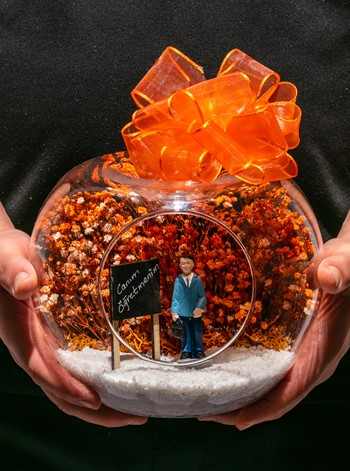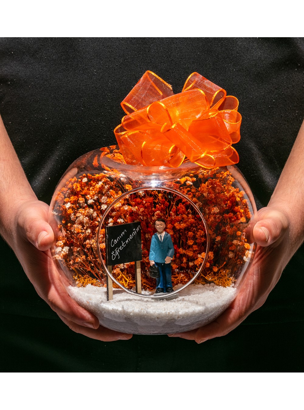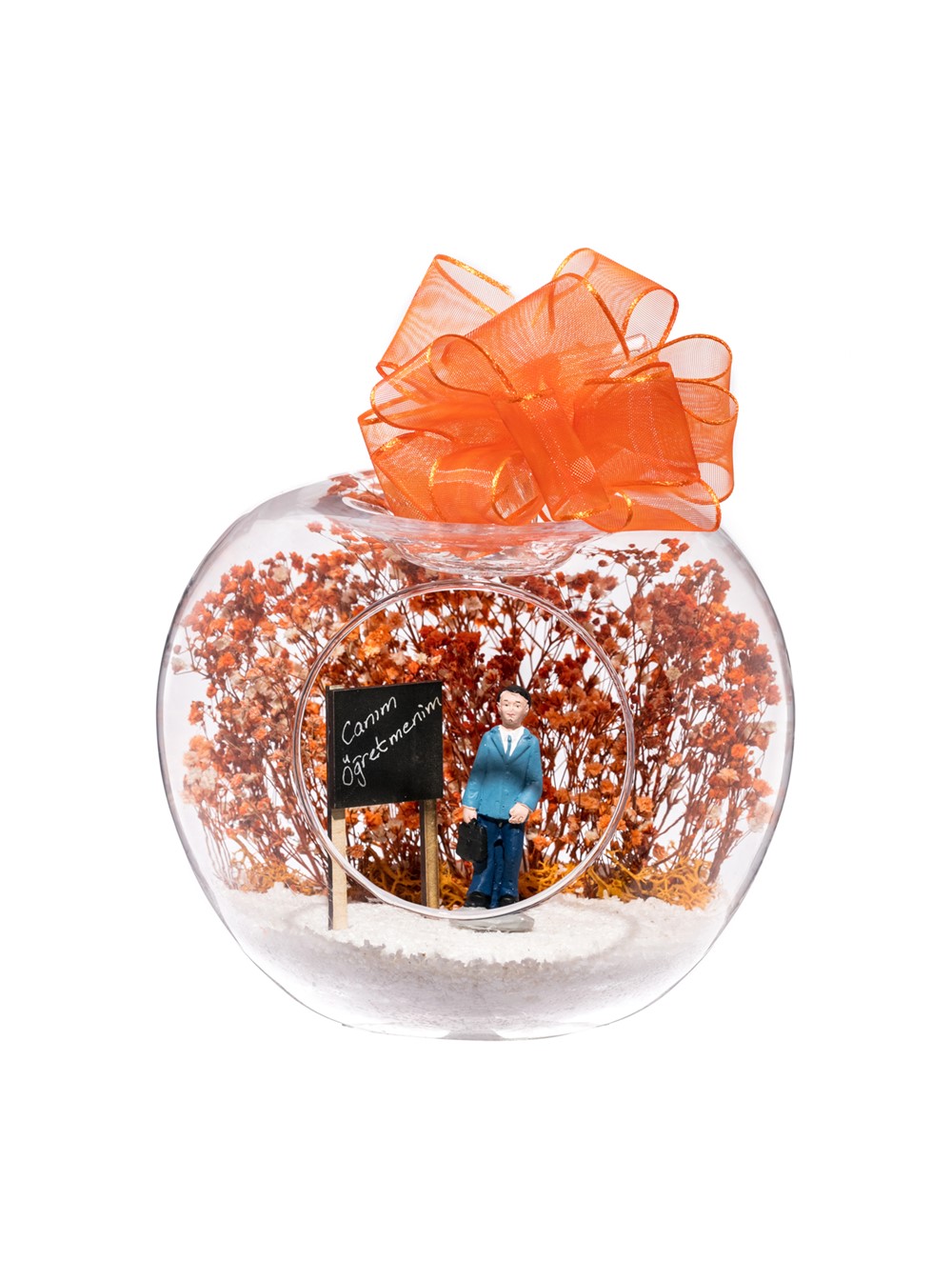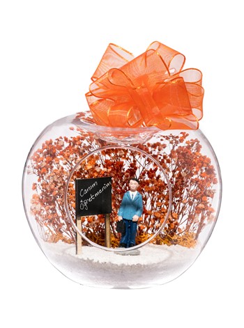 Küçük boy elma cam fanus içerisinde tasarladığımız bu kurdeleli teraryum, sevgili öğretmenlerimizi, gördükleri anda mutlu edecek şekilde tasarlandı. Tasarımımız; beyaz kum, kurutulmuş bitkilerle beraber bir adet CANIM ÖĞRETMENİM yazılı kara tahta görseli ve bir adet erkek objeyle tamamlanmıştır. Ev ve ofis ortamlarının tamamında sergilenebilir teraryumun içinde, kurutulmuş bitkiler bulunduğundan hava alması önemlidir. Açık olan kısmının kapatılmaması veya büfe vb. kapalı alanlara konulmaması gereklidir. Özellikle her ortamda, zevkle izlenebilecek çok özel bir teraryumdur. Yaklaşık Ölçüleri: 20x20cm NOT: Teraryumlarda kullanılan camlar, üfleme cam işçiliğiyle üretildiğinden bazı detaylarda farklılıklar gözlenebilir. Örneğin, sap kısmı ve ağız bitiş noktalarının her biri kendine özgüdür.