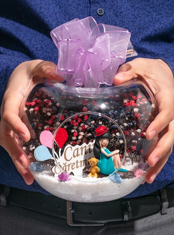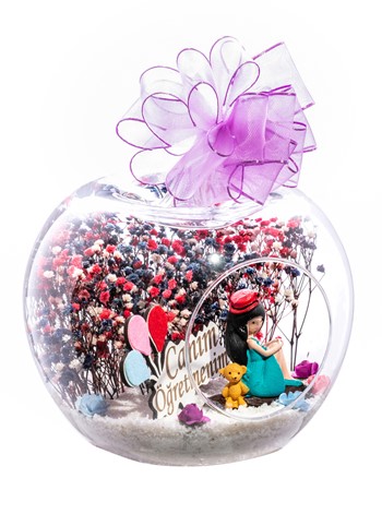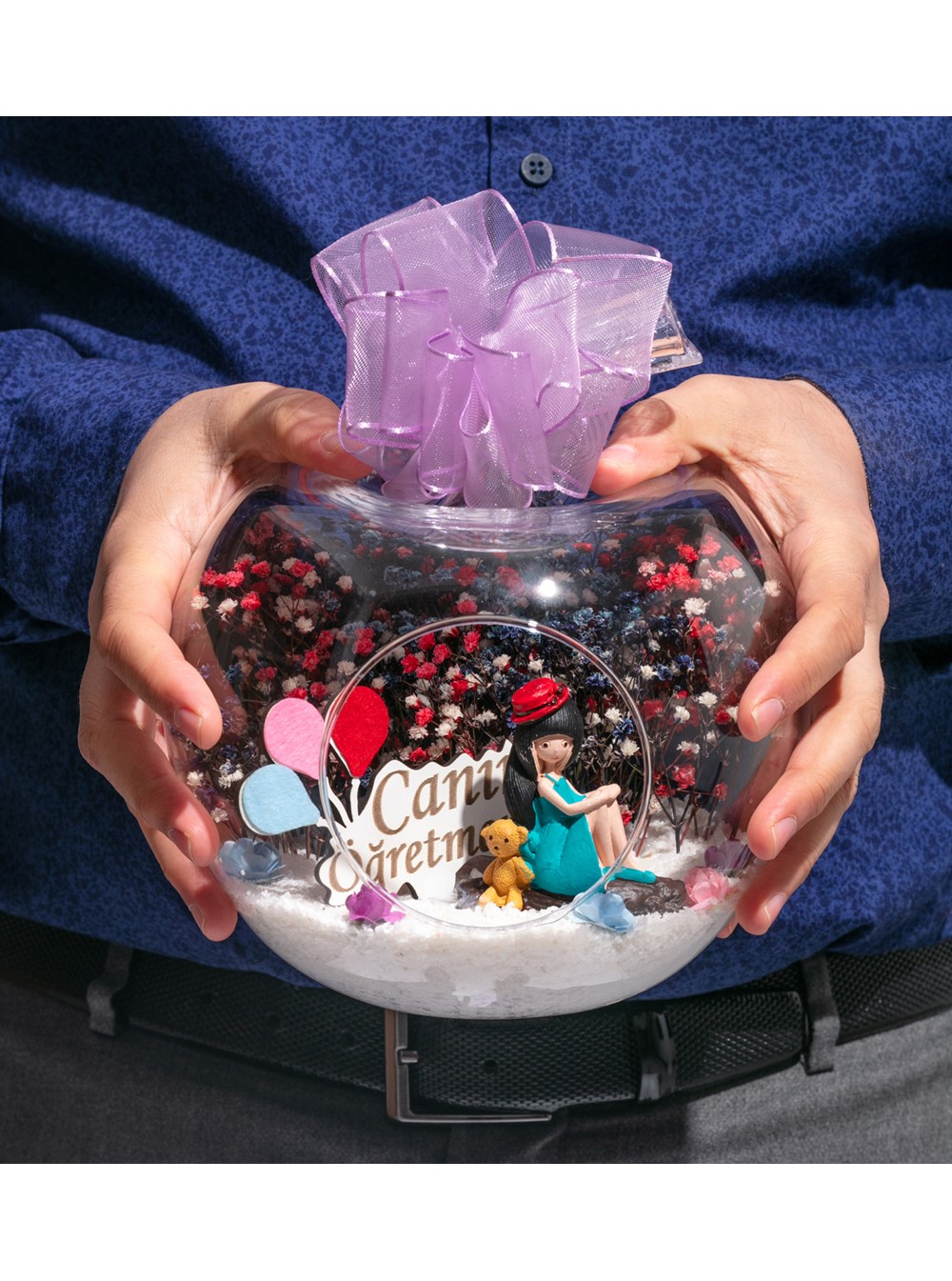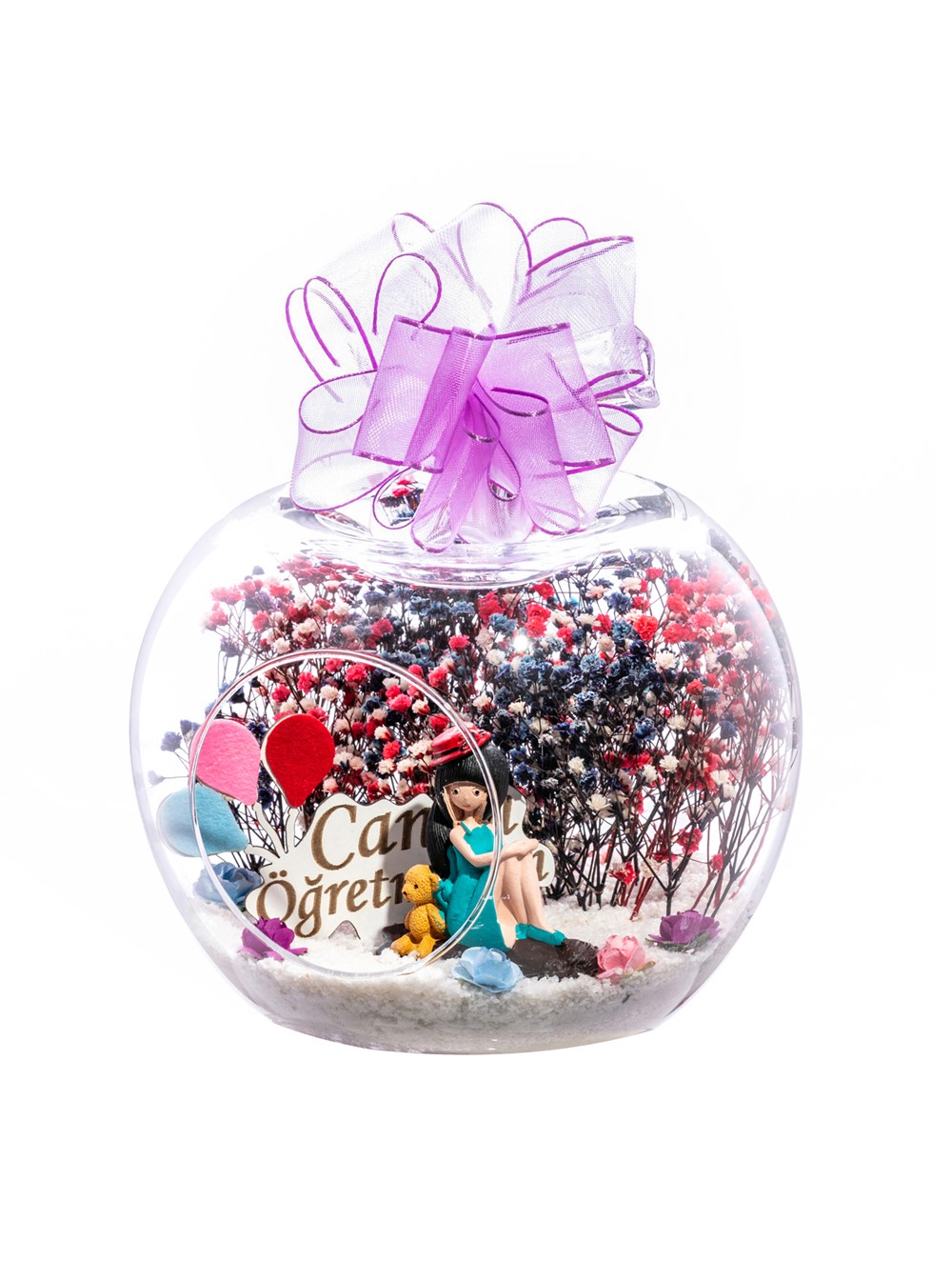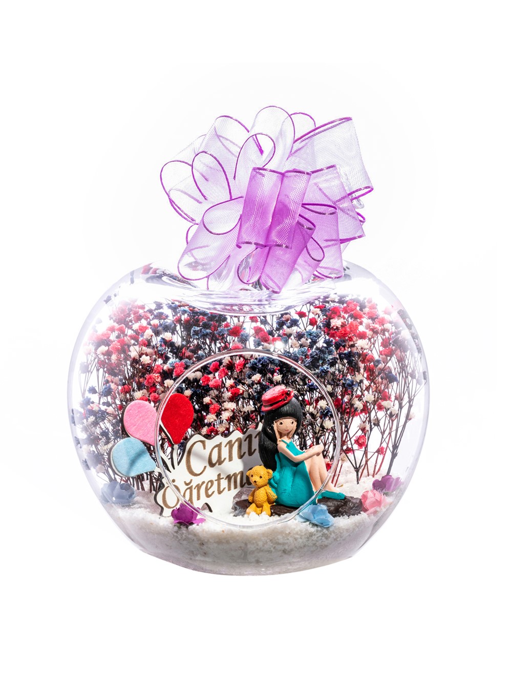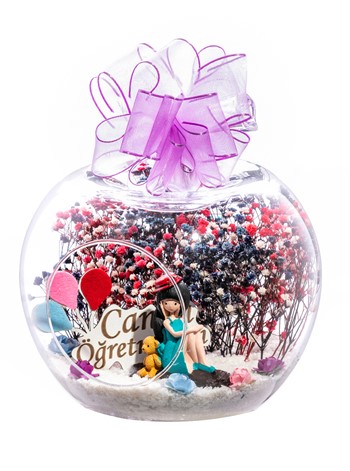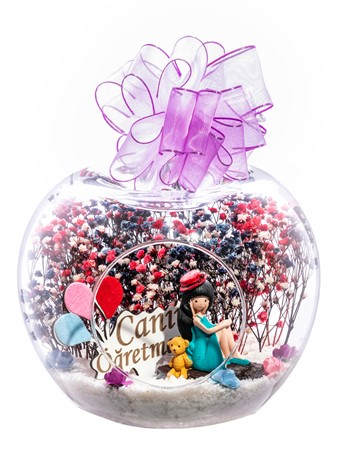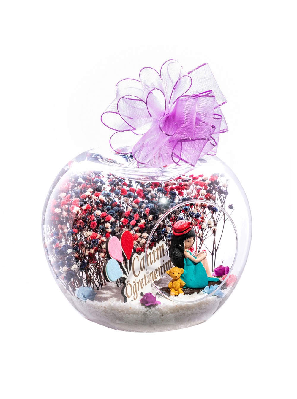 Küçük boy elma cam fanus içerisinde tasarladığımız bu kurdeleli güzel teraryum; beyaz kum, karışık renkli kurutulmuş bitkiler, renkli yapay mini güller, bir adet ahşap canım öğretmenim yazılı balonlu tabela ve bir adet esmer genç kadını simgeleyen objeler kullanılarak tamamlanmıştır. Ev ve ofis ortamlarının tamamında sergilenebilir teraryumun içinde, kurutulmuş bitkiler bulunduğundan hava alması önemlidir. Açık olan kısmının kapatılmaması veya büfe vb. kapalı alanlara konulmaması gereklidir. Özellikle her ortamda yıllarca, zevkle izlenebilecek özel bir teraryumdur. Yaklaşık Ölçüleri: 20x20cm NOT: Teraryumlarda kullanılan camlar, üfleme cam işçiliğiyle üretildiğinden bazı detaylarda farklılıklar gözlenebilir. Örneğin, sap kısmı ve ağız bitiş noktalarının her biri kendine özgüdür.