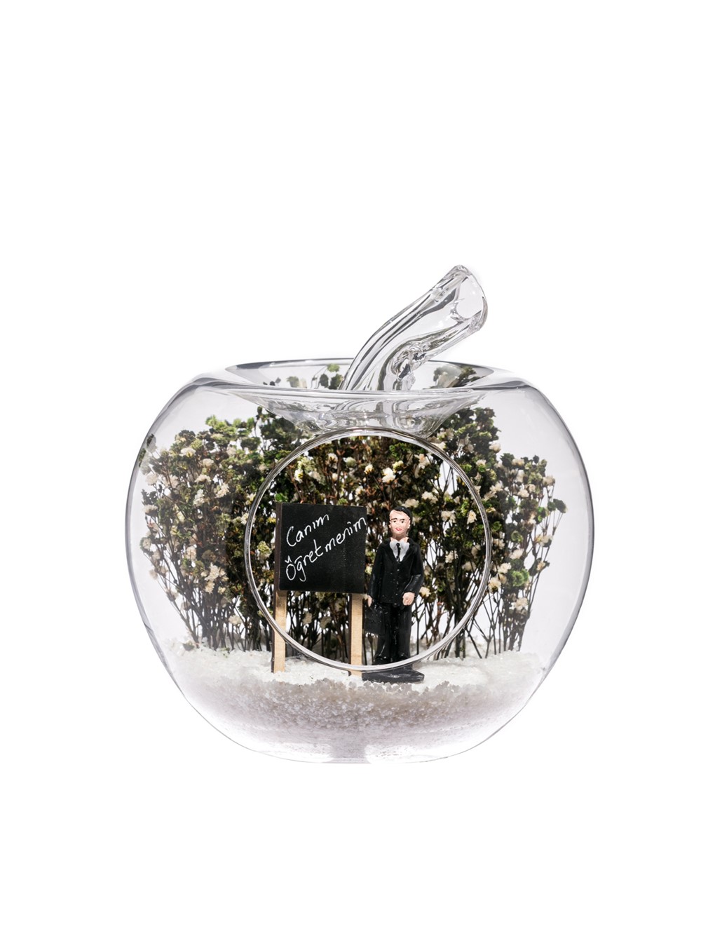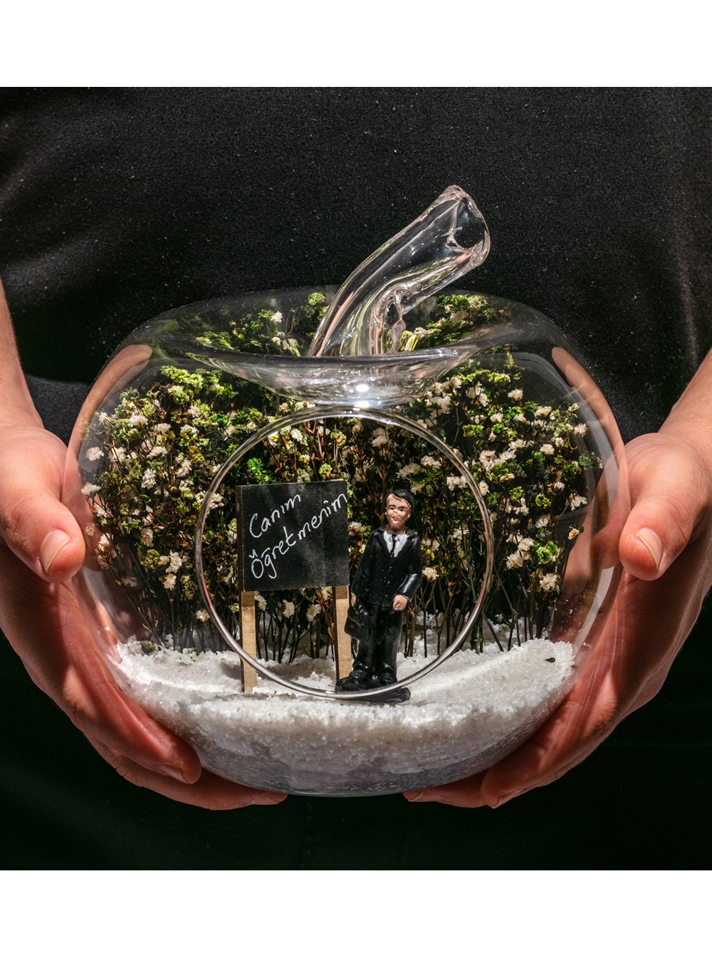 Küçük boy elma cam fanus içerisinde tasarladığımız bu teraryum, sevgili öğretmenlerimizi, gördükleri anda mutlu edecek şekilde tasarlandı. Tasarımımız; beyaz kum, kurutulmuş bitkilerle beraber bir adet CANIM ÖĞRETMENİM yazılı kara tahta görseli ve bir adet erkek objeyle tamamlanmıştır. Ev ve ofis ortamlarının tamamında sergilenebilir teraryumun içinde, kurutulmuş bitkiler bulunduğundan hava alması önemlidir. Açık olan kısmının kapatılmaması veya büfe vb. kapalı alanlara konulmaması gereklidir. Özellikle her ortamda, zevkle izlenebilecek çok özel bir teraryumdur. Yaklaşık Ölçüleri: 20x20cm NOT: Teraryumlarda kullanılan camlar, üfleme cam işçiliğiyle üretildiğinden bazı detaylarda farklılıklar gözlenebilir. Örneğin, sap kısmı ve ağız bitiş noktalarının her biri kendine özgüdür.