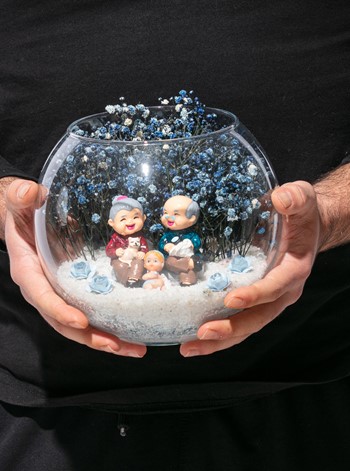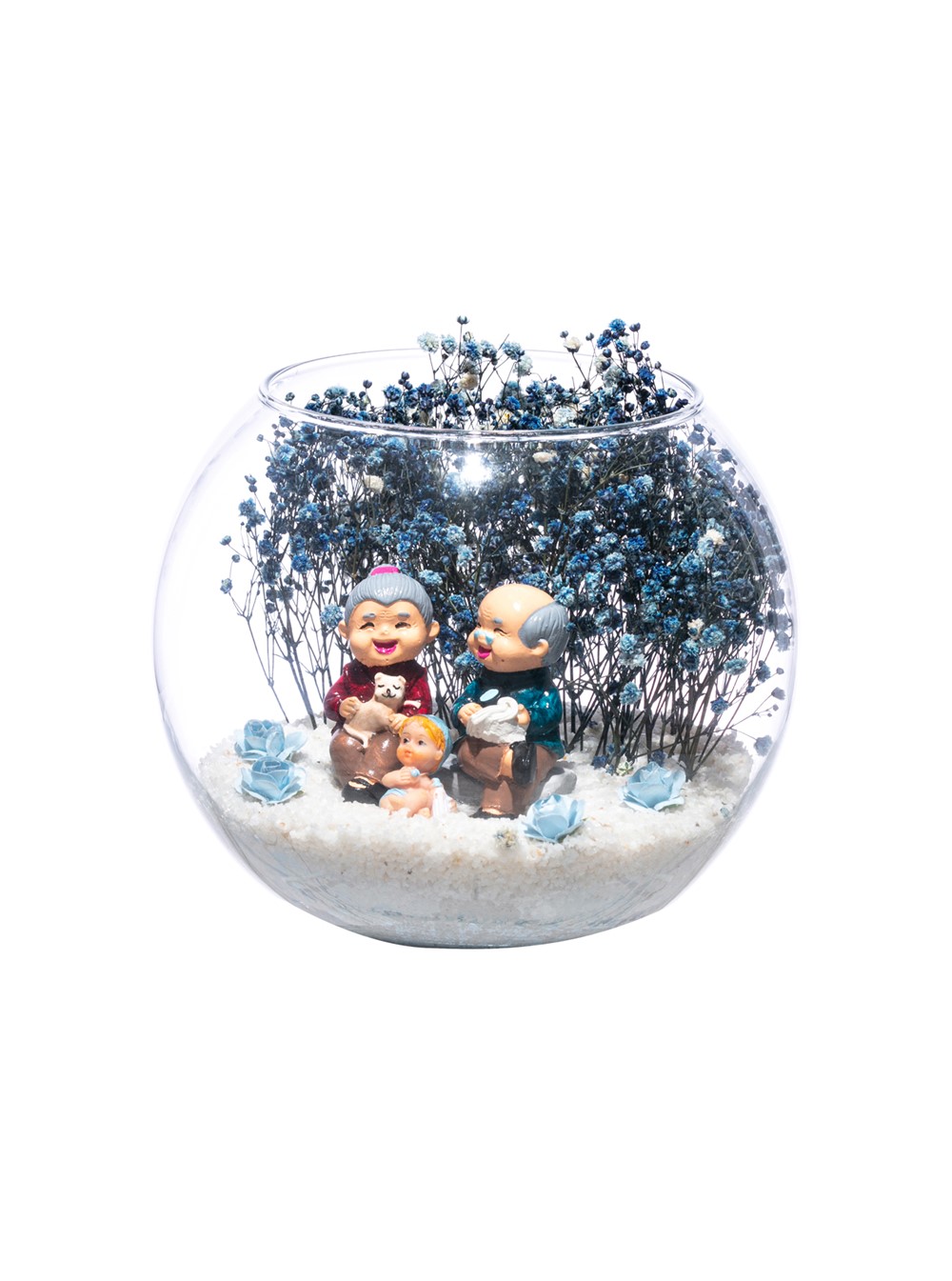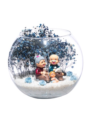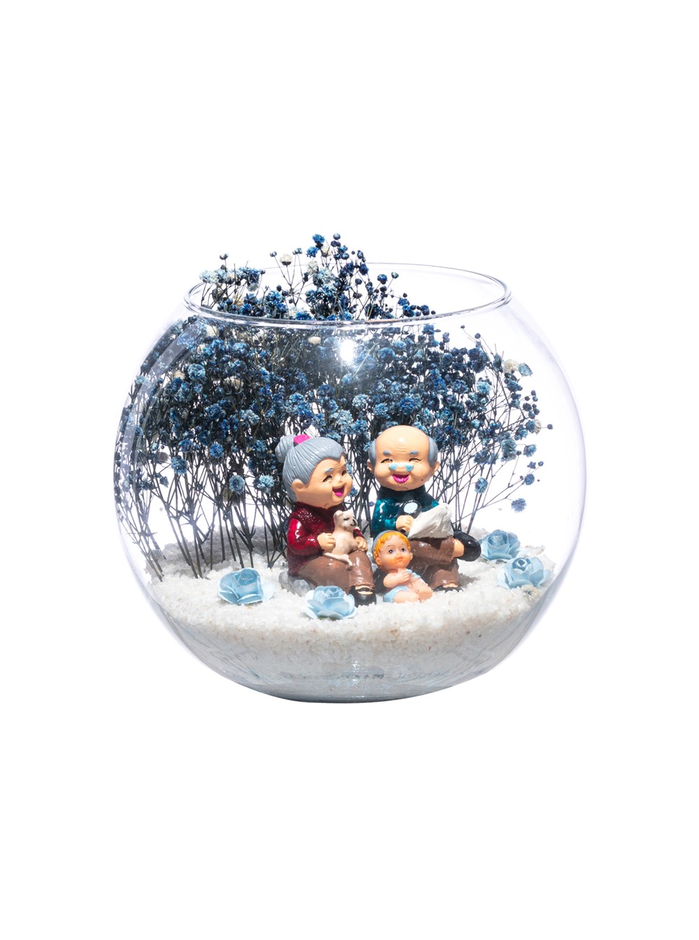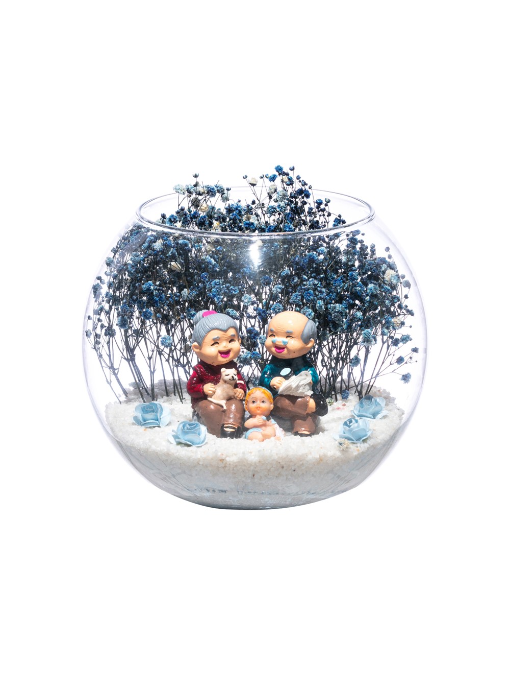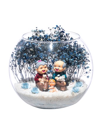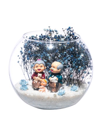Küçük boy, Paşabahçe cam fanus içerisinde tasarladığımız bu anlamlı teraryum; beyaz kum, kurutulmuş bitkiler, yapay güller, bir adet erkek bebek ve bir çift yaşlı insan objeleri kullanılarak tamamlanmıştır. Ev ve ofis ortamlarının tamamında sergilenebilir teraryumun içinde kurutulmuş bitkiler bulunduğundan hava alması önemlidir. Açık olan kısmının kapatılmaması veya büfe vb. kapalı alanlara konulmaması gereklidir. Özellikle her ortamda yıllarca, zevkle izlenebilecek özel bir teraryumdur. Yaklaşık Ölçüleri: 16x18 cm