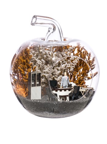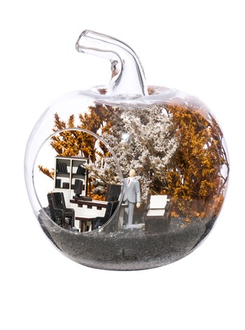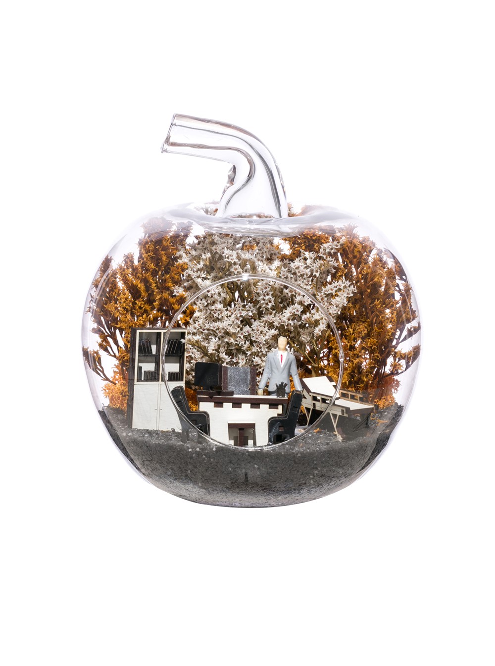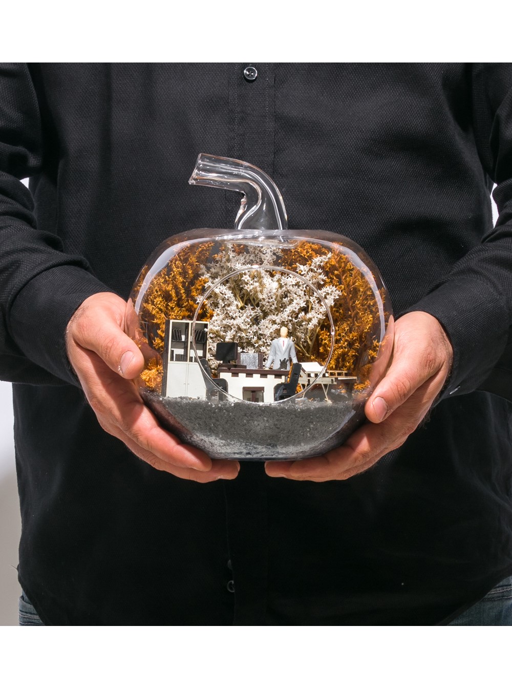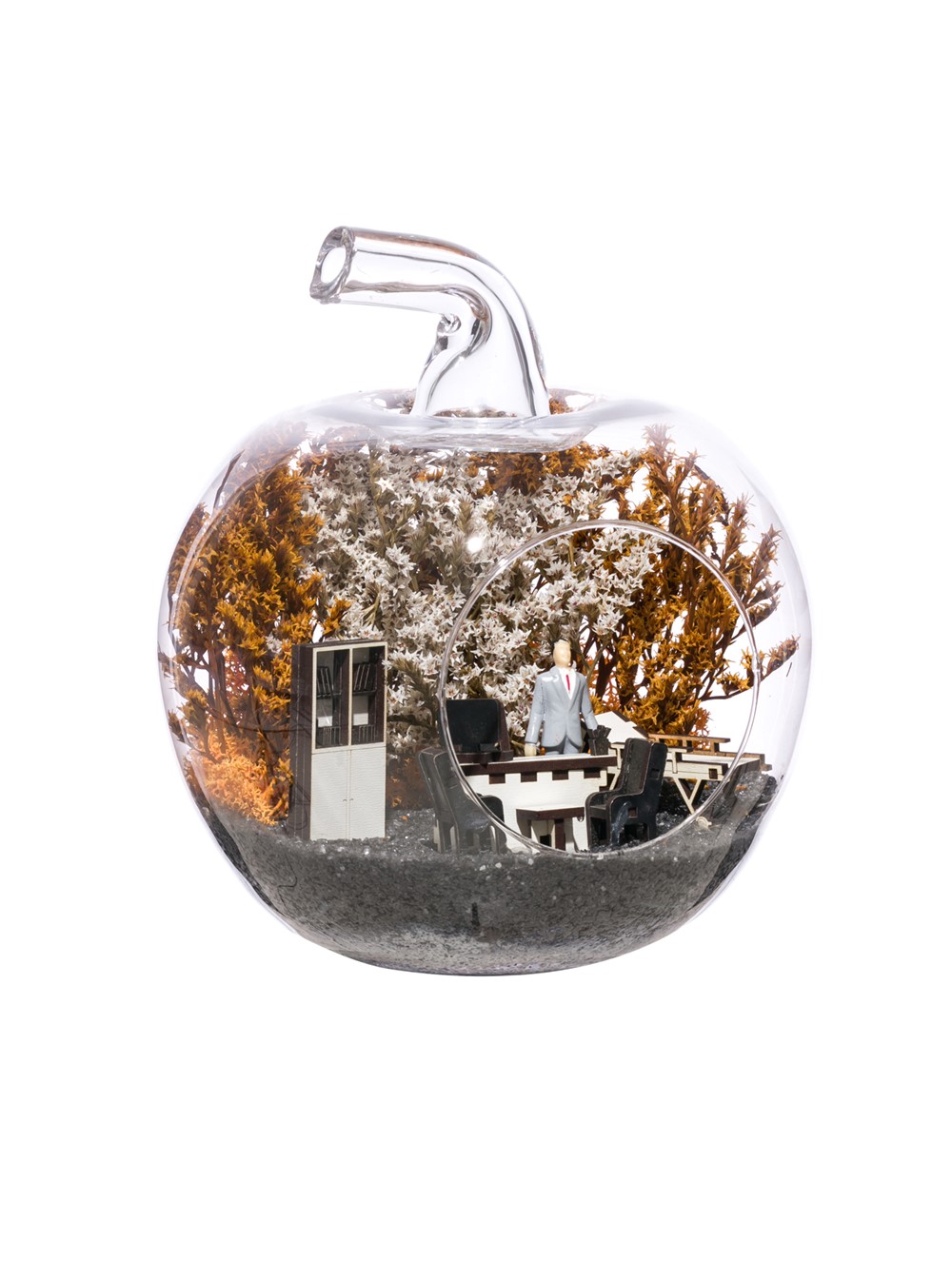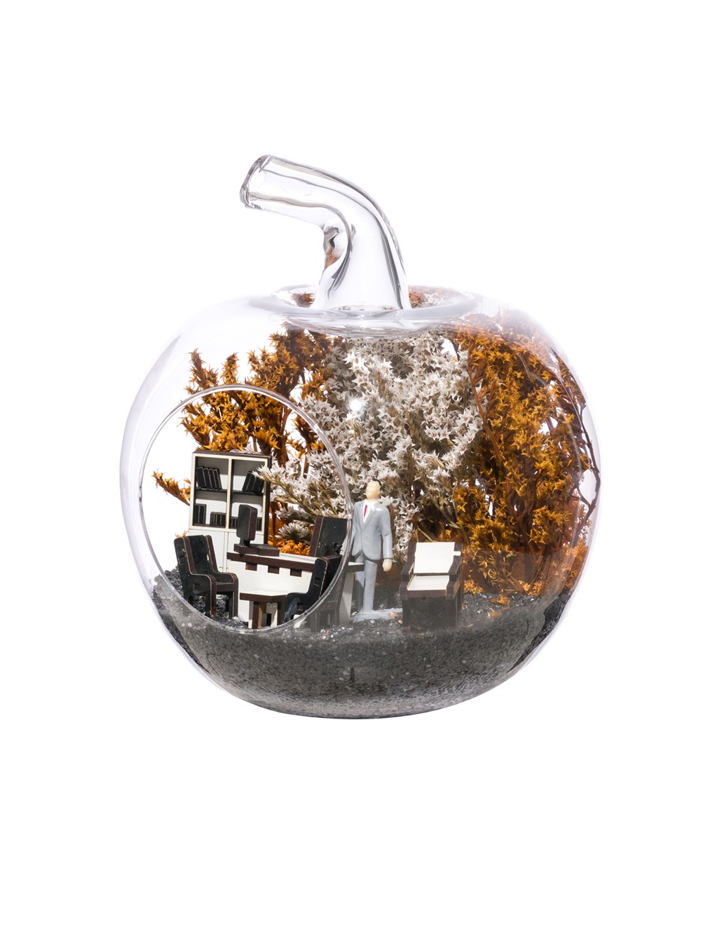 Küçük boy elma cam fanus içerisinde tasarladığımız bu alıcısına özel teraryum; siyah kum, kurutulmuş bitkiler, şoklanmış yosunlar, bir adet erkek obje ve doktor odasını simgeleyen ahşap objelerle tamamlanmıştır. Ev ve ofis ortamlarının tamamında sergilenebilir teraryumun içinde kurutulmuş bitkiler bulunduğundan hava alması önemlidir. Açık olan kısmının kapatılmaması veya büfe vb. kapalı alanlara konulmaması gereklidir. Özellikle her ortamda yıllarca, zevkle izlenebilecek özel bir teraryumdur. Yaklaşık Ölçüleri: 20x20cm NOT: Teraryumlarda kullanılan camlar, üfleme cam işçiliğiyle üretildiğinden bazı detaylarda farklılıklar gözlenebilir. Örneğin, sap kısmı ve ağız bitiş noktalarının her biri kendine özgüdür.