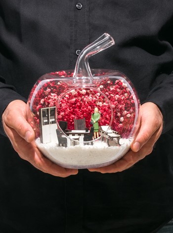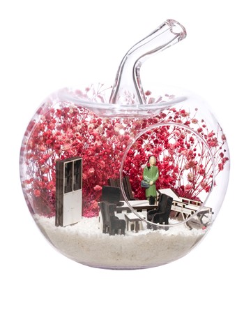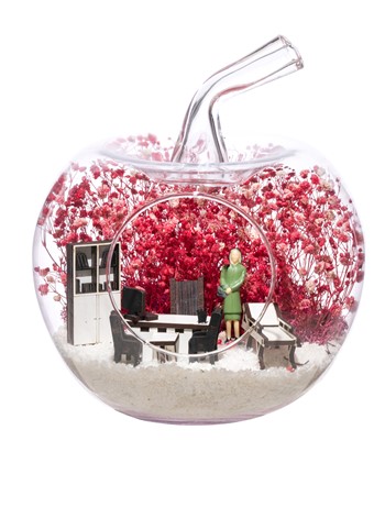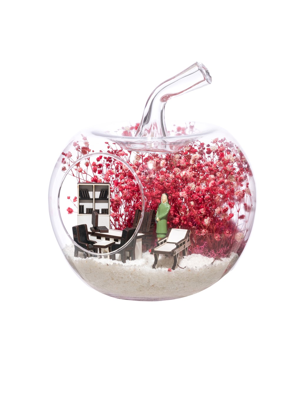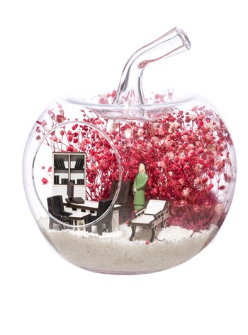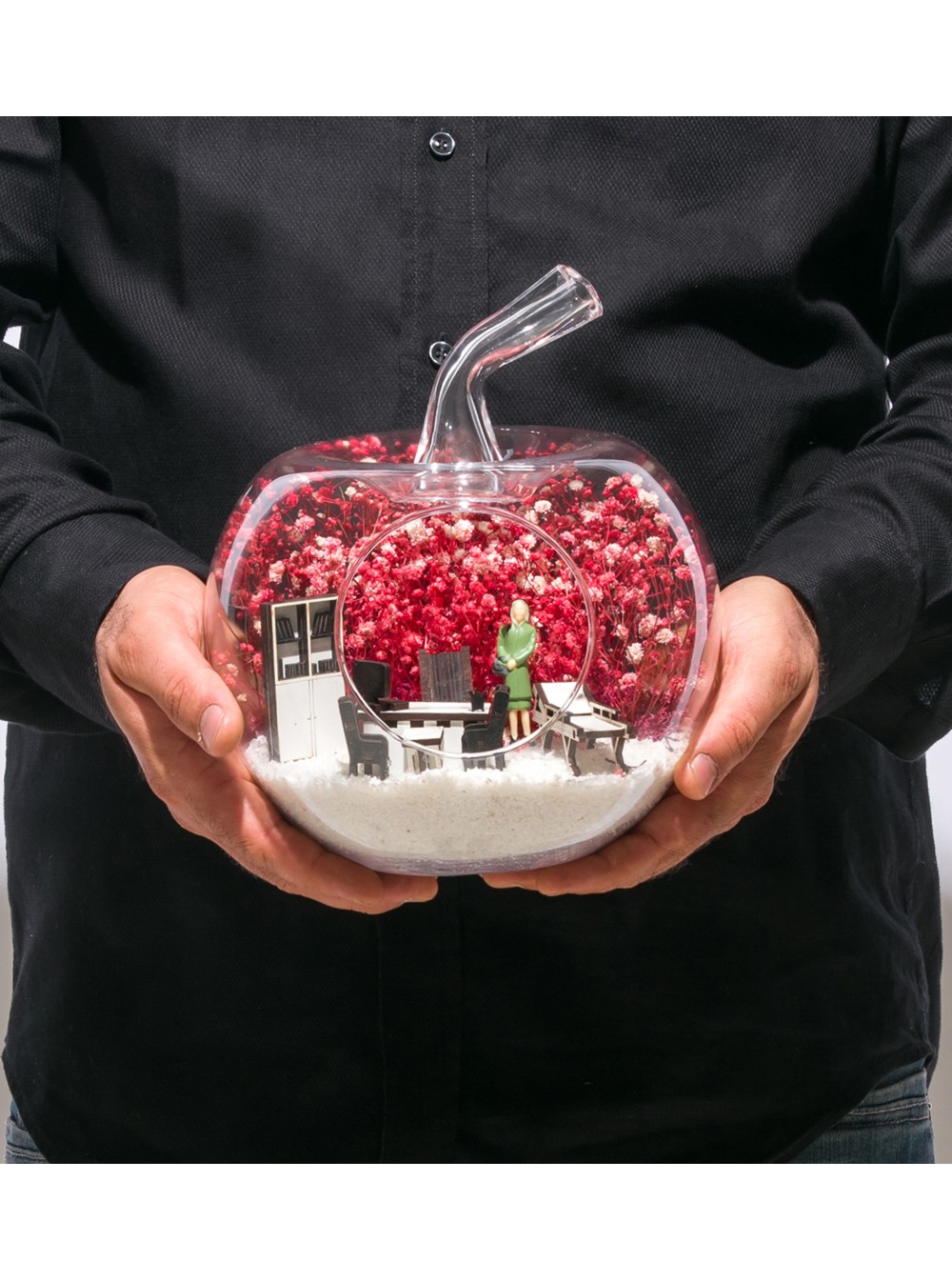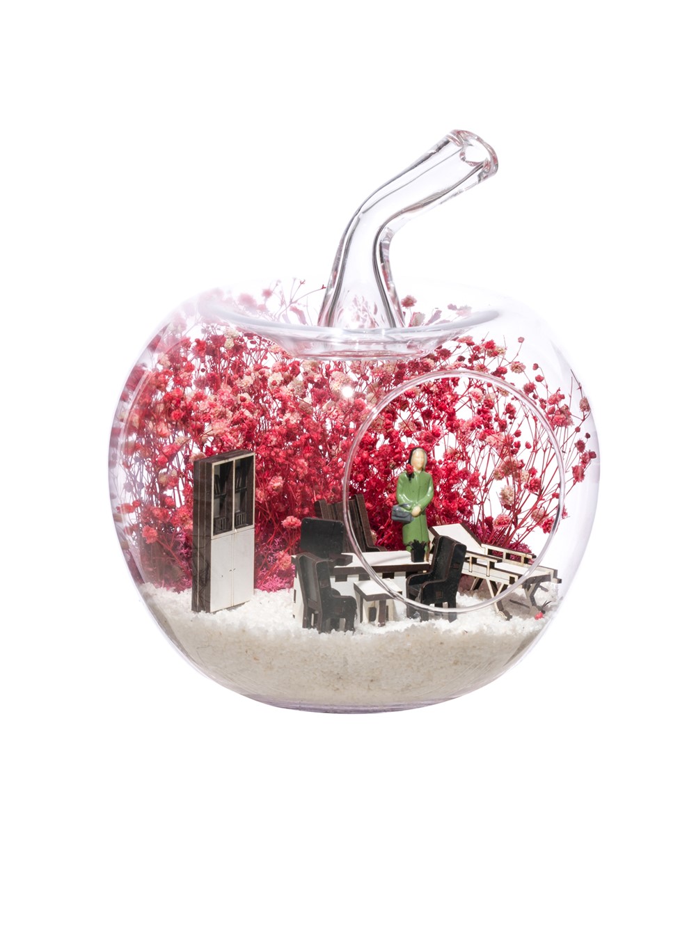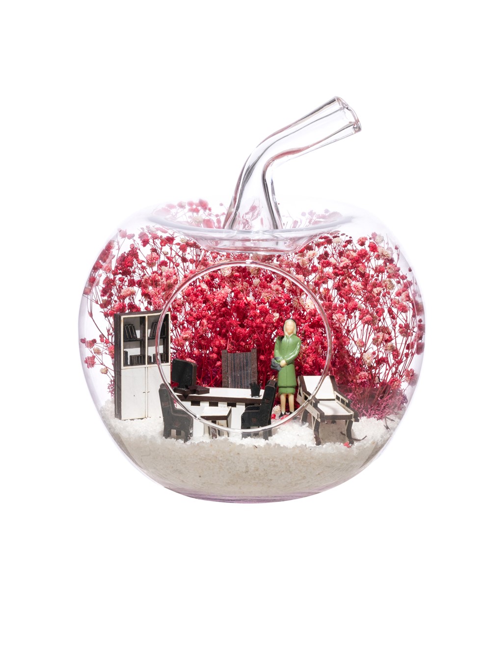 Küçük boy elma cam fanus içerisinde tasarladığımız bu alıcısına özel teraryum; beyaz kum, kurutulmuş bitkiler, şoklanış yosunlar, bir adet kadın obje ve doktor odasını simgeleyen ahşap objelerle tamamlanmıştır. Ev ve ofis ortamlarının tamamında sergilenebilir teraryumun içinde kurutulmuş bitkiler bulunduğundan hava alması önemlidir. Açık olan kısmının kapatılmaması veya büfe vb. kapalı alanlara konulmaması gereklidir. Özellikle her ortamda yıllarca, zevkle izlenebilecek özel bir teraryumdur. Yaklaşık Ölçüleri: 20x20cm NOT: Teraryumlarda kullanılan camlar, üfleme cam işçiliğiyle üretildiğinden bazı detaylarda farklılıklar gözlenebilir. Örneğin, sap kısmı ve ağız bitiş noktalarının her biri kendine özgüdür.