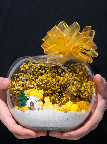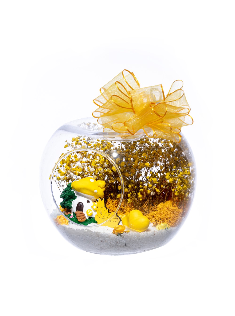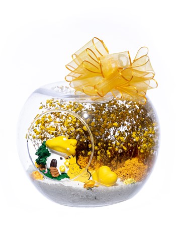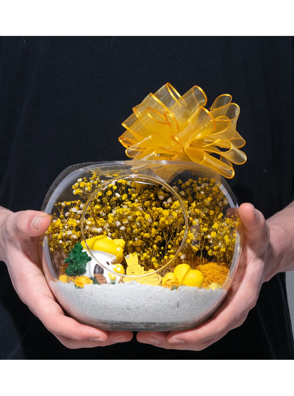 Üzerinde şık kurdelesiyle küçük boy elma cam fanus içerisinde tasarladığımız bu çok güzel teraryum; beyaz kum, şoklanmış yosunlar, kurutulmuş bitkiler, yapay güller, bir adet mantar ev, bir adet çiftli kalp ve bir adet uyuyan bebek obje kullanılarak tamamlanmıştır. Ev ve ofis ortamlarının tamamında sergilenebilir teraryumun içinde, kurutulmuş ve şoklanmış bitkiler bulunduğundan hava alması önemlidir. Açık olan kısmının kapatılmaması veya büfe vb. kapalı alanlara konulmaması gereklidir. Özellikle her ortamda yıllarca, zevkle izlenebilecek özel bir teraryumdur. Yaklaşık Ölçüleri: 20x20cm NOT: Teraryumlarda kullanılan camlar, üfleme cam işçiliğiyle üretildiğinden bazı detaylarda farklılıklar gözlenebilir. Örneğin, sap kısmı ve ağız bitiş noktalarının her biri kendine özgüdür.