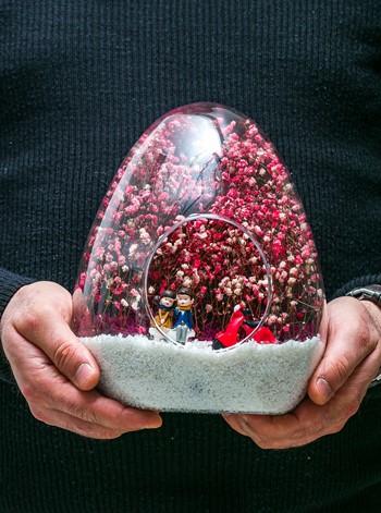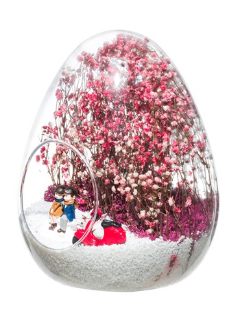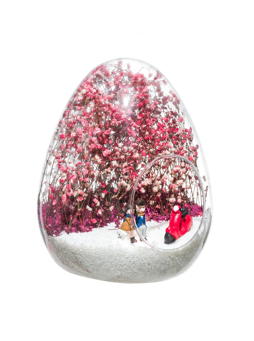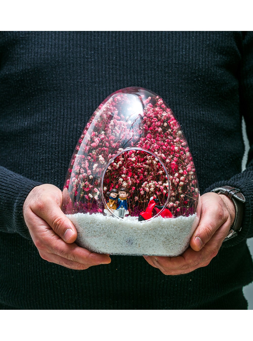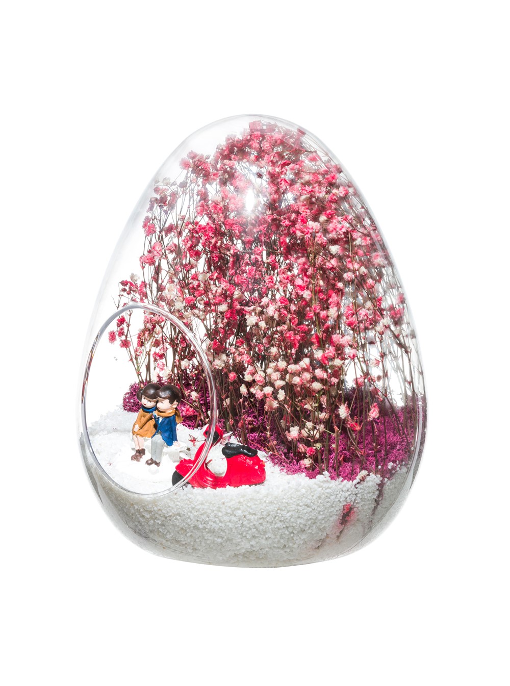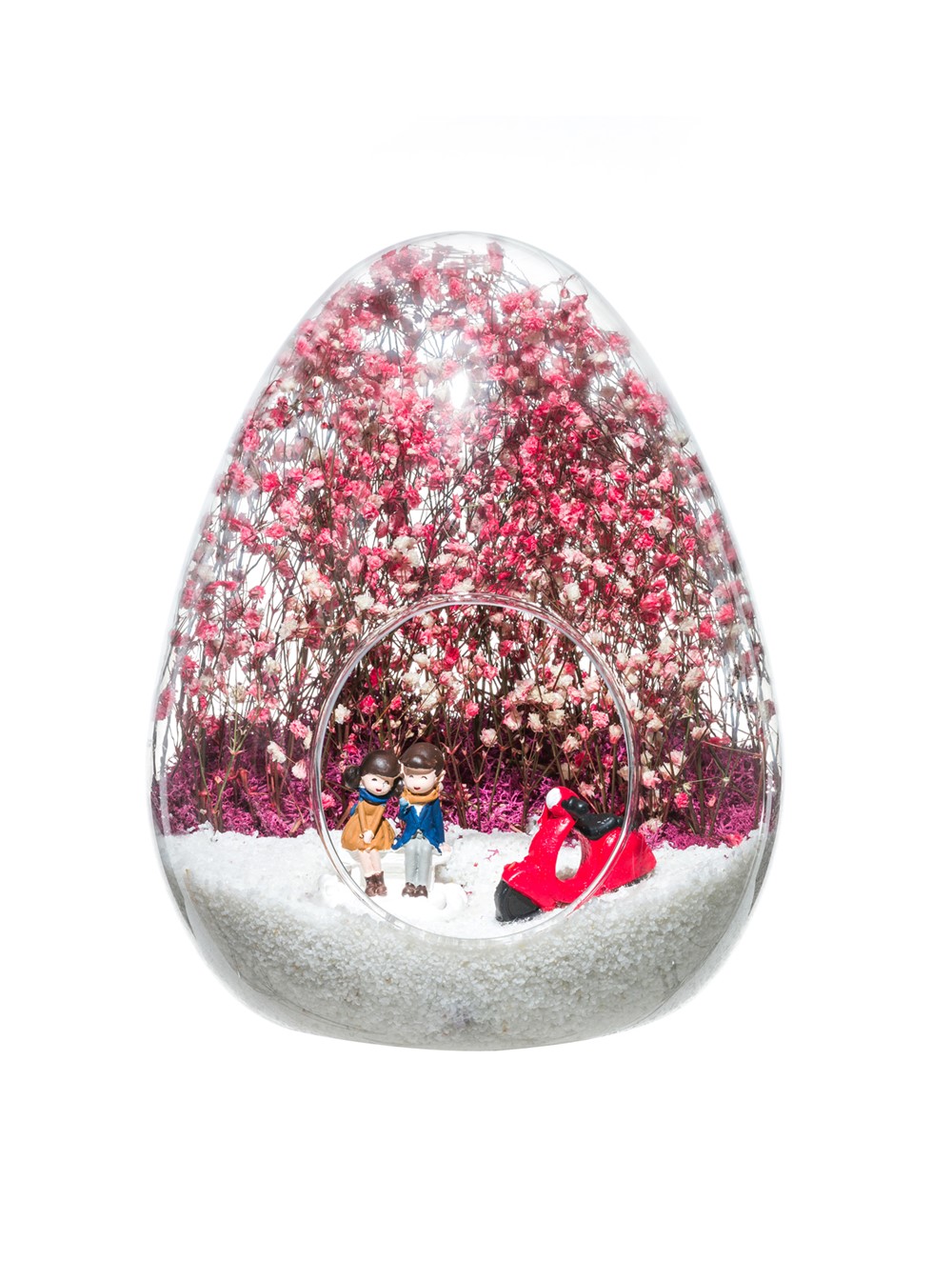 Küçük boy yumurta cam fanus içerisinde tasarladığımız bu güzel teraryum; beyaz kum, kurutulmuş bitkiler, şoklanmış yosunlar, bir adet motorsiklet görseli, bir adet anı paylaşan hanımefendi ve beyefendi görsel objelerle tamamlanmıştır. Ev ve ofis ortamlarının tamamında sergilenebilir teraryumun içinde, kurutulmuş ve şoklanmış bitkiler bulunduğundan hava alması önemlidir. Açık olan kısmının kapatılmaması veya büfe vb. kapalı alanlara konulmaması gereklidir. Özellikle her ortamda yıllarca, zevkle izlenebilecek özel bir teraryumdur. Yaklaşık Ölçüleri: 18x22cm NOT: Teraryumlarda kullanılan camlar, üfleme cam işçiliğiyle üretildiğinden bazı detaylarda farklılıklar gözlenebilir. Örneğin, ağız bitiş noktalarının her biri kendine özgüdür.