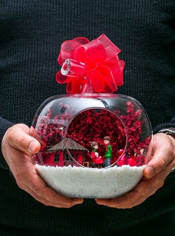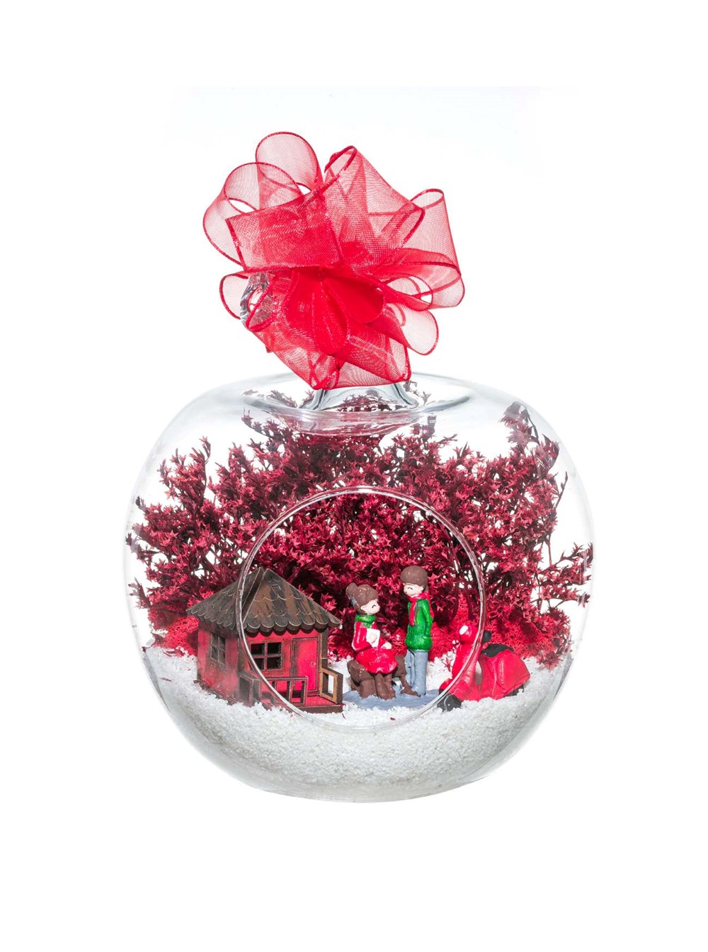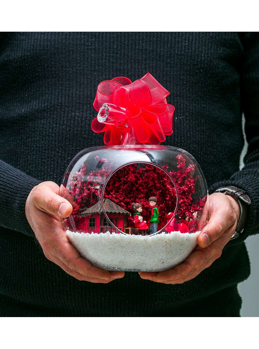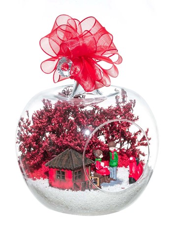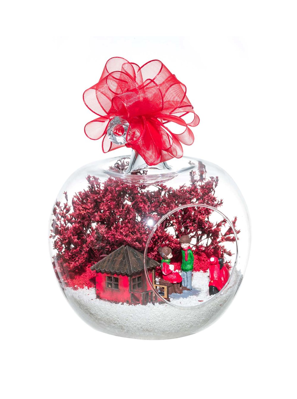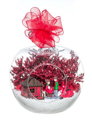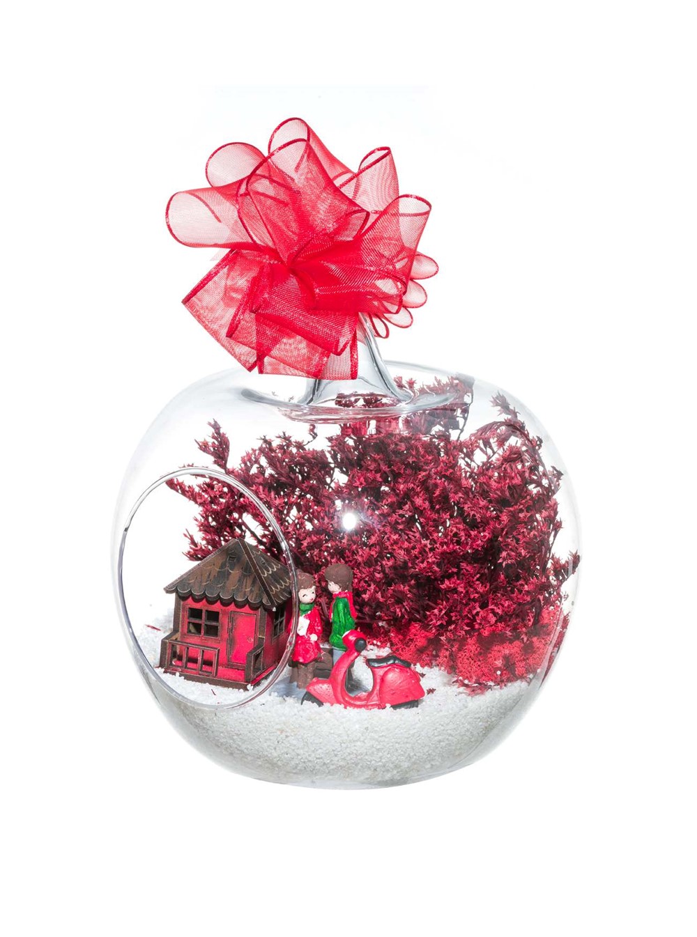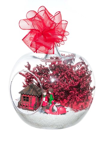 Kurdele takılı küçük boy elma cam fanus içerisinde tasarladığımız bu çok güzel teraryum; beyaz kum, şoklanmış yosunlar, kurutulmuş bitkiler, bir adet scootermotorsiklet, bir adet ahşap kırmızı ev ve bahçelerinde yan yana oturmuş sevgiyle sohbet eden aşıkları simgeleyen objelerle tamamlanmıştır. Ev ve ofis ortamlarının tamamında sergilenebilir teraryumun içinde, kurutulmuş ve şoklanmış bitkiler bulunduğundan hava alması önemlidir. Açık olan kısmının kapatılmaması veya büfe vb. kapalı alanlara konulmaması gereklidir. Özellikle her ortamda yıllarca, zevkle izlenebilecek özel bir teraryumdur. Yaklaşık Ölçüleri: 20x20cm NOT: Teraryumlarda kullanılan camlar, üfleme cam işçiliğiyle üretildiğinden bazı detaylarda farklılıklar gözlenebilir. Örneğin, sap kısmı ve ağız bitiş noktalarının her biri kendine özgüdür.