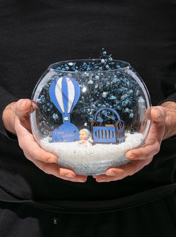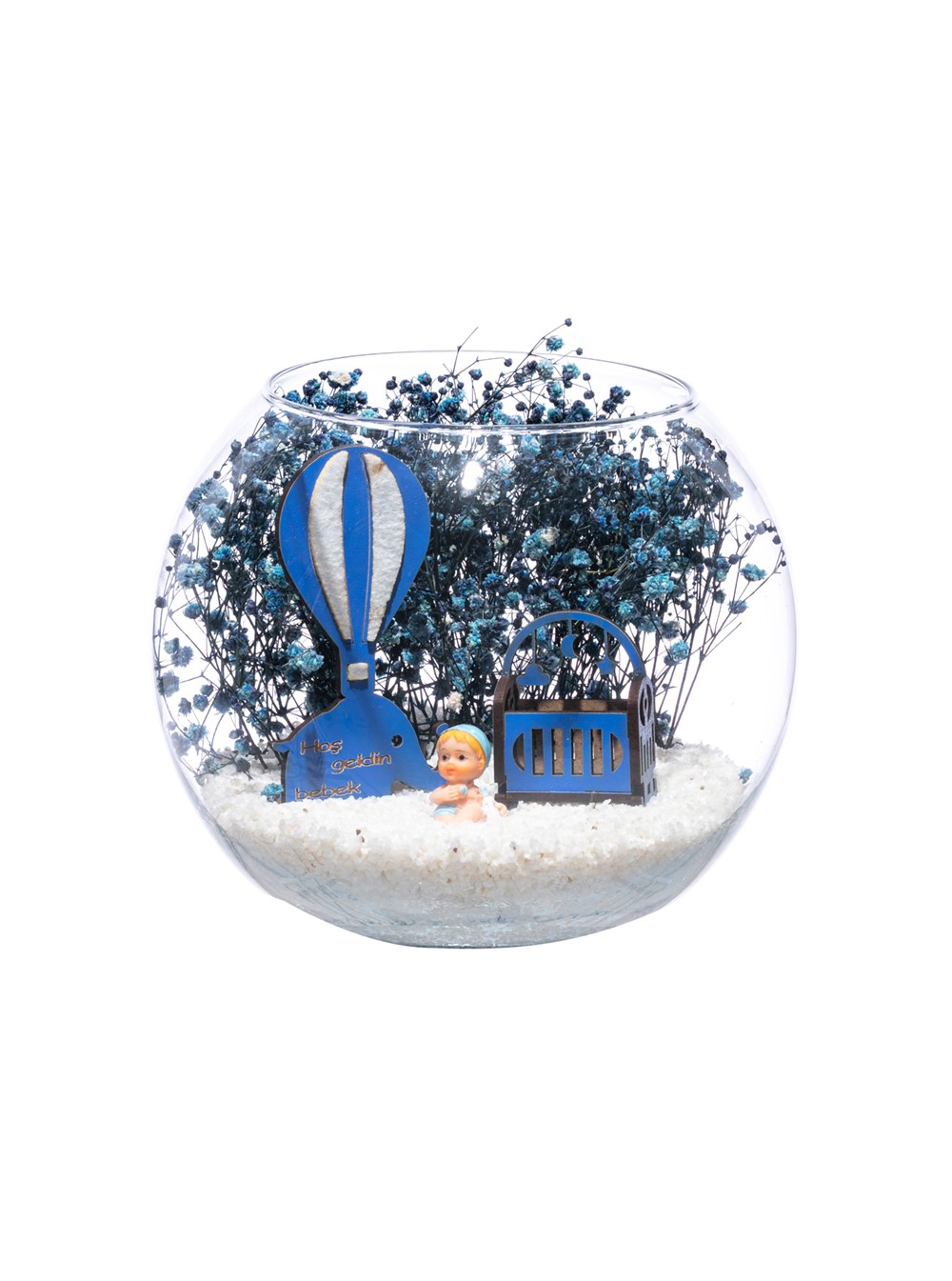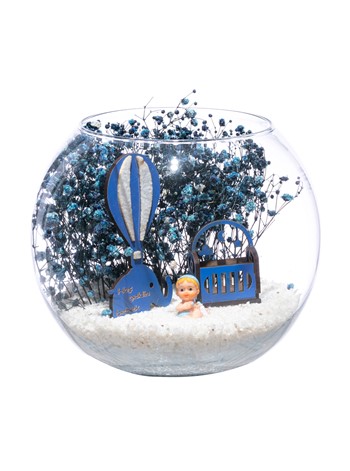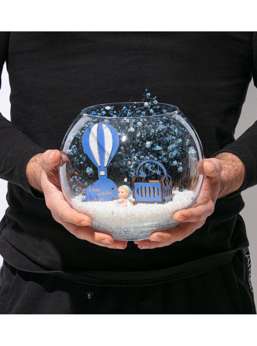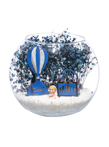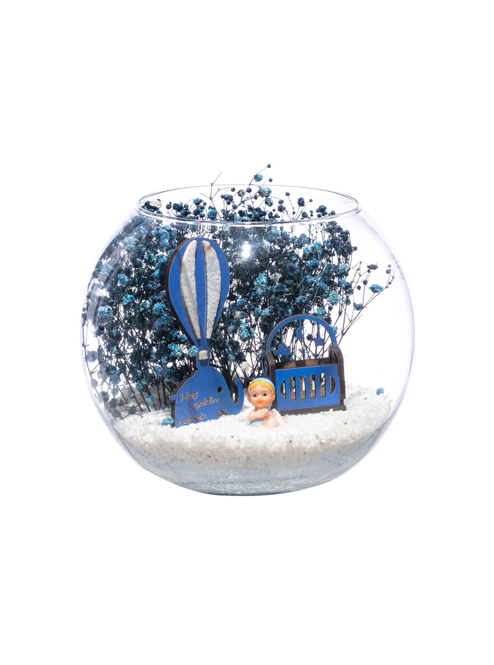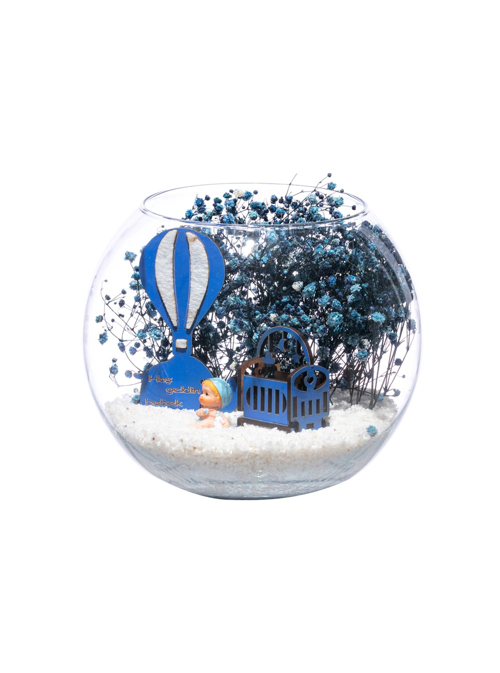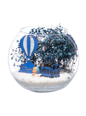 Küçük boy, Paşabahçe cam fanus içerisinde tasarladığımız bu güzel teraryum; beyaz kum, kurutulmuş bitkiler, bir adet erkek bebek, bir adet mavi ahşap karyola, bir adet mavi balon ahşap fil objeler kullanılarak tamamlanmıştır. Ev ve ofis ortamlarının tamamında sergilenebilir teraryumun içinde kurutulmuş bitkiler bulunduğundan hava alması önemlidir. Açık olan kısmının kapatılmaması veya büfe vb. kapalı alanlara konulmaması gereklidir. Özellikle her ortamda yıllarca, zevkle izlenebilecek özel bir teraryumdur. Yaklaşık Ölçüleri: 16x18 cm