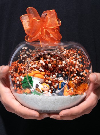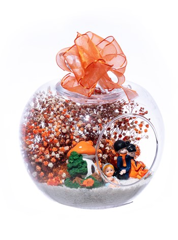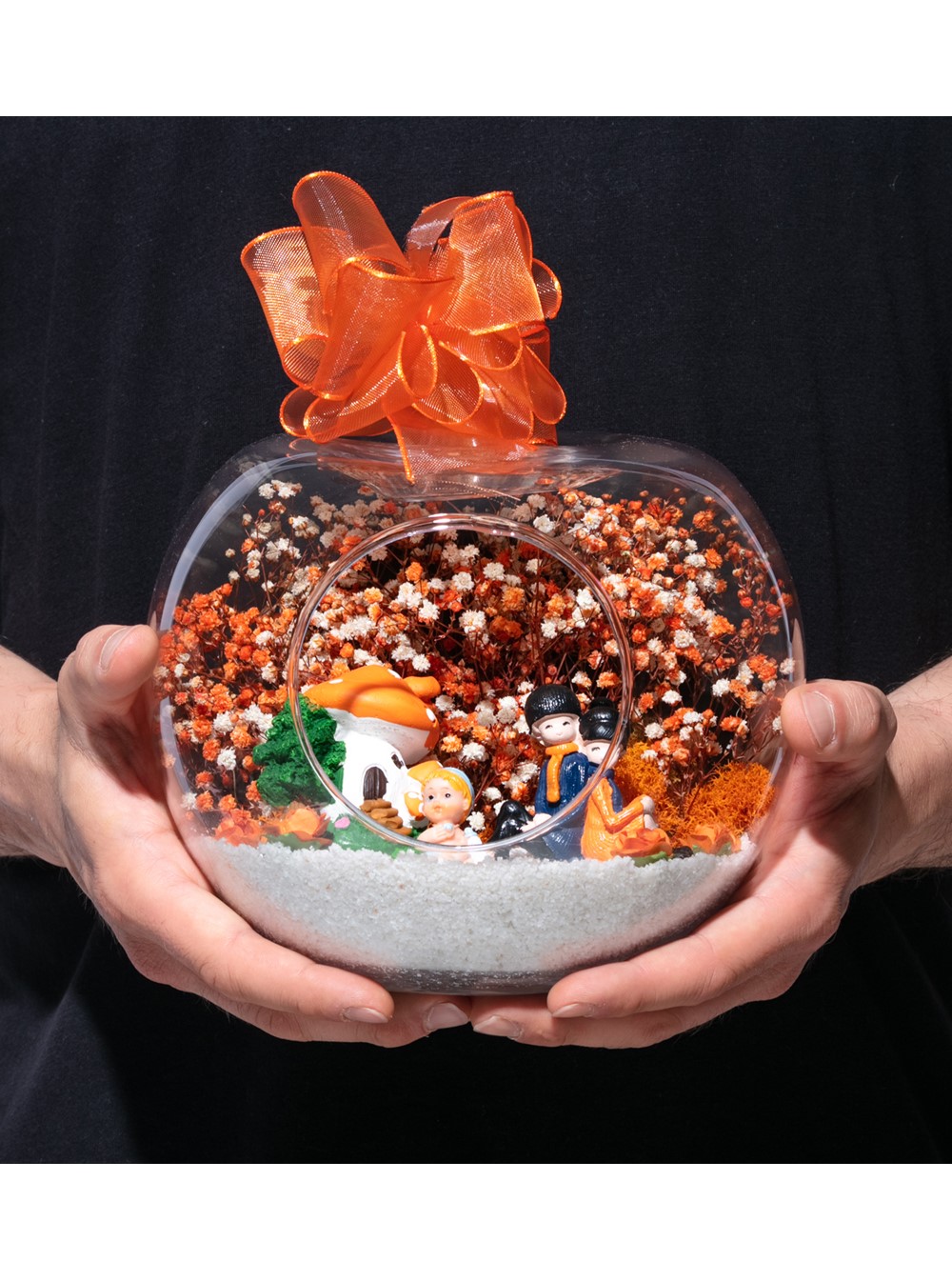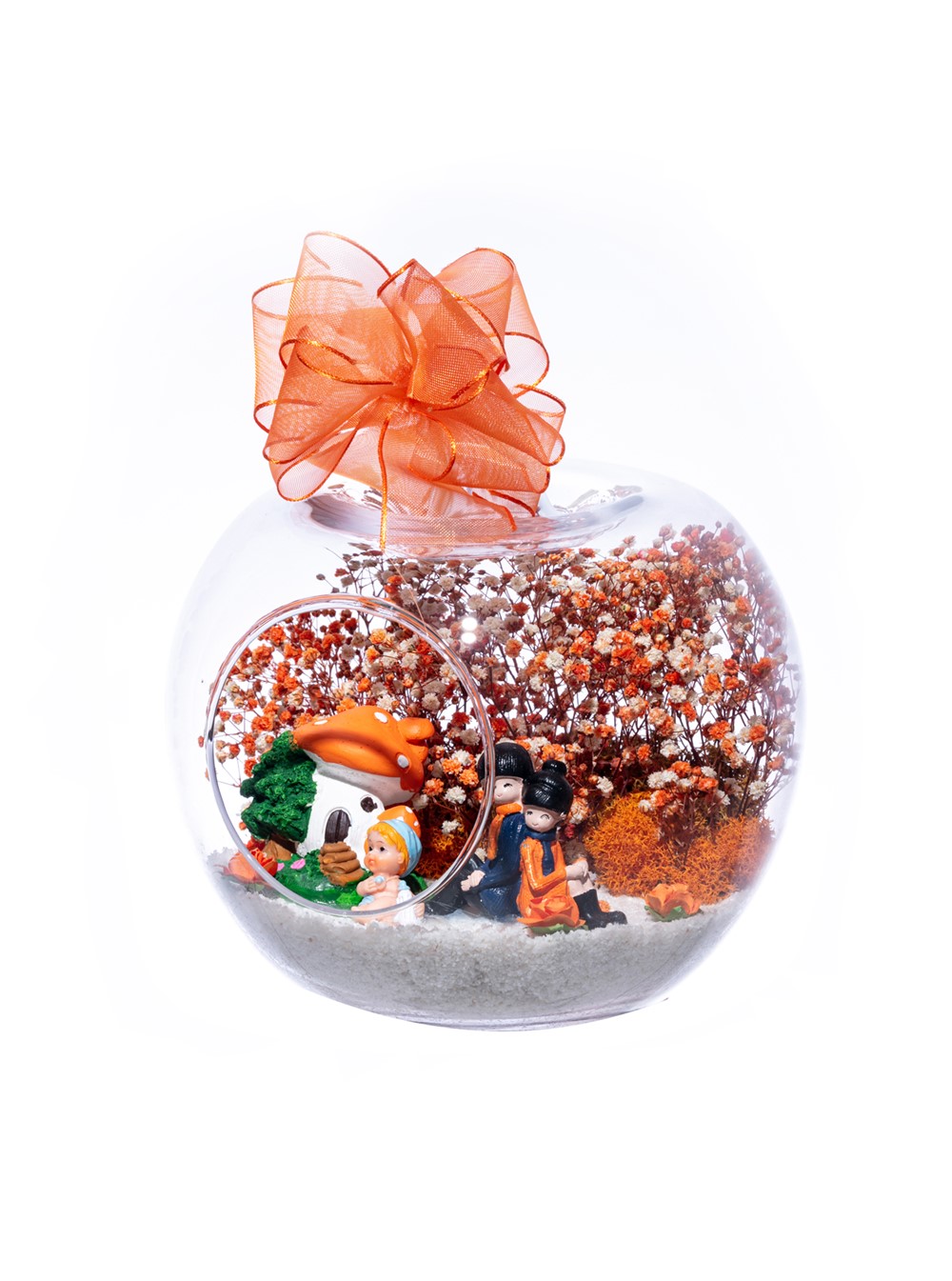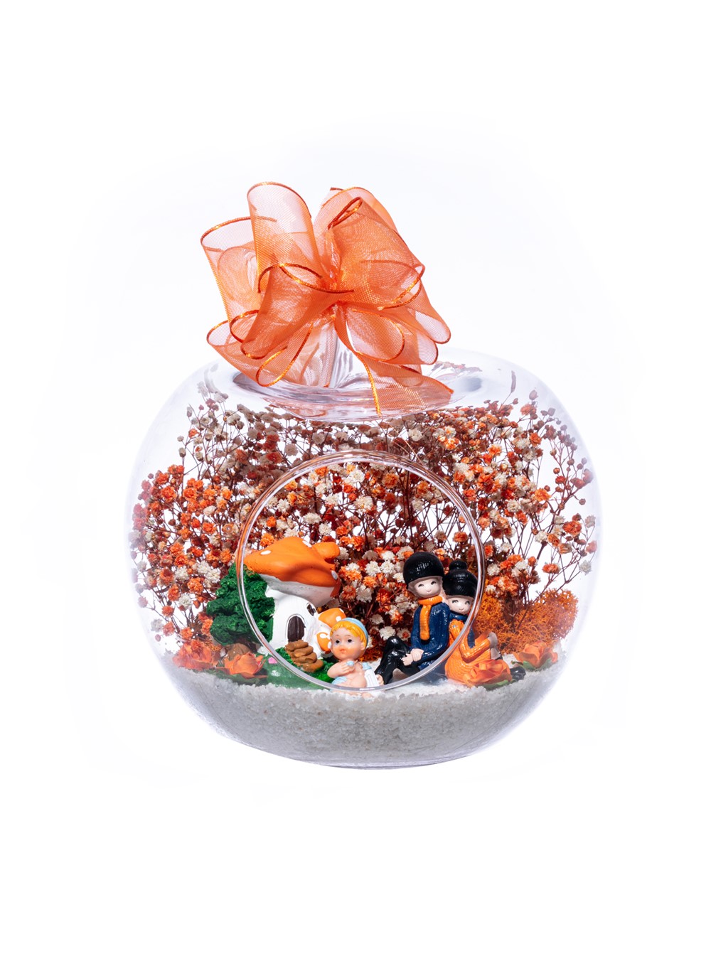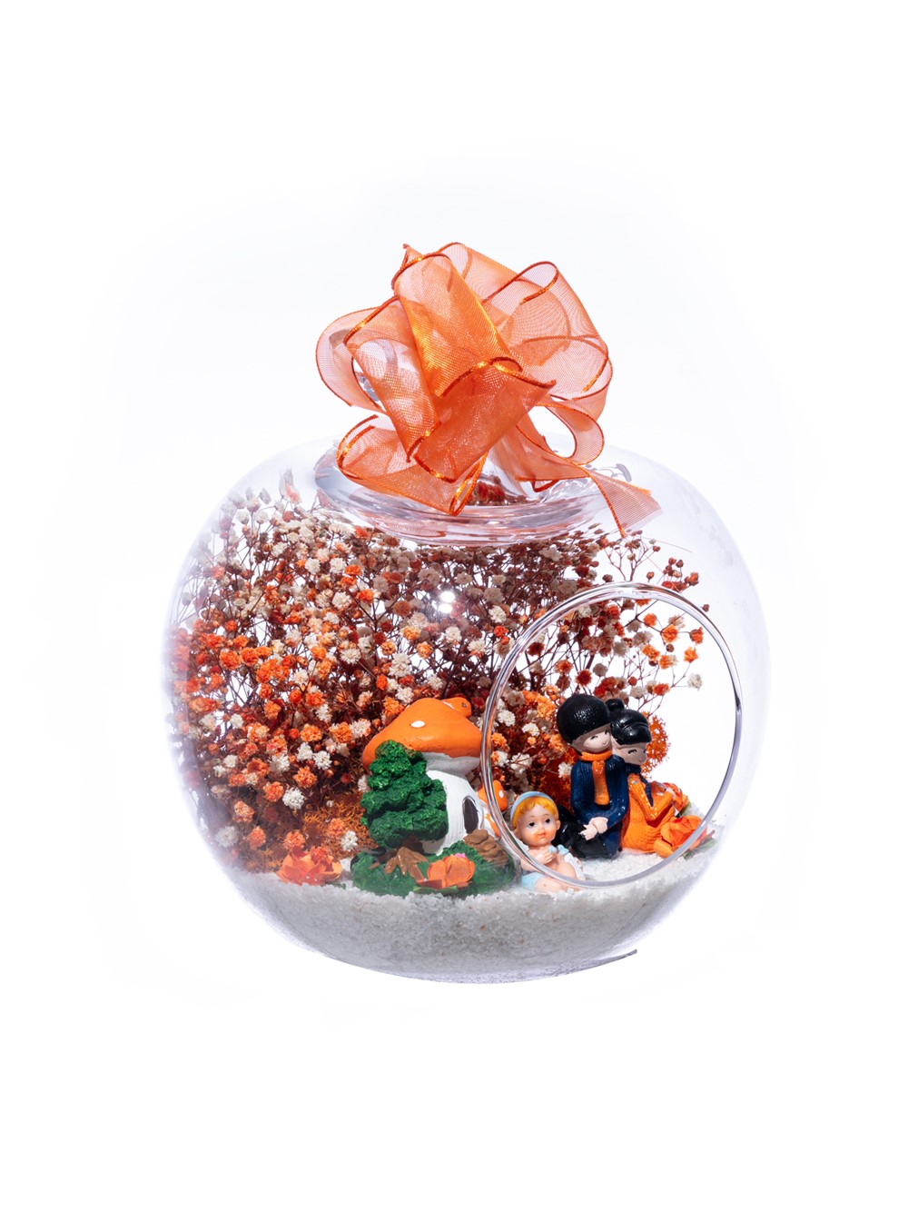 Üzerinde şık kurdelesiyle küçük boy elma cam fanus içerisinde tasarladığımız bu çok güzel teraryum; beyaz kum, şoklanmış yosunlar, kurutulmuş bitkiler, yapay güller, bir adet mantar ev, bir çift ebeveyni simgeleyen obje ve bir adet erkek bebek obje kullanılarak tamamlanmıştır. Ev ve ofis ortamlarının tamamında sergilenebilir teraryumun içinde, kurutulmuş ve şoklanmış bitkiler bulunduğundan hava alması önemlidir. Açık olan kısmının kapatılmaması veya büfe vb. kapalı alanlara konulmaması gereklidir. Özellikle her ortamda yıllarca, zevkle izlenebilecek özel bir teraryumdur. Yaklaşık Ölçüleri: 20x20cm NOT: Teraryumlarda kullanılan camlar, üfleme cam işçiliğiyle üretildiğinden bazı detaylarda farklılıklar gözlenebilir. Örneğin, sap kısmı ve ağız bitiş noktalarının her biri kendine özgüdür.