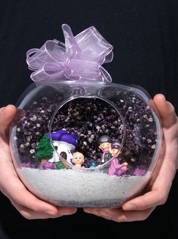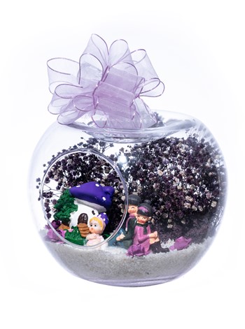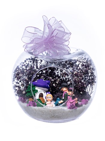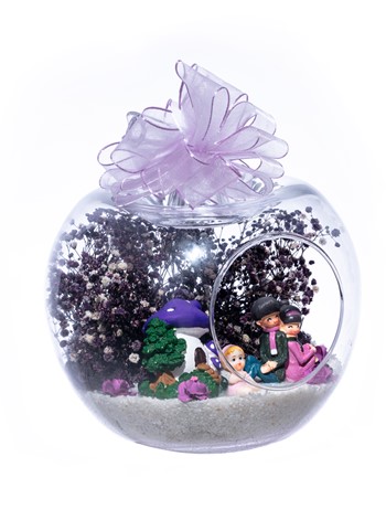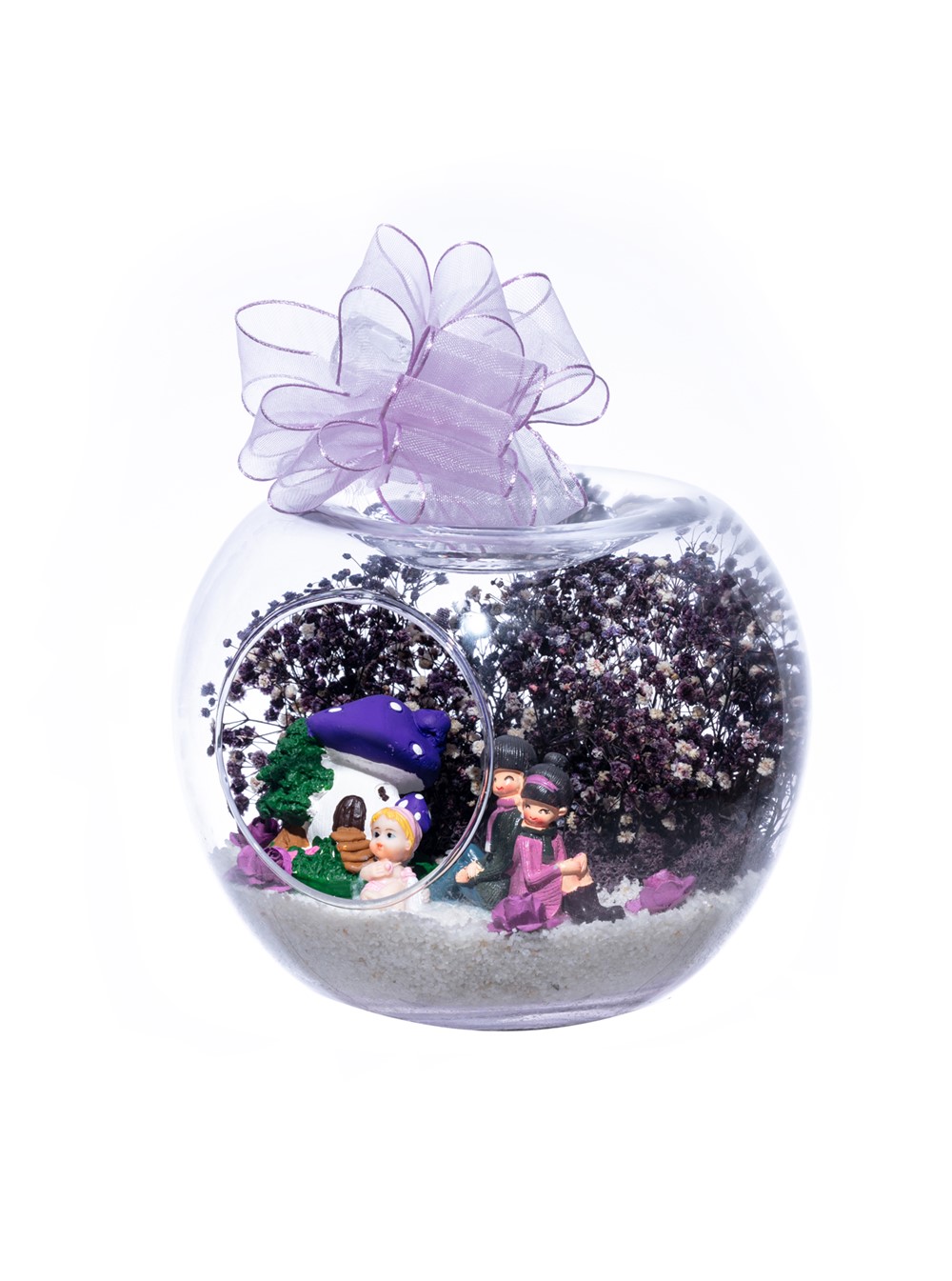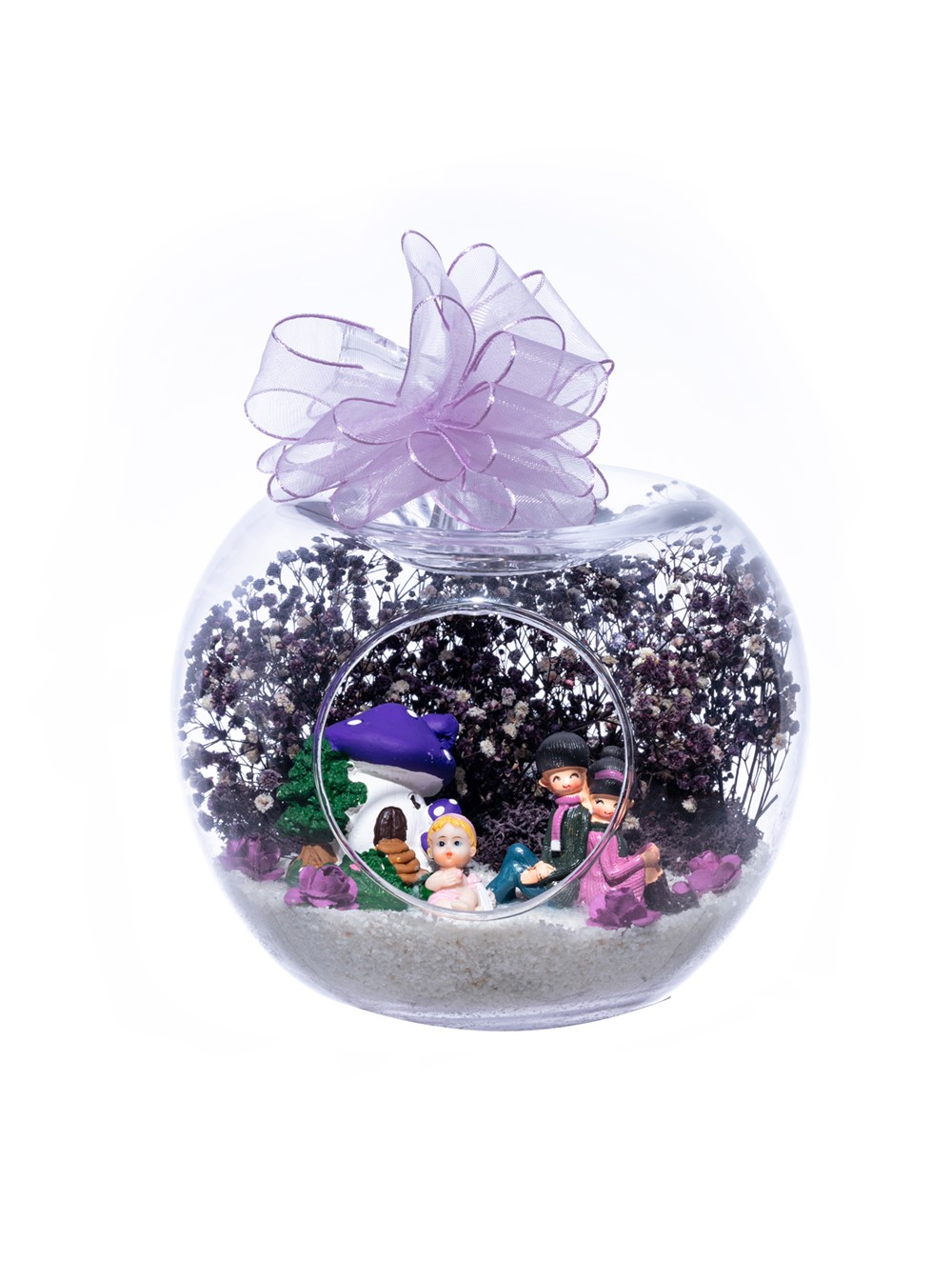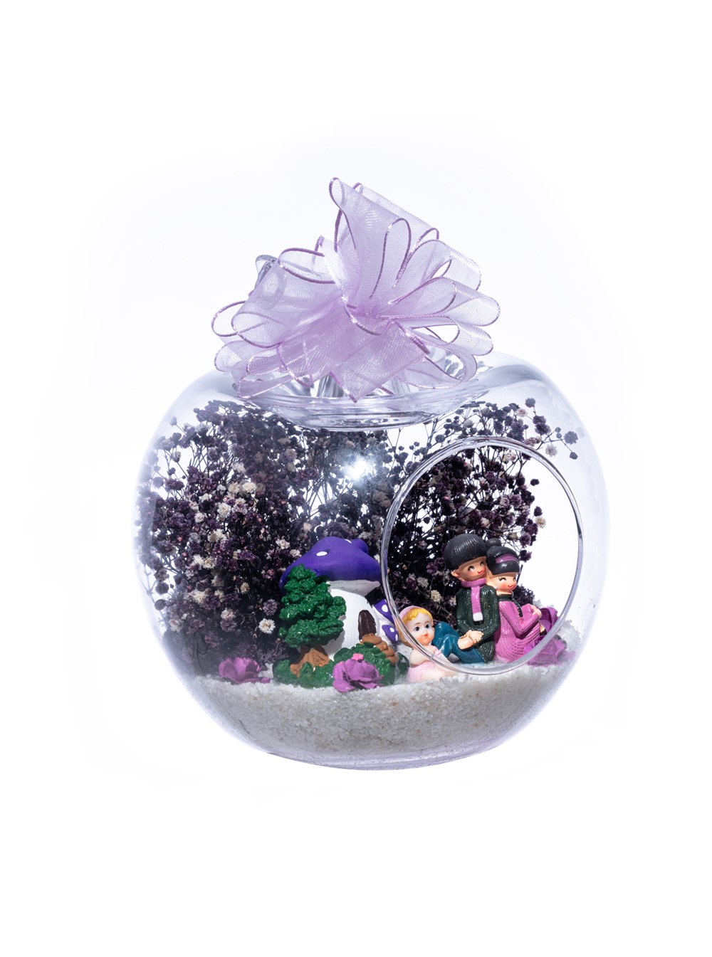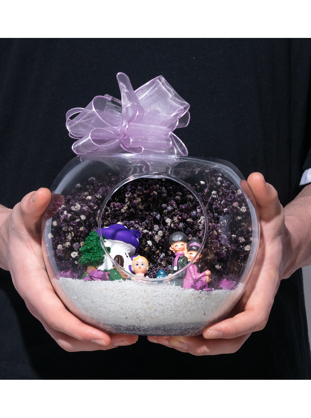 Üzerinde şık kurdelesiyle küçük boy elma cam fanus içerisinde tasarladığımız bu çok güzel teraryum; beyaz kum, şoklanmış yosunlar, kurutulmuş bitkiler, yapay güller, bir adet mantar ev, bir çift ebeveyni simgeleyen obje ve bir adet kız bebek obje kullanılarak tamamlanmıştır. Ev ve ofis ortamlarının tamamında sergilenebilir teraryumun içinde, kurutulmuş ve şoklanmış bitkiler bulunduğundan hava alması önemlidir. Açık olan kısmının kapatılmaması veya büfe vb. kapalı alanlara konulmaması gereklidir. Özellikle her ortamda yıllarca, zevkle izlenebilecek özel bir teraryumdur. Yaklaşık Ölçüleri: 20x20cm NOT: Teraryumlarda kullanılan camlar, üfleme cam işçiliğiyle üretildiğinden bazı detaylarda farklılıklar gözlenebilir. Örneğin, sap kısmı ve ağız bitiş noktalarının her biri kendine özgüdür.