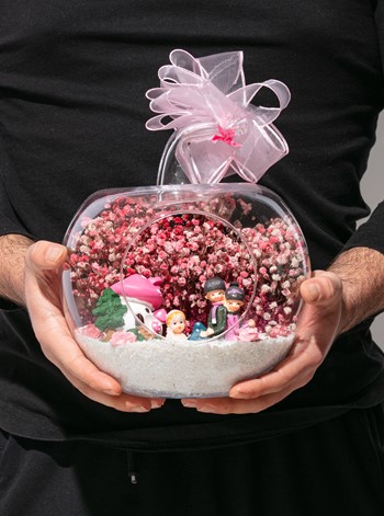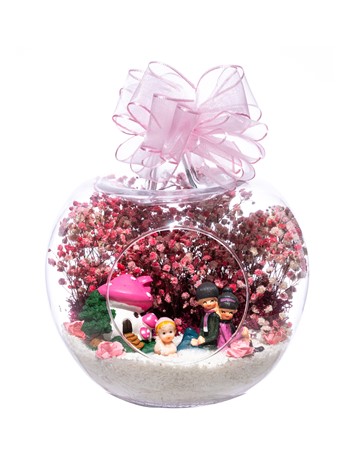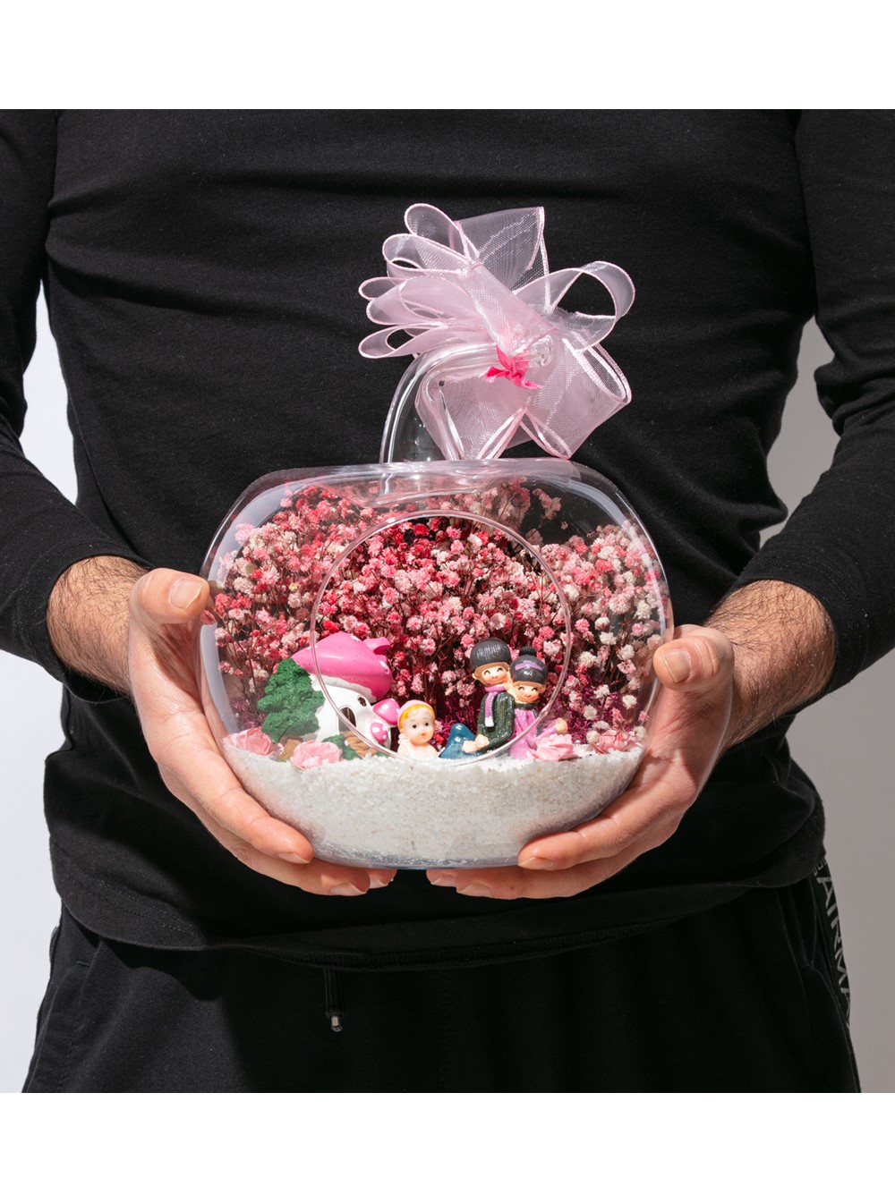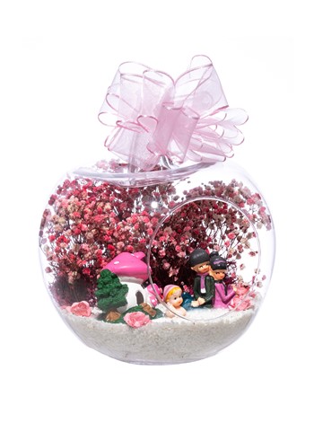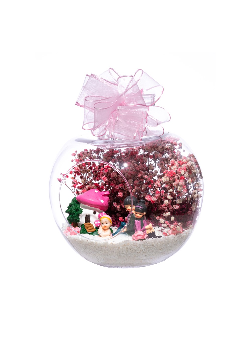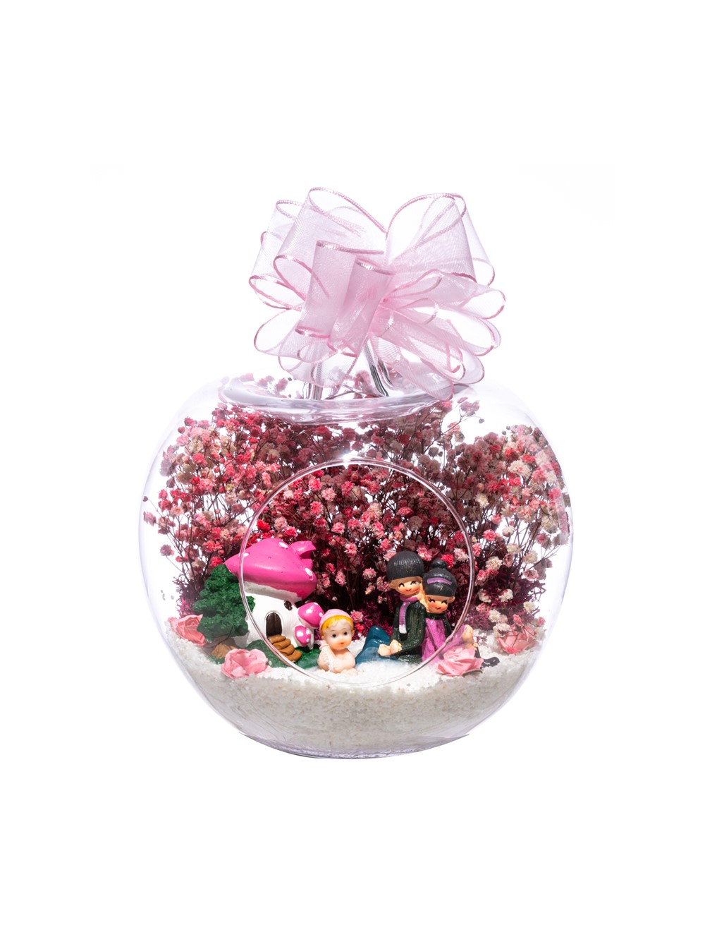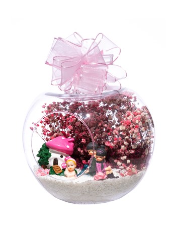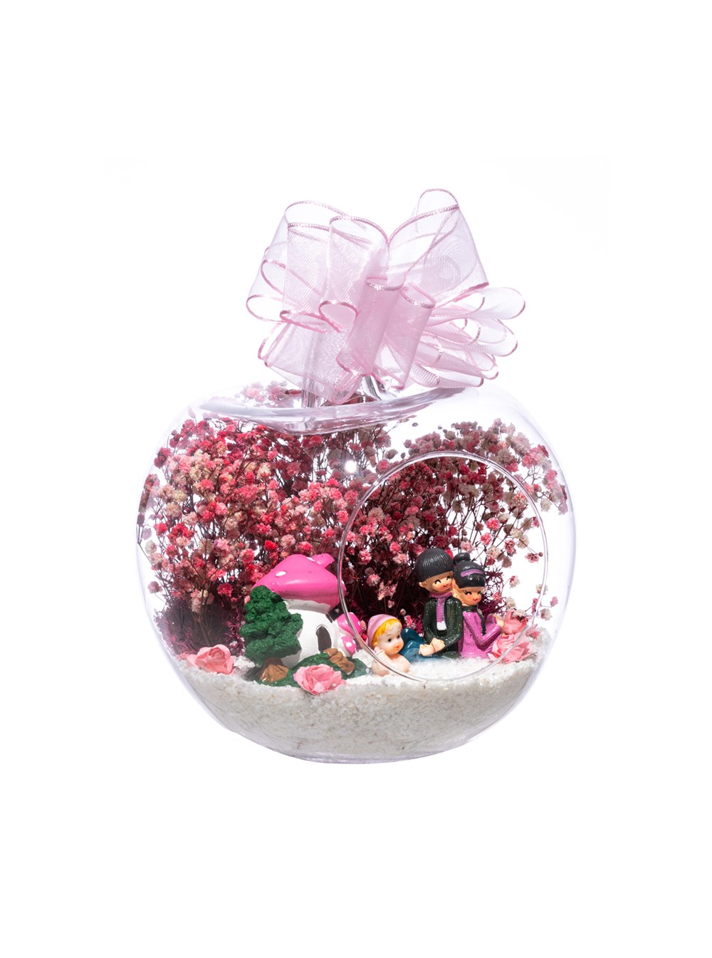 Üzerinde kurdelesiyle küçük boy elma cam fanus içerisinde tasarladığımız bu çok güzel teraryum; beyaz kum, şoklanmış yosunlar, kurutulmuş bitkiler, yapay güller, bir adet pembe mantar ev, bebeklerinin yanında sırt sırta oturan bir çift ebeveyn ve bir adet kız bebek kullanılarak tamamlanmıştır. Ev ve ofis ortamlarının tamamında sergilenebilir teraryumun içinde, kurutulmuş ve şoklanmış bitkiler bulunduğundan hava alması önemlidir. Açık olan kısmının kapatılmaması veya büfe vb. kapalı alanlara konulmaması gereklidir. Özellikle her ortamda yıllarca, zevkle izlenebilecek özel bir teraryumdur. Yaklaşık Ölçüleri: 20x20cm NOT: Teraryumlarda kullanılan camlar, üfleme cam işçiliğiyle üretildiğinden bazı detaylarda farklılıklar gözlenebilir. Örneğin, sap kısmı ve ağız bitiş noktalarının her biri kendine özgüdür.