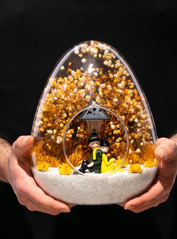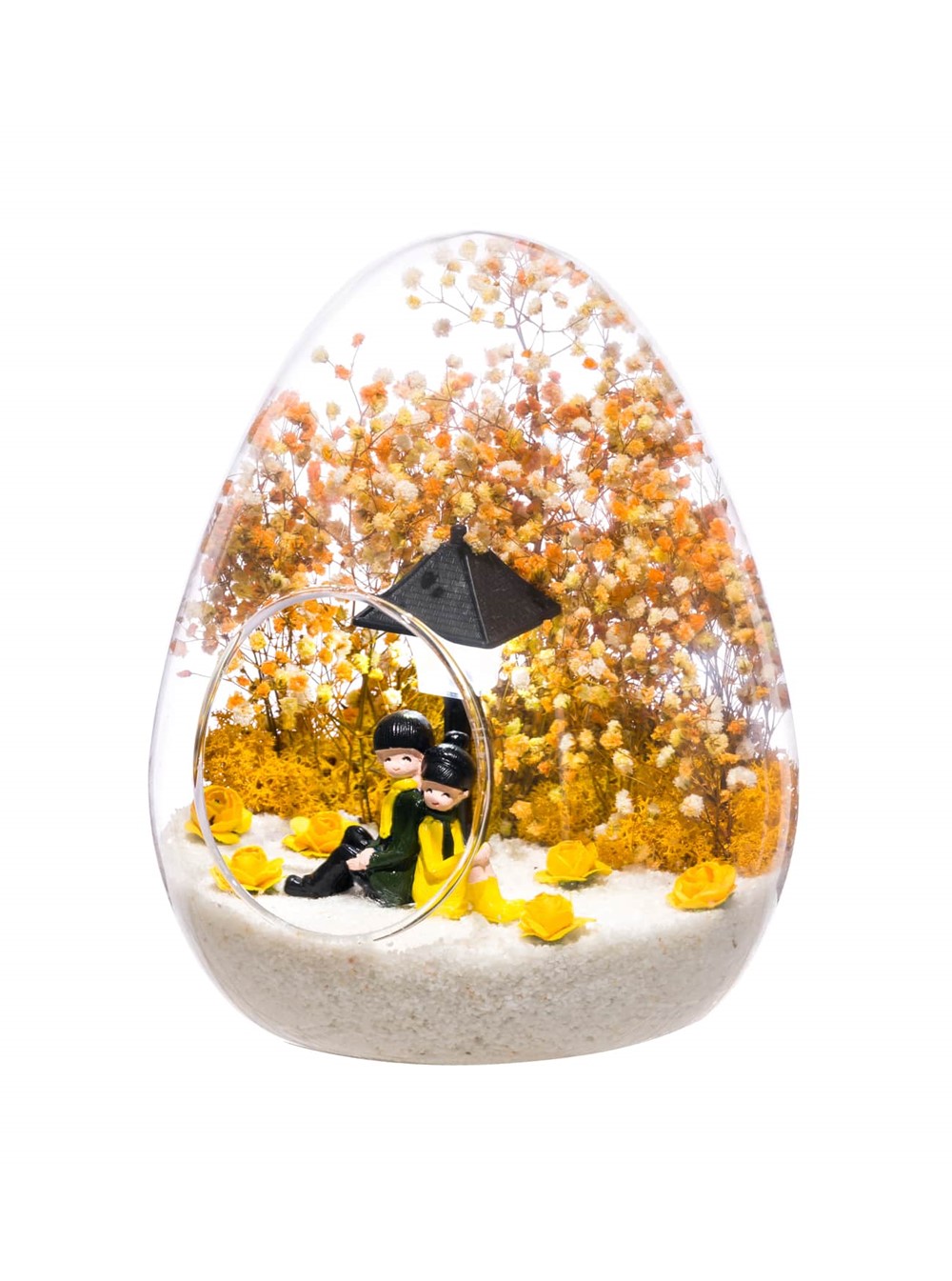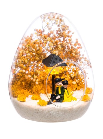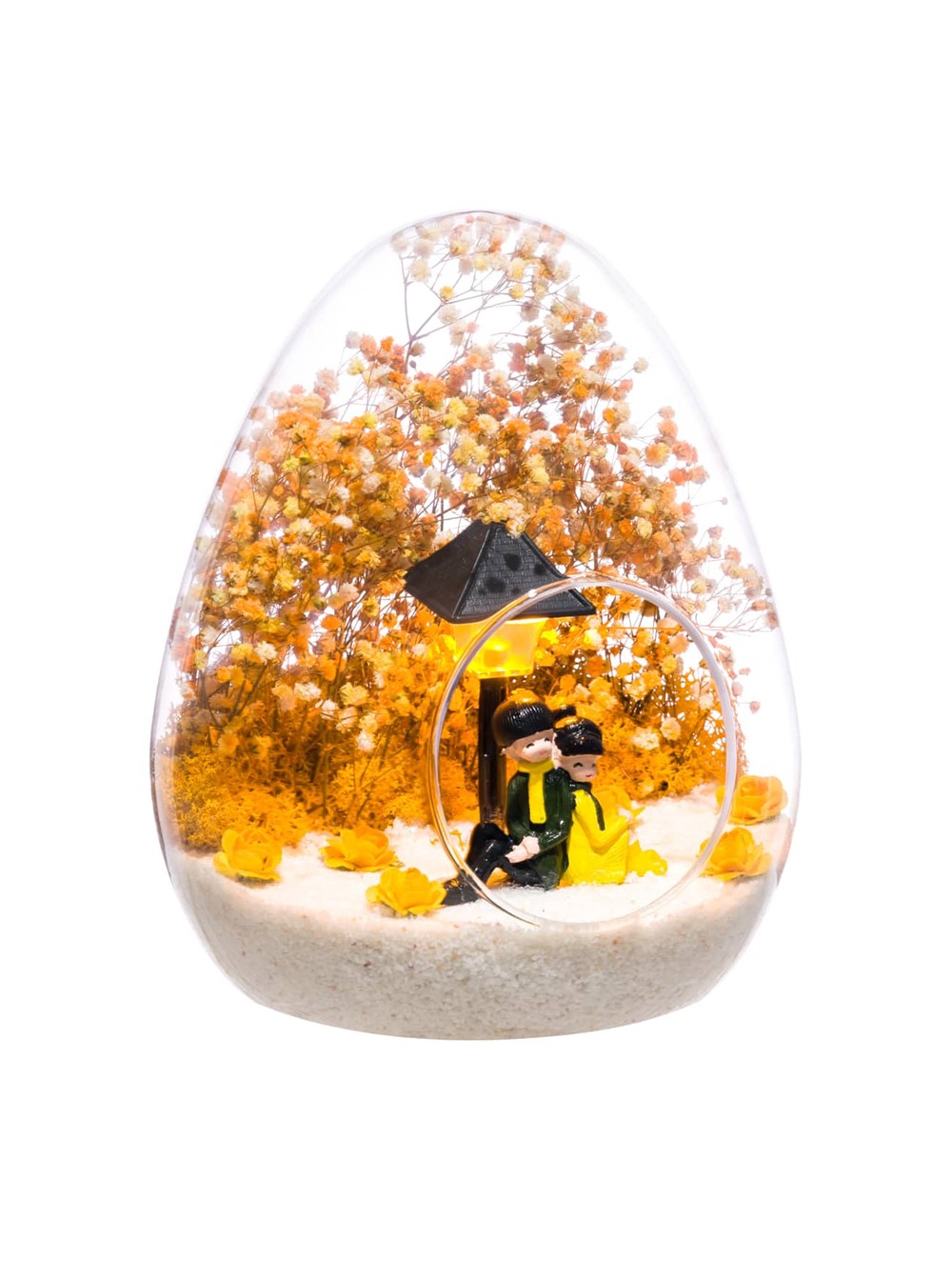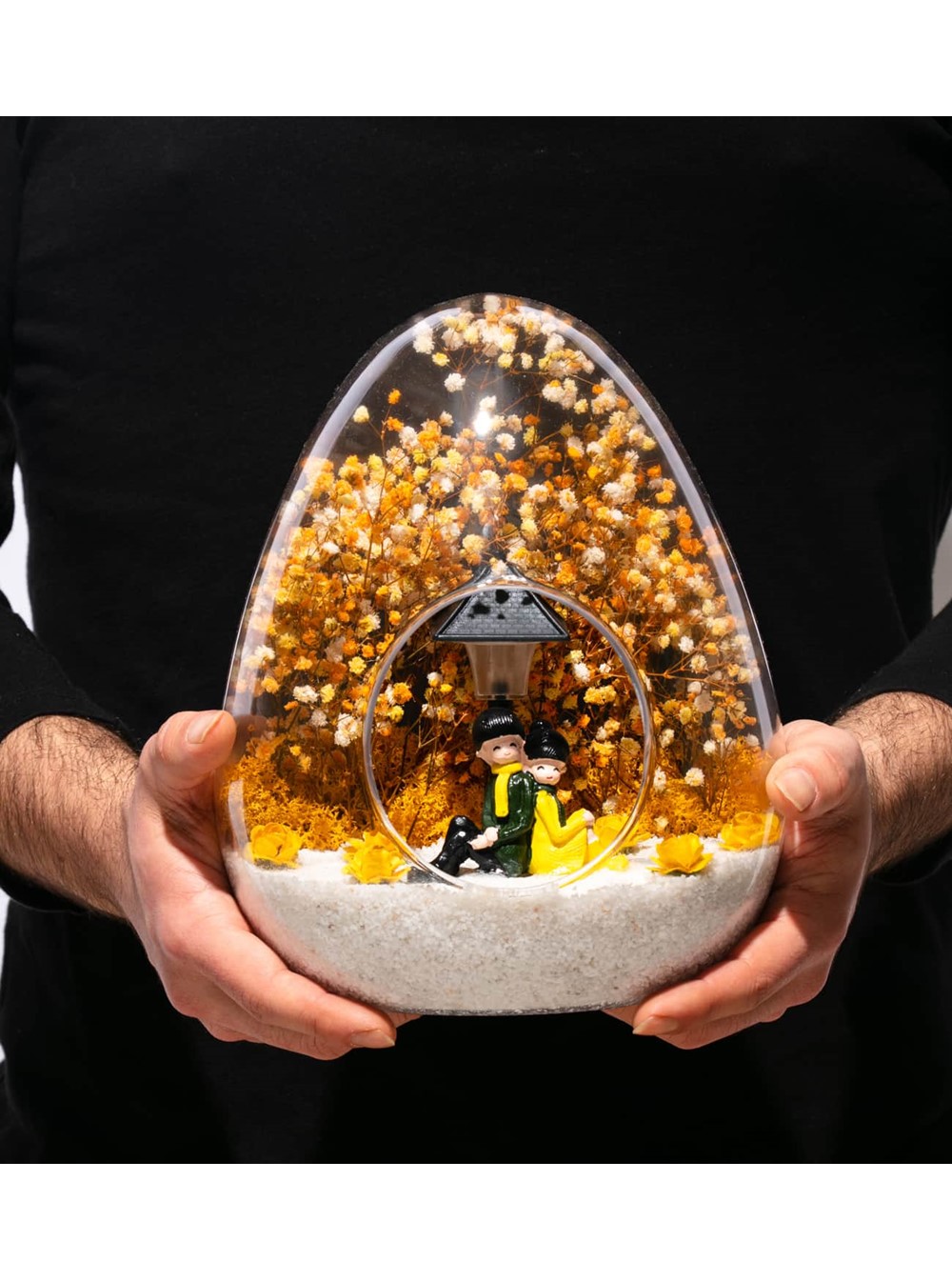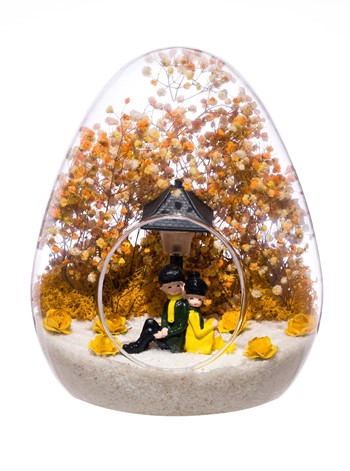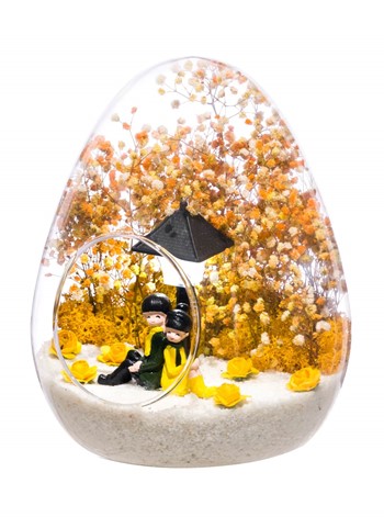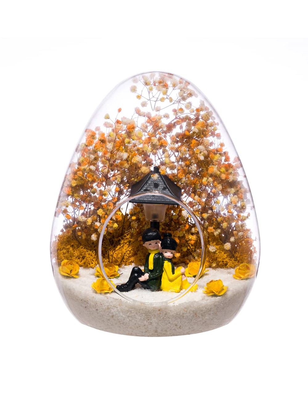 Küçük boy yumurta cam fanus içerisinde tasarladığımız bu güzel teraryum; beyaz kum, kurutulmuş bitkiler, şoklanmış yosunlar, yapay güller, bir adet ışığı iki farklı renkte yanan led sokak lambası görseli ve bir adet sırt sırta anın tadını çıkartan sevgilileri simgeleyen obje ile kurgulanmıştır. Ev ve ofis ortamlarının tamamında sergilenebilir teraryumun içinde, kurutulmuş ve şoklanmış bitkiler bulunduğundan hava alması önemlidir. Açık olan kısmının kapatılmaması veya büfe vb. kapalı alanlara konulmaması gereklidir. Özellikle her ortamda yıllarca, zevkle izlenebilecek özel bir teraryumdur. Yaklaşık Ölçüleri: 18x22cm NOT:Teraryumlarda kullanılan camlar, üfleme cam işçiliğiyle üretildiğinden bazı detaylarda farklılıklar gözlenebilir. Örneğin, yumurta şekli ve ağız bitiş noktalarının her biri kendine özgüdür.