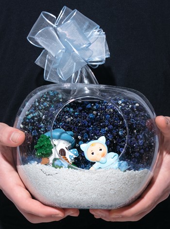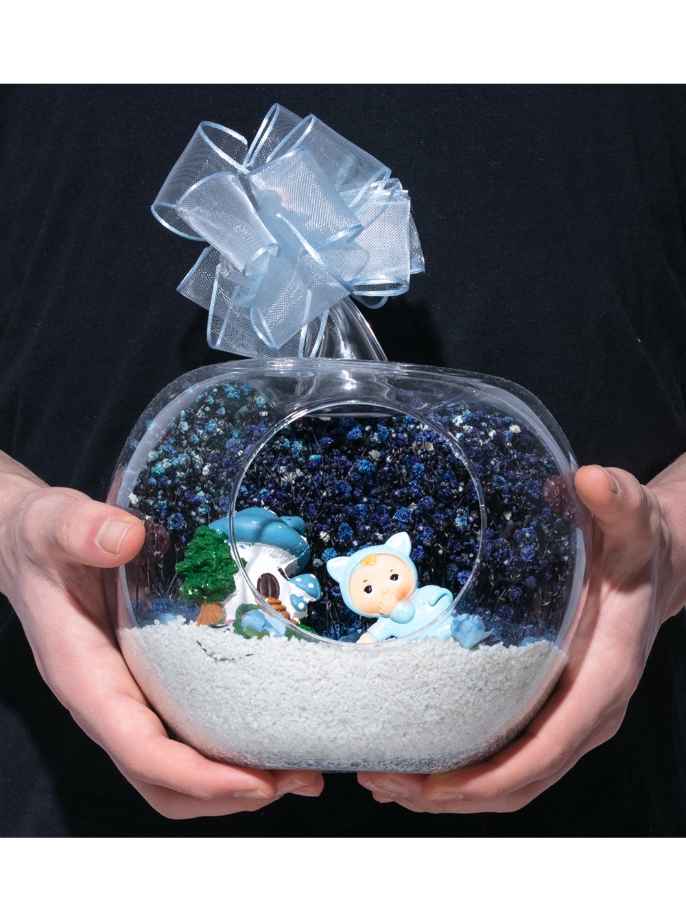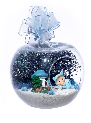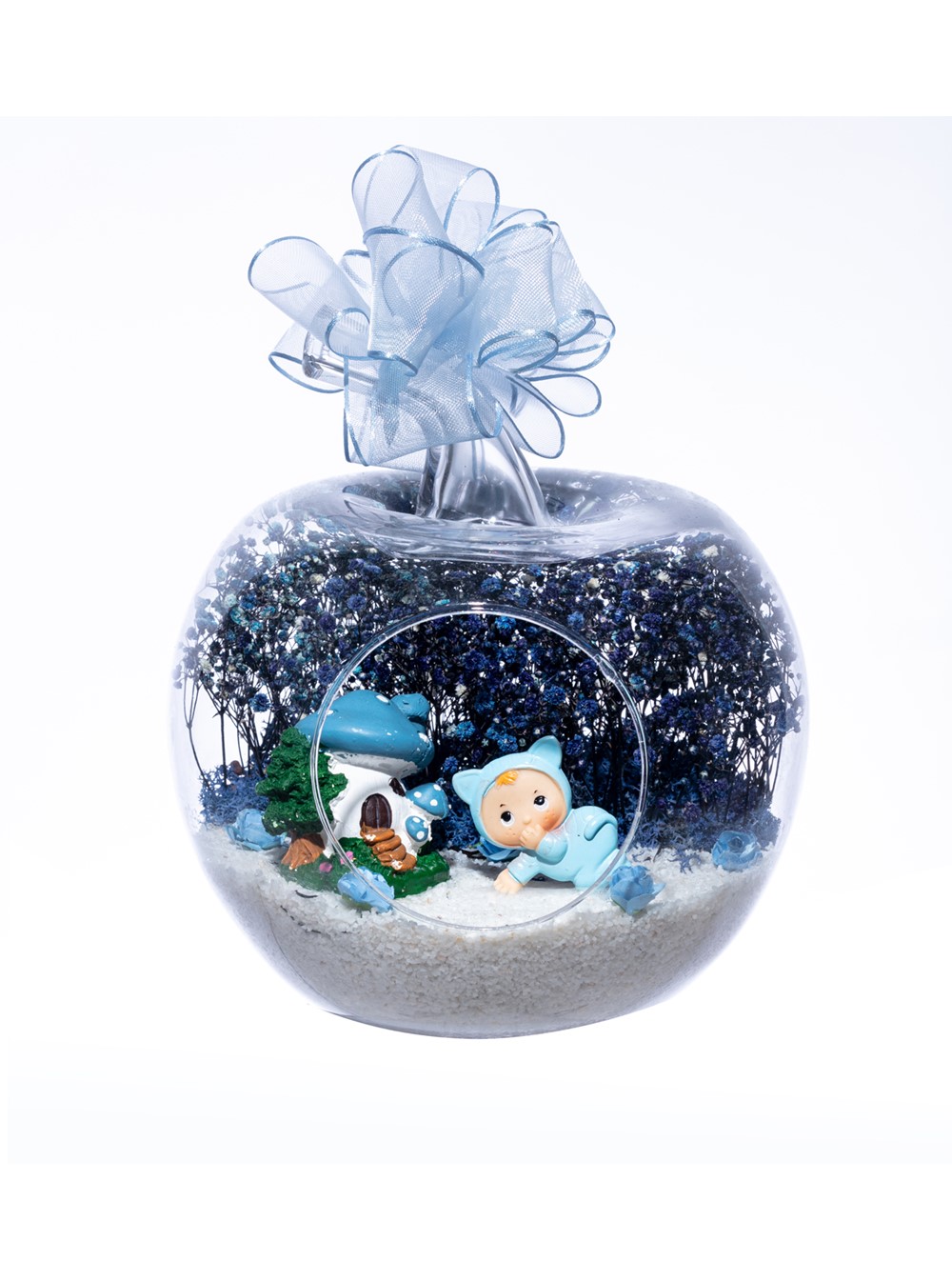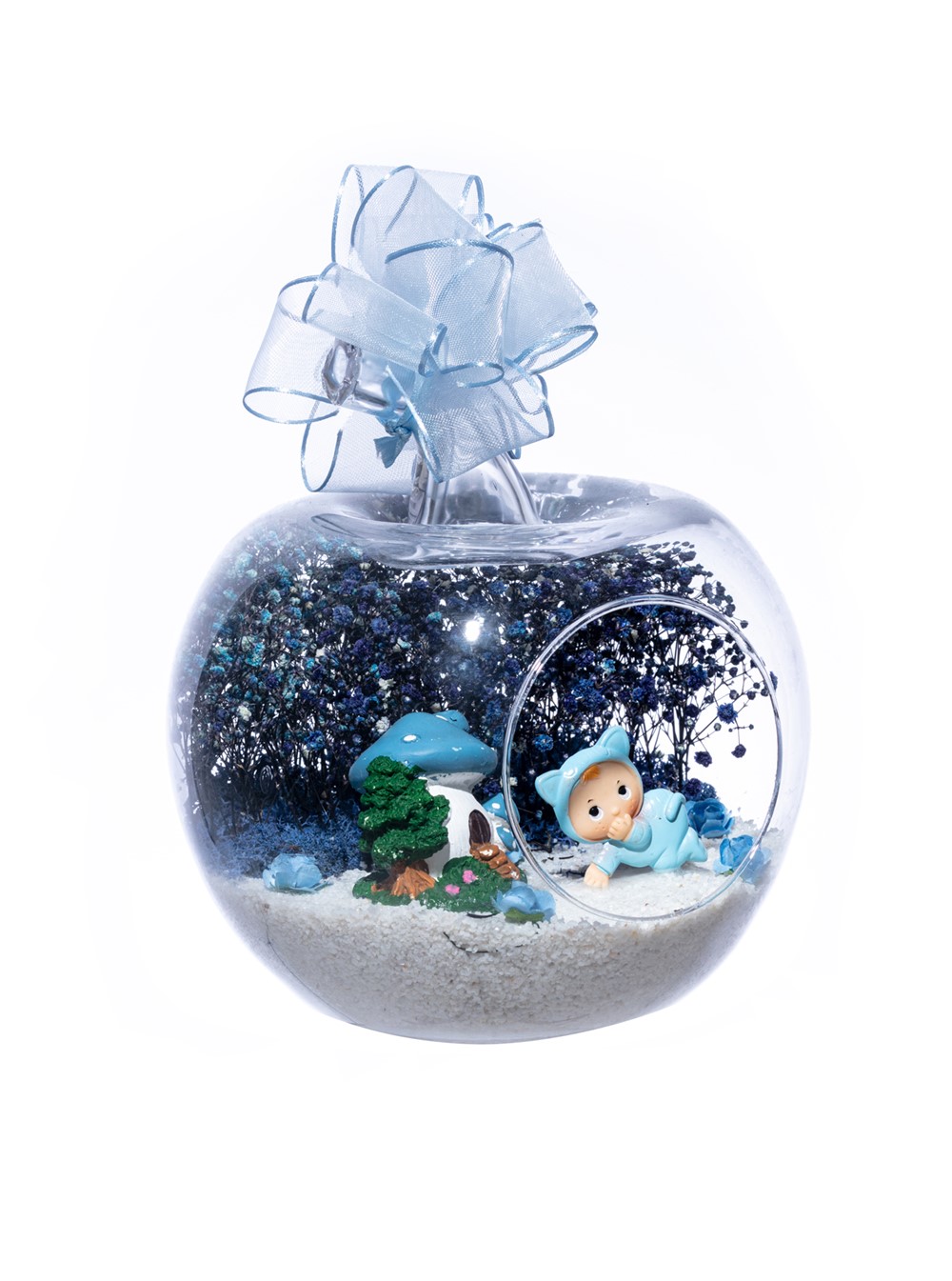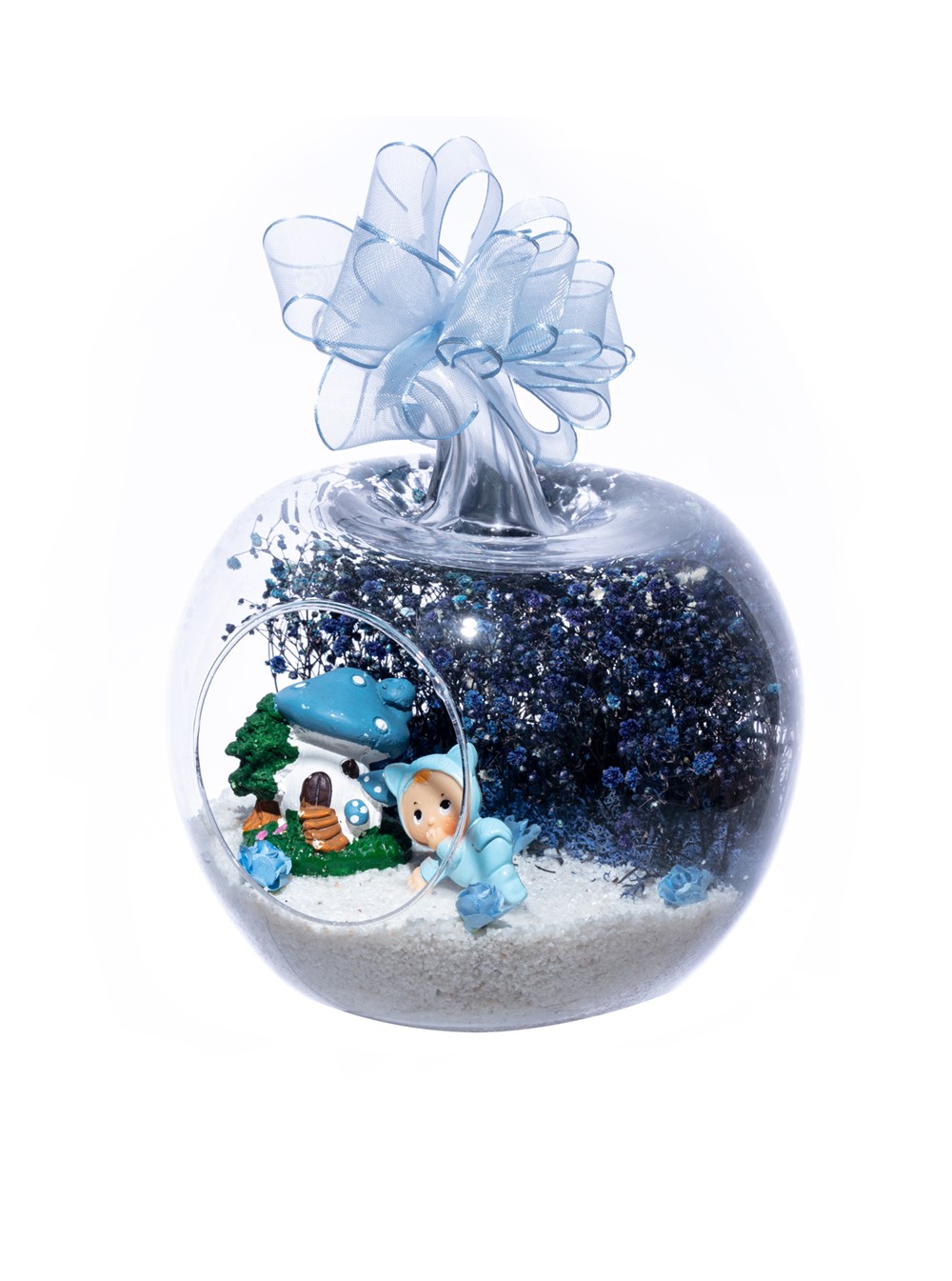 Üzerinde şık kurdelesiyle küçük boy elma cam fanus içerisinde tasarladığımız bu çok güzel teraryum; beyaz kum, şoklanmış yosunlar, kurutulmuş bitkiler, yapay güller, bir adet mantar ev ve bir adet emekleyen şirin erkek bebek obje kullanılarak tamamlanmıştır. Ev ve ofis ortamlarının tamamında sergilenebilir teraryumun içinde, kurutulmuş ve şoklanmış bitkiler bulunduğundan hava alması önemlidir. Açık olan kısmının kapatılmaması veya büfe vb. kapalı alanlara konulmaması gereklidir. Özellikle her ortamda yıllarca, zevkle izlenebilecek özel bir teraryumdur. Yaklaşık Ölçüleri: 20x20cm NOT: Teraryumlarda kullanılan camlar, üfleme cam işçiliğiyle üretildiğinden bazı detaylarda farklılıklar gözlenebilir. Örneğin, sap kısmı ve ağız bitiş noktalarının her biri kendine özgüdür.