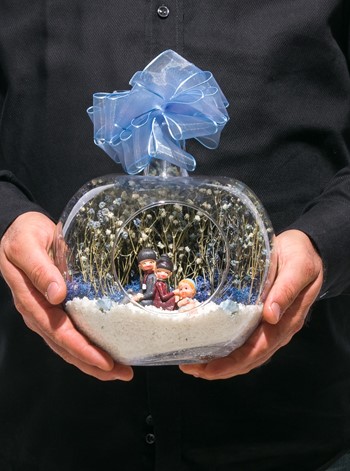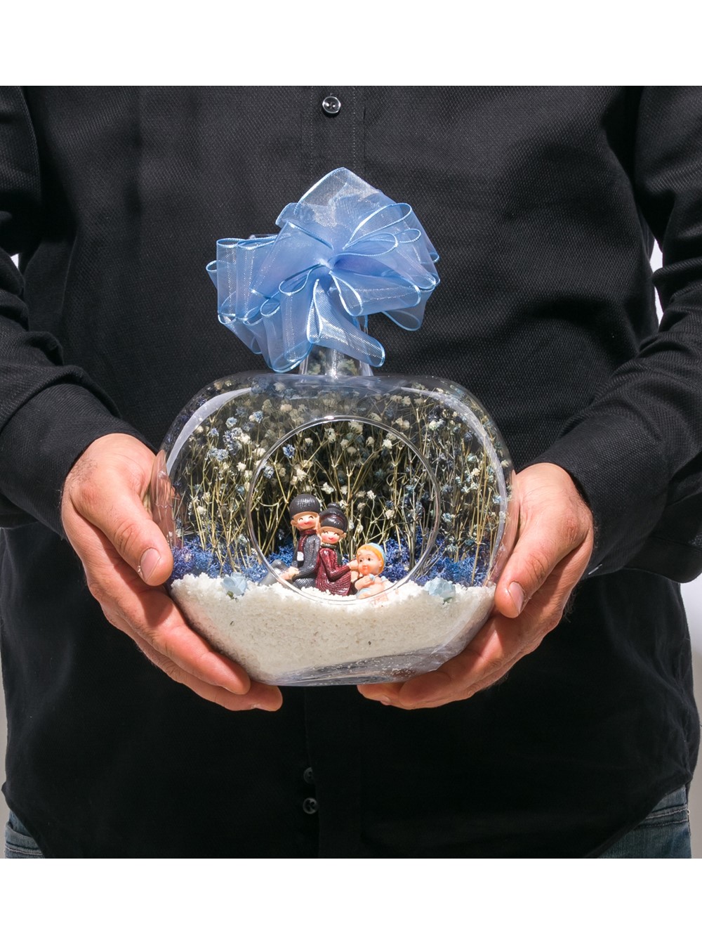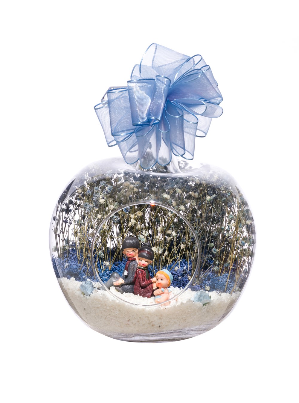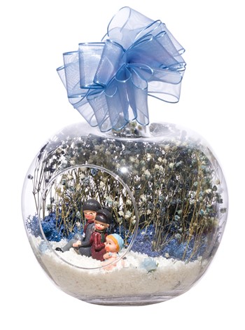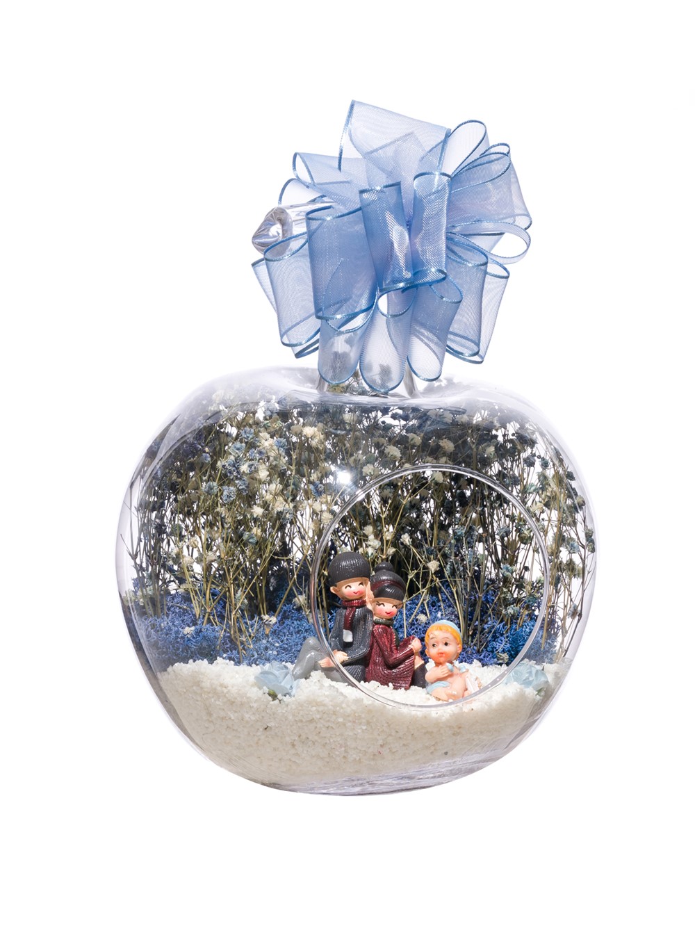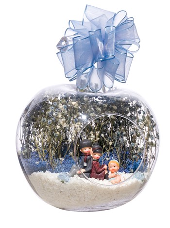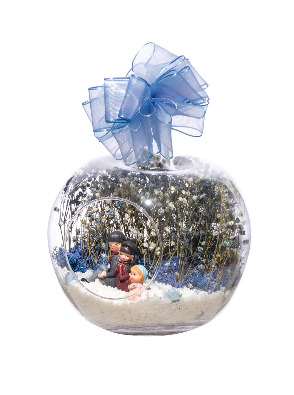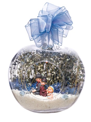 Kurdelesiyle şıklığı tamamlanmış, küçük boy elma cam fanus içerisinde tasarladığımız bu çok güzel teraryum; beyaz kum, kurutulmuş bitkiler, şoklanmış yosun, yapay güller, bir adet sırt sırta oturmuş mutlulukla bebeklerini seyreden anne-baba ve erkek bebek objelerle kurgulanmıştır. Ev ve ofis ortamlarının tamamında sergilenebilir teraryumun içinde, kurutulmuş ve şoklanmış bitkiler bulunduğundan hava alması önemlidir. Açık olan kısmının kapatılmaması veya büfe vb. kapalı alanlara konulmaması gereklidir. Özellikle her ortamda yıllarca, zevkle izlenebilecek özel bir teraryumdur. Yaklaşık Ölçüleri: 20x20cm NOT: Teraryumlarda kullanılan camlar, üfleme cam işçiliğiyle üretildiğinden bazı detaylarda farklılıklar gözlenebilir. Örneğin, sap kısmı ve ağız bitiş noktalarının her biri kendine özgüdür.