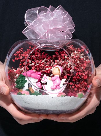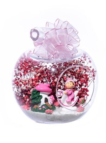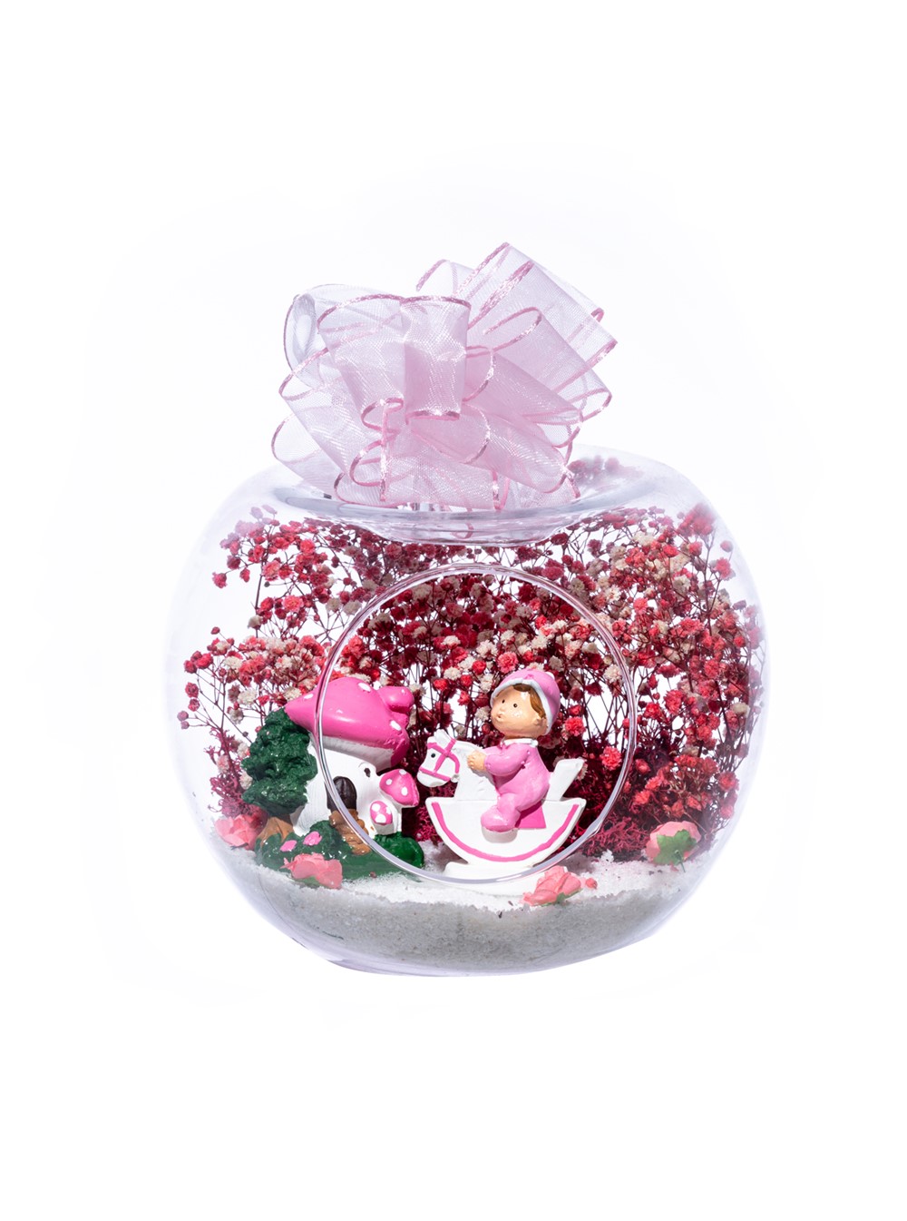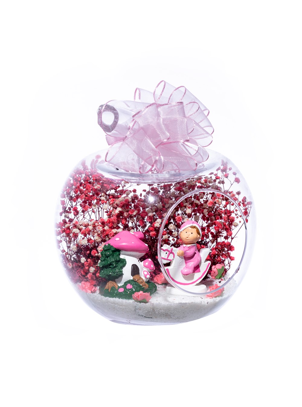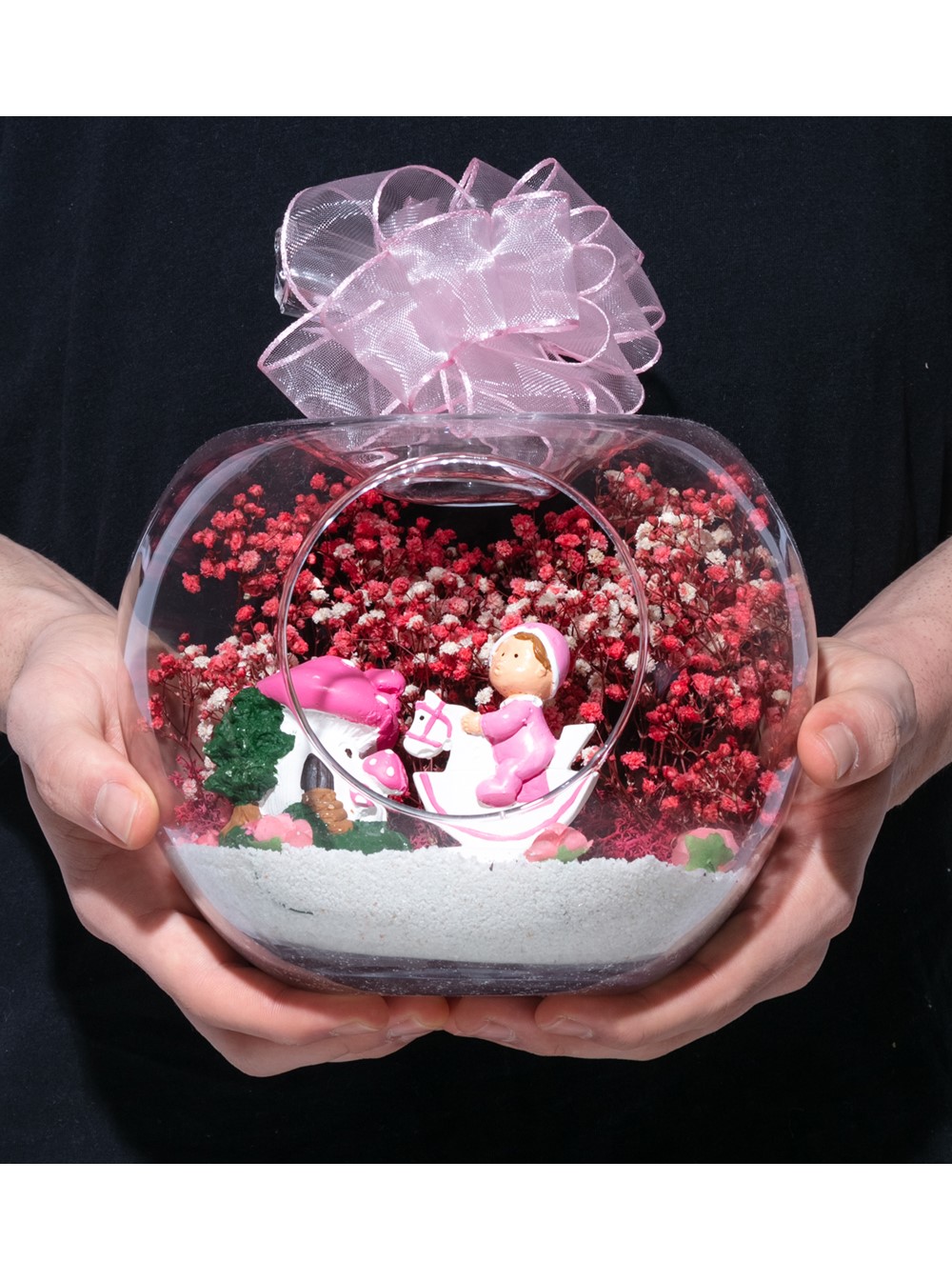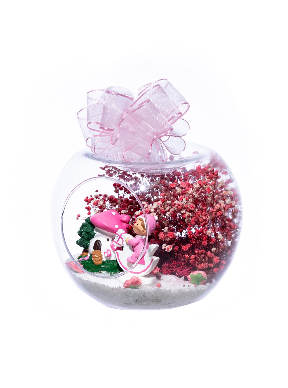 Üzerinde şık kurdelesiyle küçük boy elma cam fanus içerisinde tasarladığımız bu çok güzel teraryum; beyaz kum, şoklanmış yosunlar, kurutulmuş bitkiler, yapay güller, bir adet mantar ev ve bir adet atlı karınca oyuncağında oynayan kız bebek obje kullanılarak tamamlanmıştır. Ev ve ofis ortamlarının tamamında sergilenebilir teraryumun içinde, kurutulmuş ve şoklanmış bitkiler bulunduğundan hava alması önemlidir. Açık olan kısmının kapatılmaması veya büfe vb. kapalı alanlara konulmaması gereklidir. Özellikle her ortamda yıllarca, zevkle izlenebilecek özel bir teraryumdur. Yaklaşık Ölçüleri: 20x20cm NOT: Teraryumlarda kullanılan camlar, üfleme cam işçiliğiyle üretildiğinden bazı detaylarda farklılıklar gözlenebilir. Örneğin, sap kısmı ve ağız bitiş noktalarının her biri kendine özgüdür.