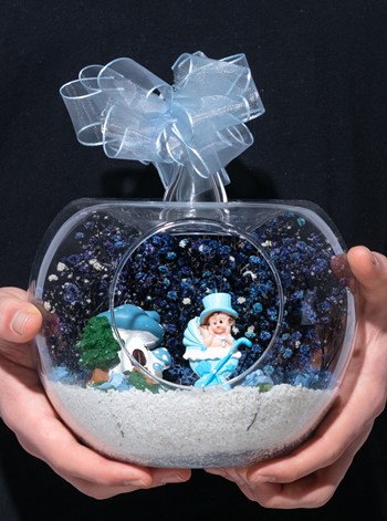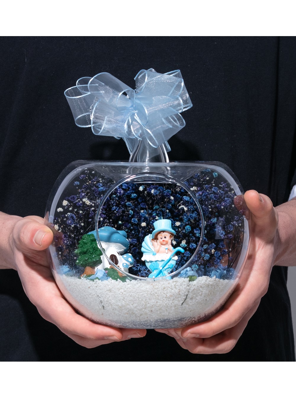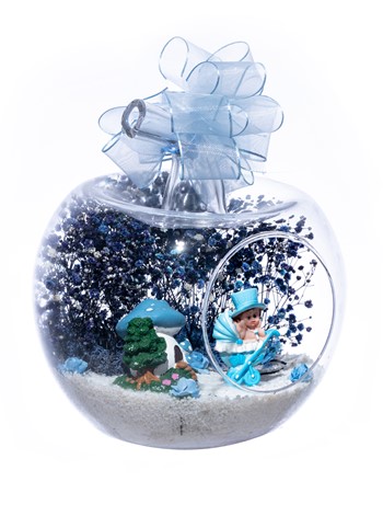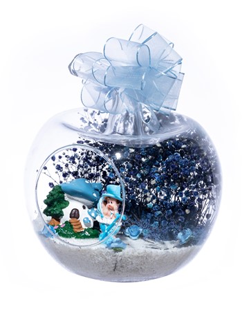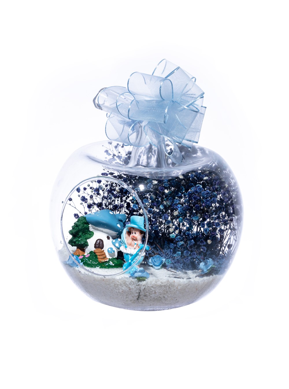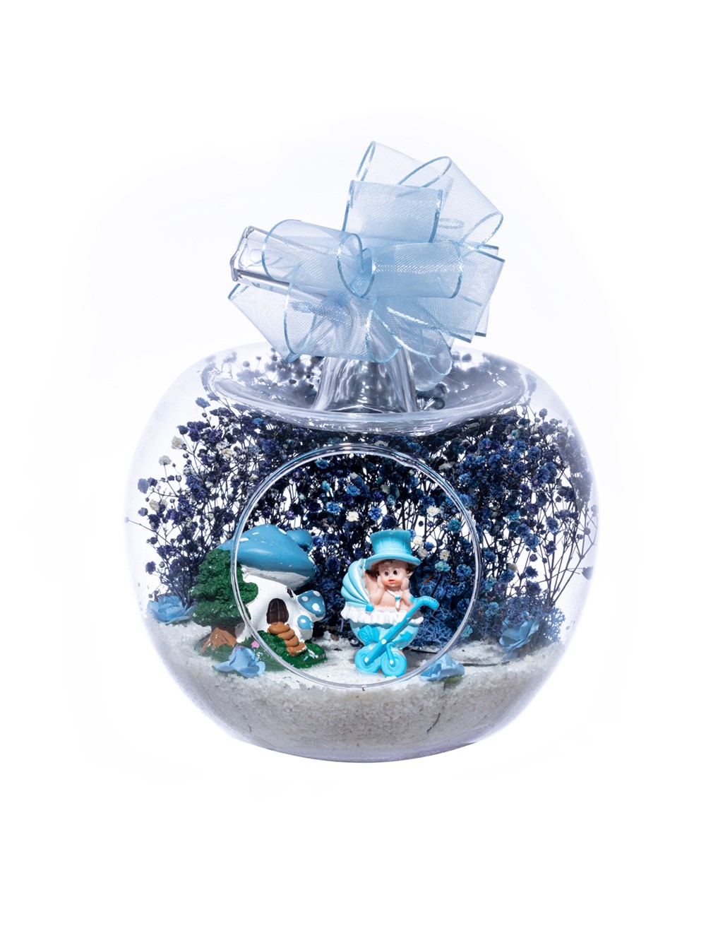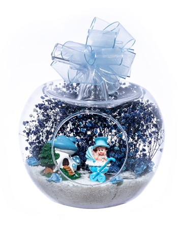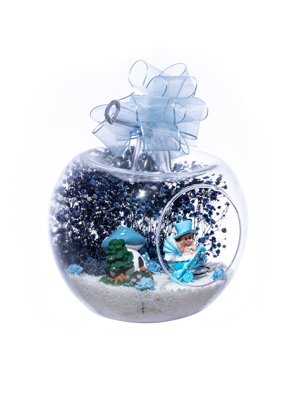 Üzerinde şık kurdelesiyle küçük boy elma cam fanus içerisinde tasarladığımız bu çok güzel teraryum; beyaz kum, şoklanmış yosunlar, kurutulmuş bitkiler, yapay güller, bir adet mantar ev ve bir adet bebek arabasında oturan şapkalı erkek bebek obje kullanılarak tamamlanmıştır. Ev ve ofis ortamlarının tamamında sergilenebilir teraryumun içinde, kurutulmuş ve şoklanmış bitkiler bulunduğundan hava alması önemlidir. Açık olan kısmının kapatılmaması veya büfe vb. kapalı alanlara konulmaması gereklidir. Özellikle her ortamda yıllarca, zevkle izlenebilecek özel bir teraryumdur. Yaklaşık Ölçüleri: 20x20cm NOT: Teraryumlarda kullanılan camlar, üfleme cam işçiliğiyle üretildiğinden bazı detaylarda farklılıklar gözlenebilir. Örneğin, sap kısmı ve ağız bitiş noktalarının her biri kendine özgüdür.