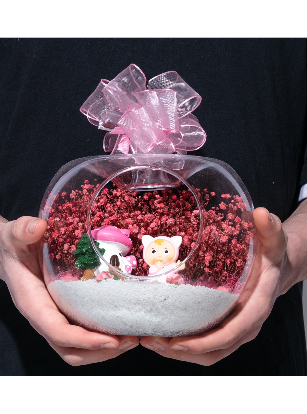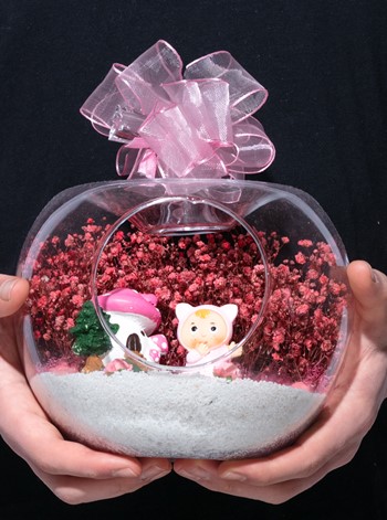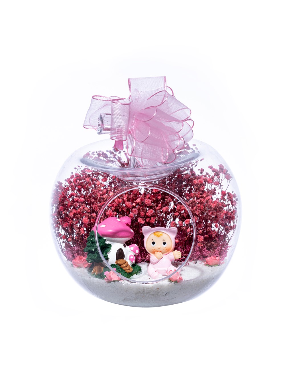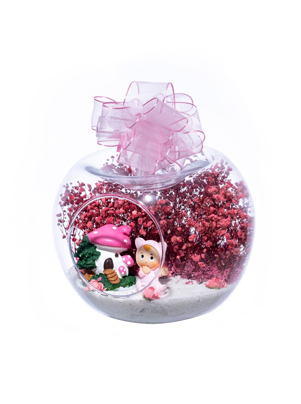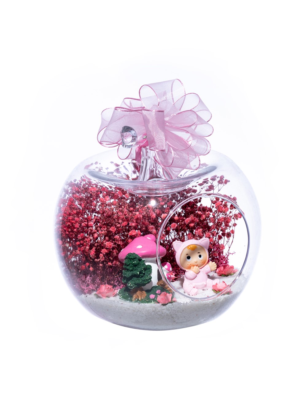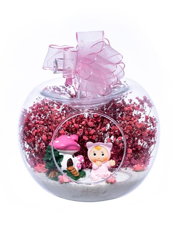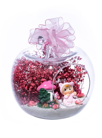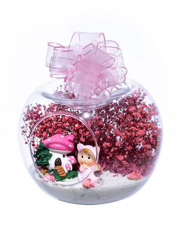 Üzerinde şık kurdelesiyle küçük boy elma cam fanus içerisinde tasarladığımız bu çok güzel teraryum; beyaz kum, şoklanmış yosunlar, kurutulmuş bitkiler, yapay güller, bir adet mantar ev ve bir adet şirin kız bebek obje kullanılarak tamamlanmıştır. Ev ve ofis ortamlarının tamamında sergilenebilir teraryumun içinde, kurutulmuş ve şoklanmış bitkiler bulunduğundan hava alması önemlidir. Açık olan kısmının kapatılmaması veya büfe vb. kapalı alanlara konulmaması gereklidir. Özellikle her ortamda yıllarca, zevkle izlenebilecek özel bir teraryumdur. Yaklaşık Ölçüleri: 20x20cm NOT: Teraryumlarda kullanılan camlar, üfleme cam işçiliğiyle üretildiğinden bazı detaylarda farklılıklar gözlenebilir. Örneğin, sap kısmı ve ağız bitiş noktalarının her biri kendine özgüdür.
