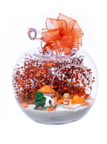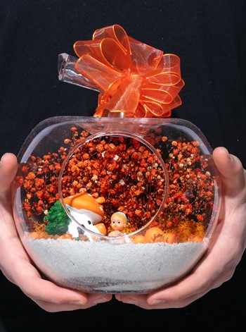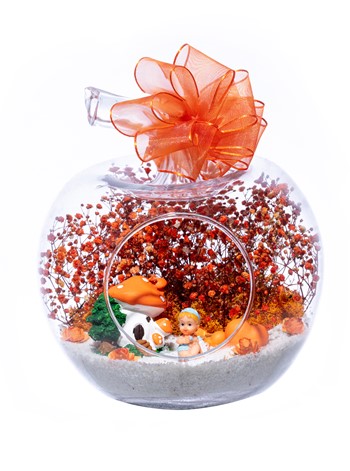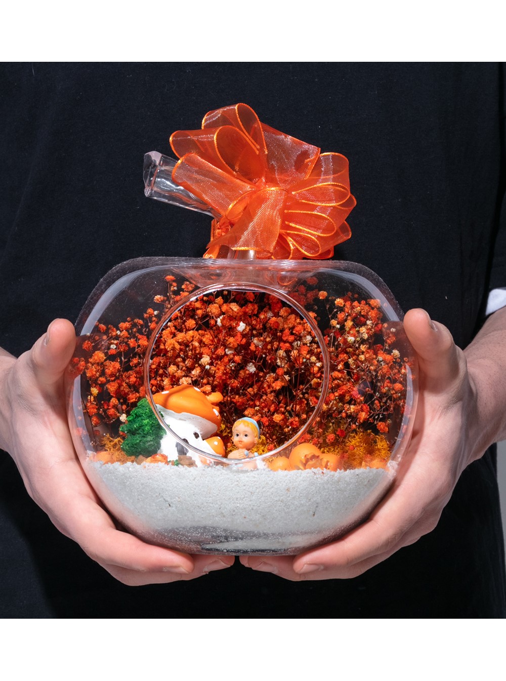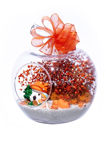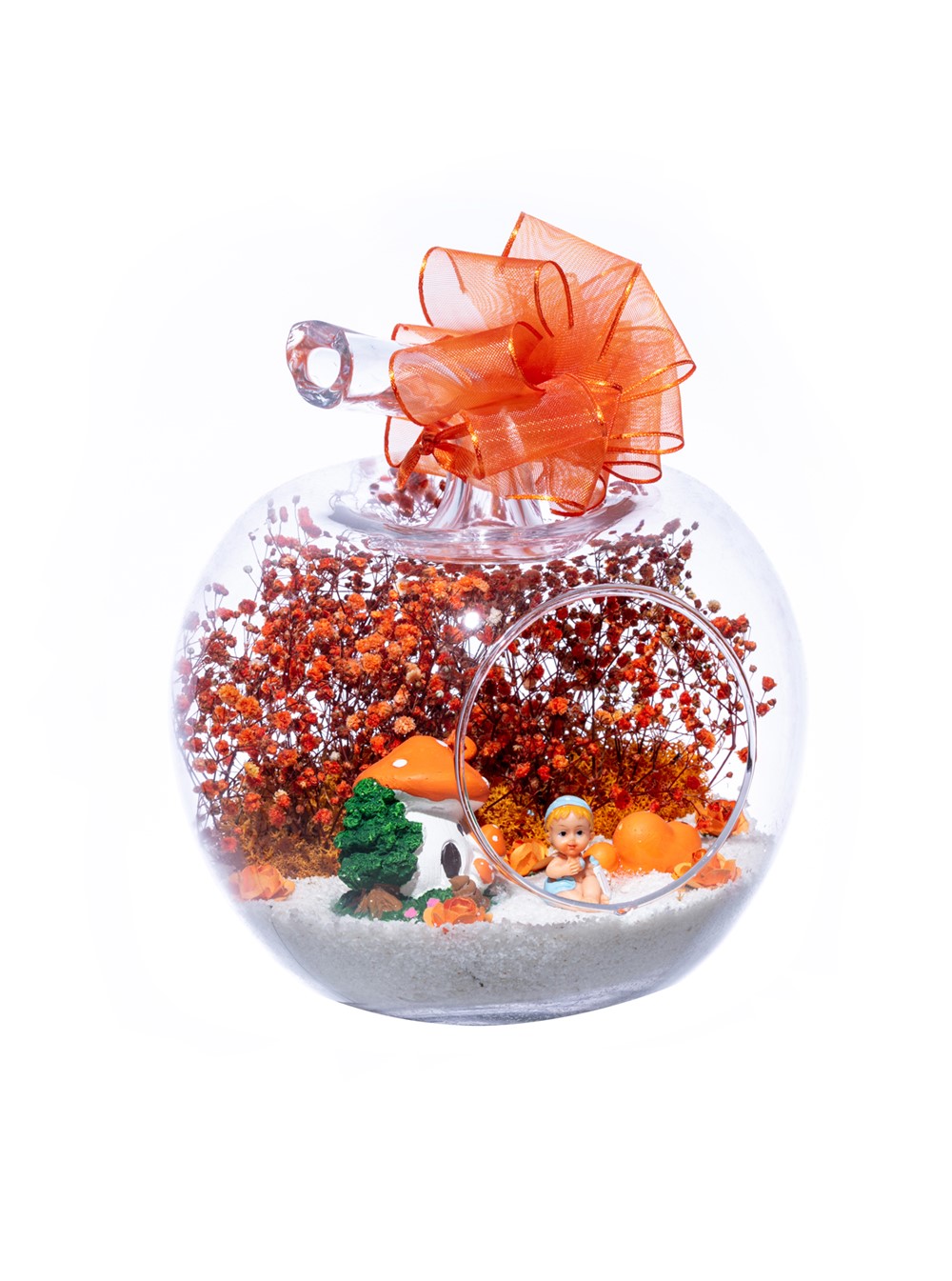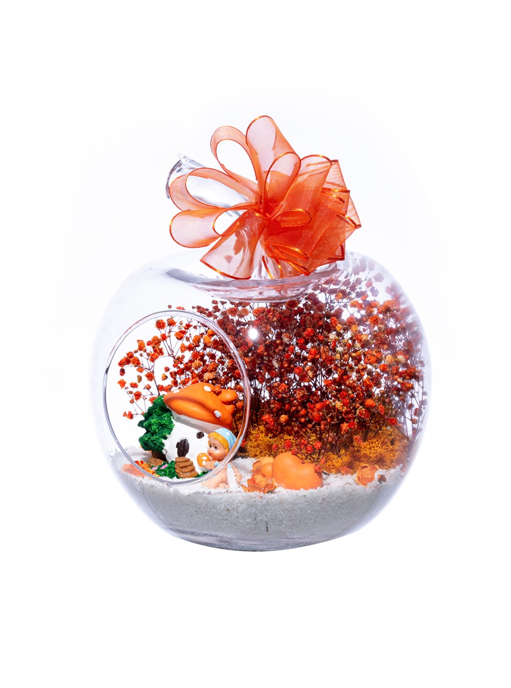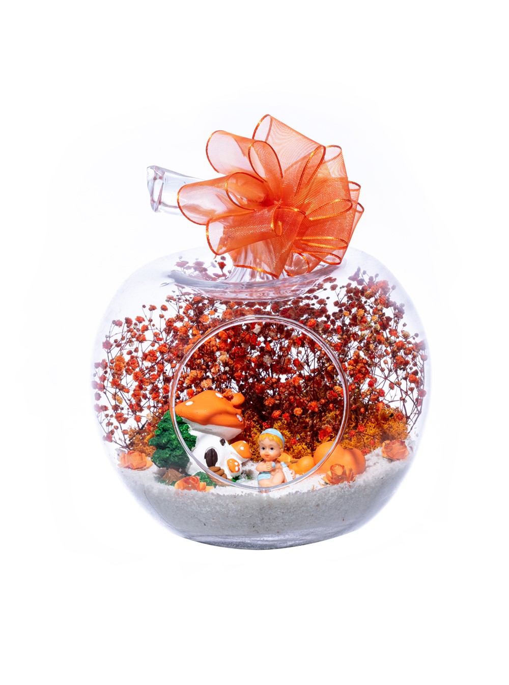 Üzerinde şık kurdelesiyle küçük boy elma cam fanus içerisinde tasarladığımız bu çok güzel teraryum; beyaz kum, şoklanmış yosunlar, kurutulmuş bitkiler, yapay güller, bir adet mantar ev, bir adet bir adet çiftli kalp ve bir adet erkek bebek obje kullanılarak tamamlanmıştır. Ev ve ofis ortamlarının tamamında sergilenebilir teraryumun içinde, kurutulmuş ve şoklanmış bitkiler bulunduğundan hava alması önemlidir. Açık olan kısmının kapatılmaması veya büfe vb. kapalı alanlara konulmaması gereklidir. Özellikle her ortamda yıllarca, zevkle izlenebilecek özel bir teraryumdur. Yaklaşık Ölçüleri: 20x20cm NOT: Teraryumlarda kullanılan camlar, üfleme cam işçiliğiyle üretildiğinden bazı detaylarda farklılıklar gözlenebilir. Örneğin, sap kısmı ve ağız bitiş noktalarının her biri kendine özgüdür.
