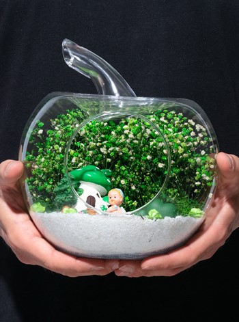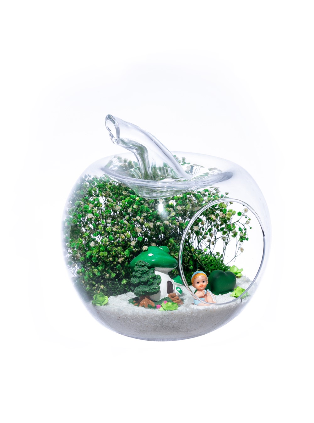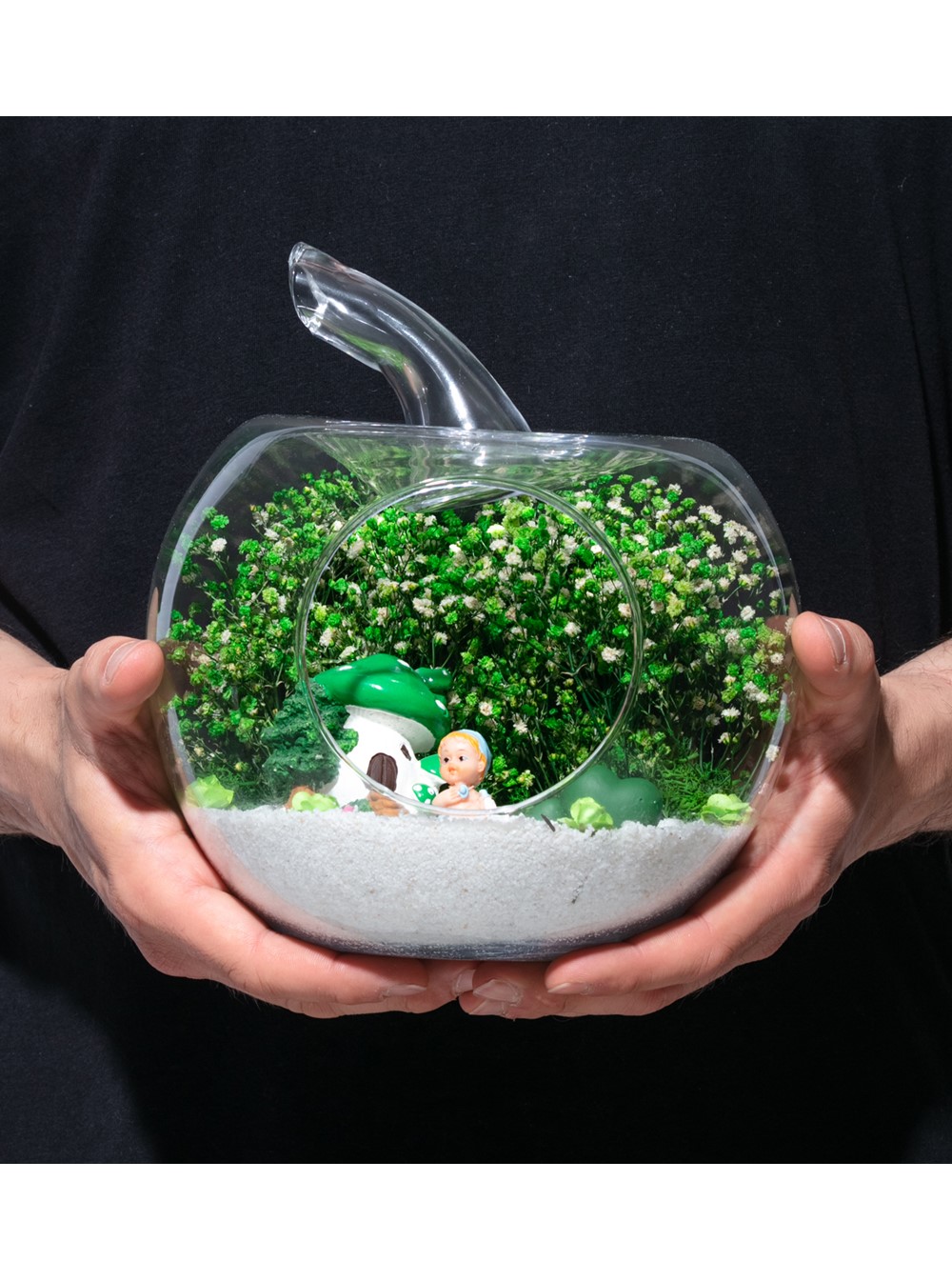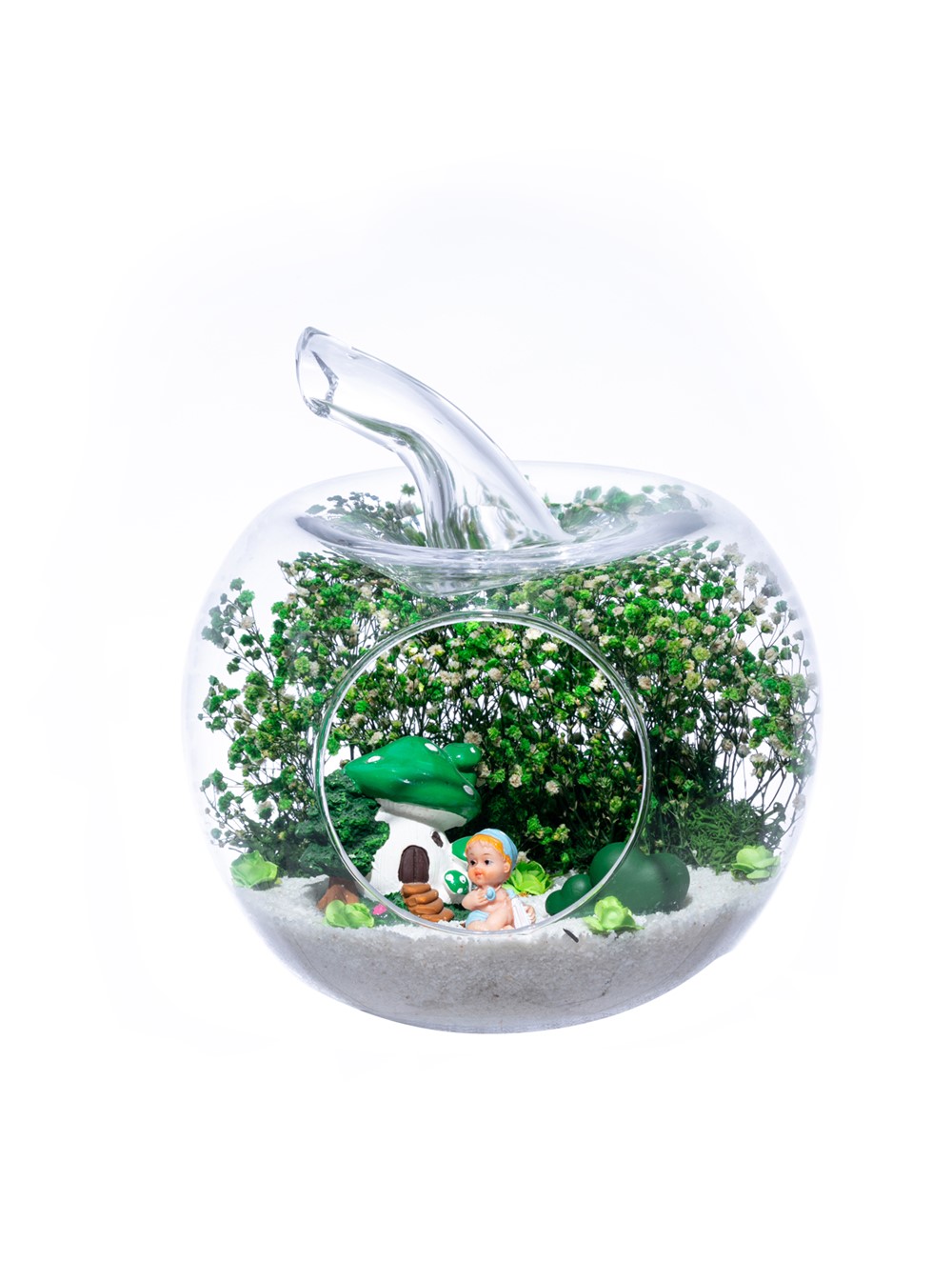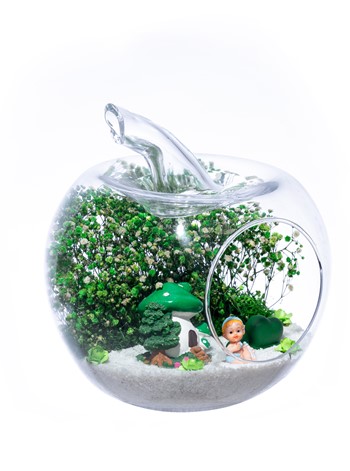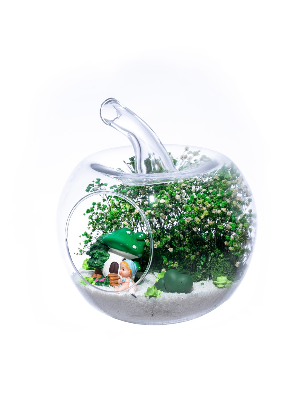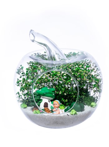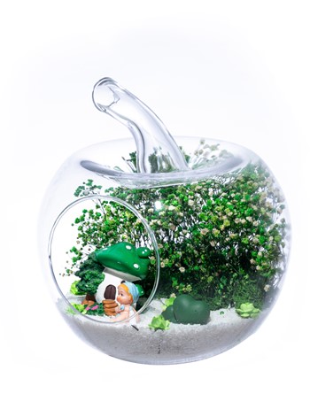 Küçük boy elma cam fanus içerisinde tasarladığımız bu çok güzel teraryum; beyaz kum, şoklanmış yosunlar, kurutulmuş bitkiler, yapay güller, bir adet mantar ev, bir adet çiftli kalp ve bir adet erkek bebek obje kullanılarak tamamlanmıştır. Ev ve ofis ortamlarının tamamında sergilenebilir teraryumun içinde, kurutulmuş ve şoklanmış bitkiler bulunduğundan hava alması önemlidir. Açık olan kısmının kapatılmaması veya büfe vb. kapalı alanlara konulmaması gereklidir. Özellikle her ortamda yıllarca, zevkle izlenebilecek özel bir teraryumdur. Yaklaşık Ölçüleri: 20x20cm NOT: Teraryumlarda kullanılan camlar, üfleme cam işçiliğiyle üretildiğinden bazı detaylarda farklılıklar gözlenebilir. Örneğin, sap kısmı ve ağız bitiş noktalarının her biri kendine özgüdür.