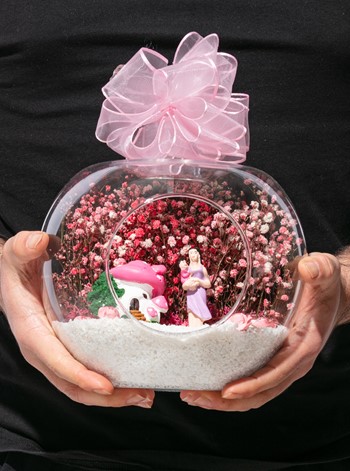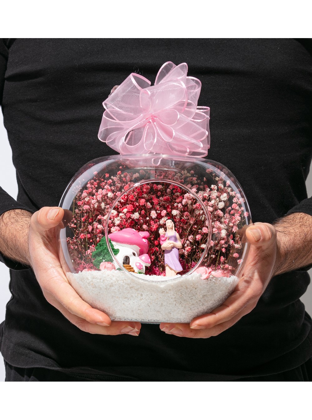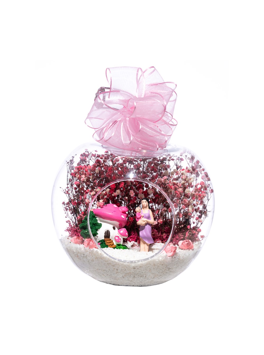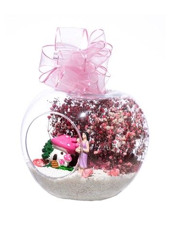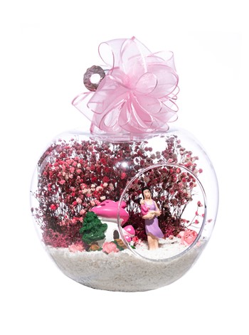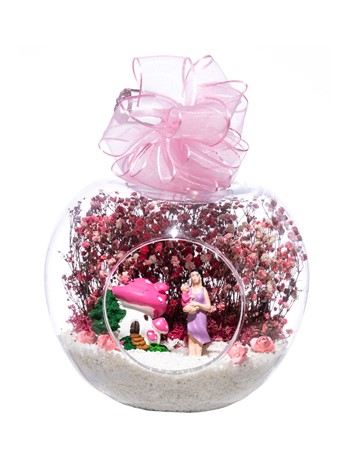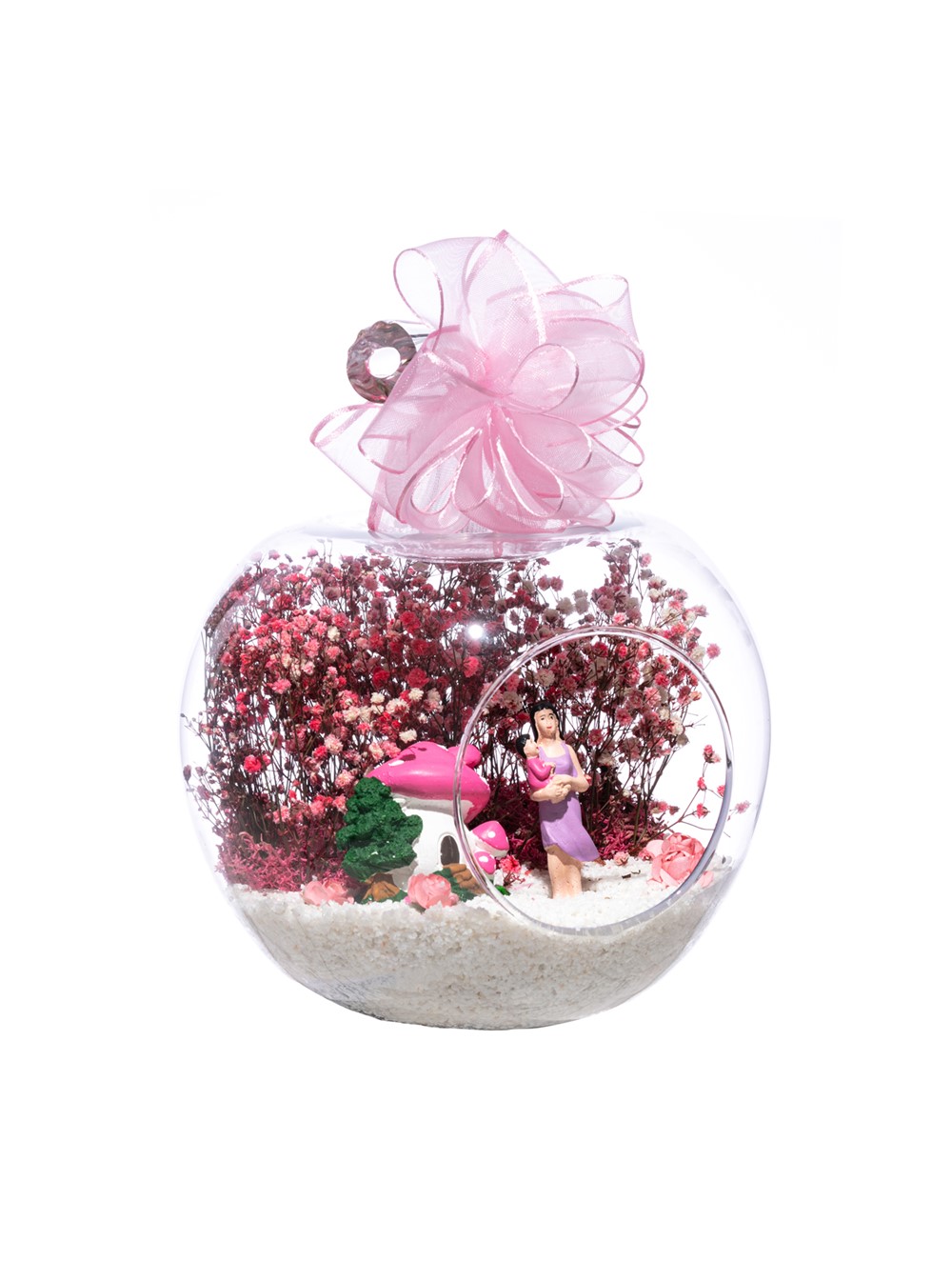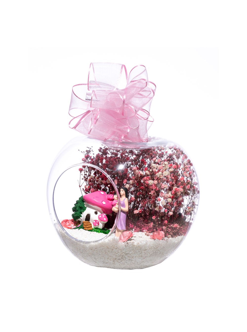 Üzerinde kurdelesiyle küçük boy elma cam fanus içerisinde tasarladığımız bu çok güzel teraryum; beyaz kum, şoklanmış yosunlar, kurutulmuş bitkiler, yapay güller, bir adet pembe mantar ev, annesinin kucağında bir adet kız bebek kullanılarak tamamlanmıştır. Ev ve ofis ortamlarının tamamında sergilenebilir teraryumun içinde, kurutulmuş ve şoklanmış bitkiler bulunduğundan hava alması önemlidir. Açık olan kısmının kapatılmaması veya büfe vb. kapalı alanlara konulmaması gereklidir. Özellikle her ortamda yıllarca, zevkle izlenebilecek özel bir teraryumdur. Yaklaşık Ölçüleri: 20x20cm NOT: Teraryumlarda kullanılan camlar, üfleme cam işçiliğiyle üretildiğinden bazı detaylarda farklılıklar gözlenebilir. Örneğin, sap kısmı ve ağız bitiş noktalarının her biri kendine özgüdür.