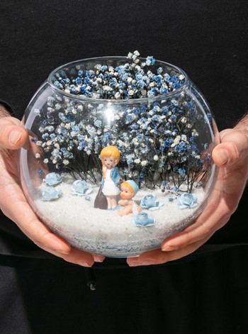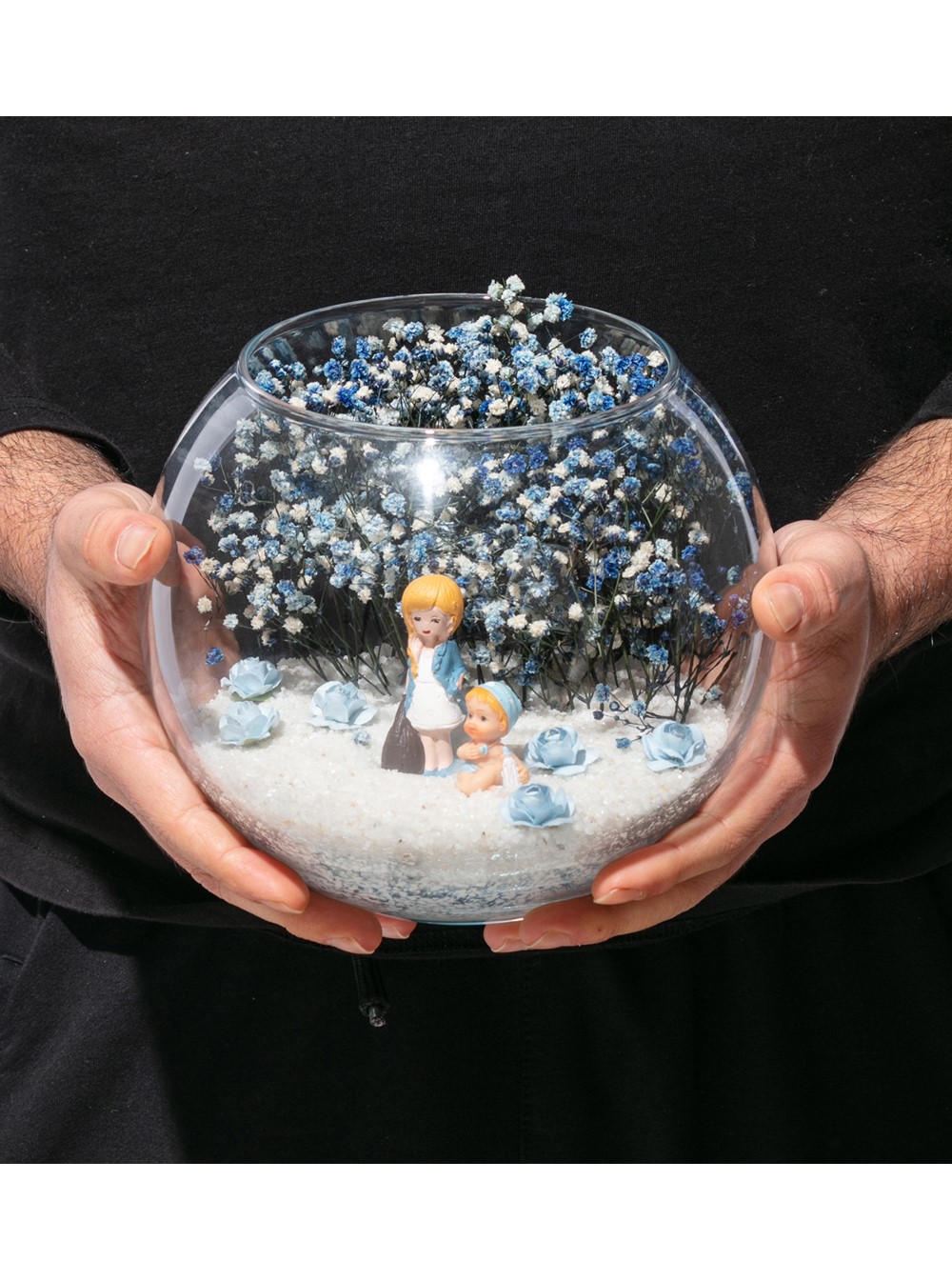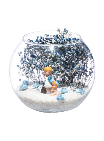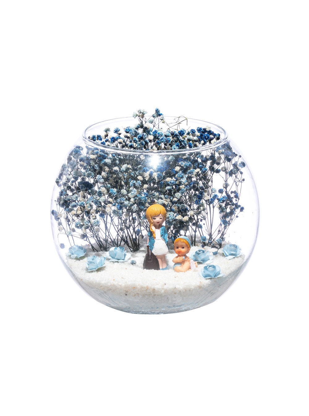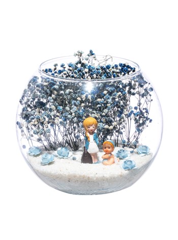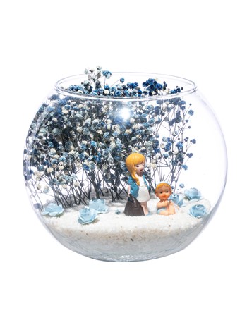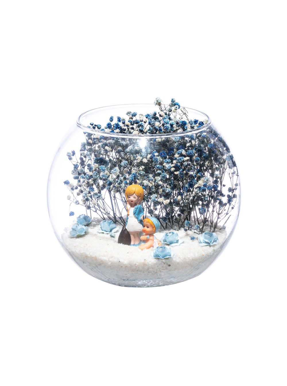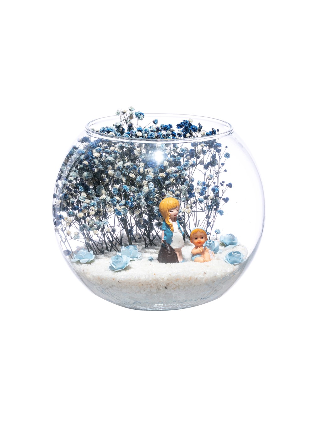 Küçük boy, Paşabahçe cam fanus içerisinde tasarladığımız bu güzel teraryum; beyaz kum, kurutulmuş bitkiler, yapay güller, bir adet erkek bebek ve yanında annesini simgeleyen kadın obje kullanılarak tamamlanmıştır. Ev ve ofis ortamlarının tamamında sergilenebilir teraryumun içinde kurutulmuş bitkiler bulunduğundan hava alması önemlidir. Açık olan kısmının kapatılmaması veya büfe vb. kapalı alanlara konulmaması gereklidir. Özellikle her ortamda yıllarca, zevkle izlenebilecek özel bir teraryumdur. Yaklaşık Ölçüleri: 16x18 cm