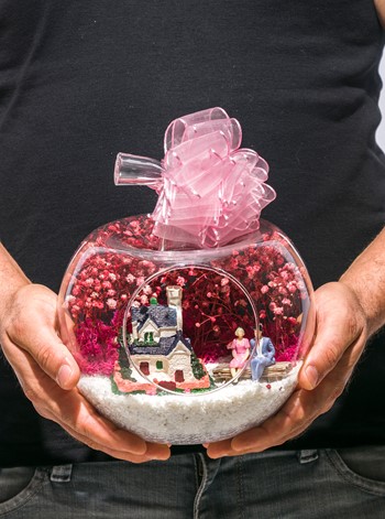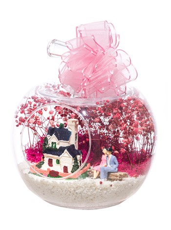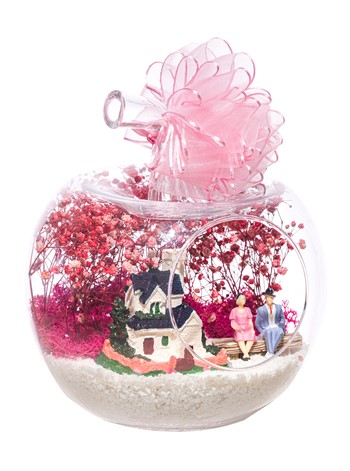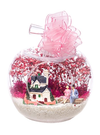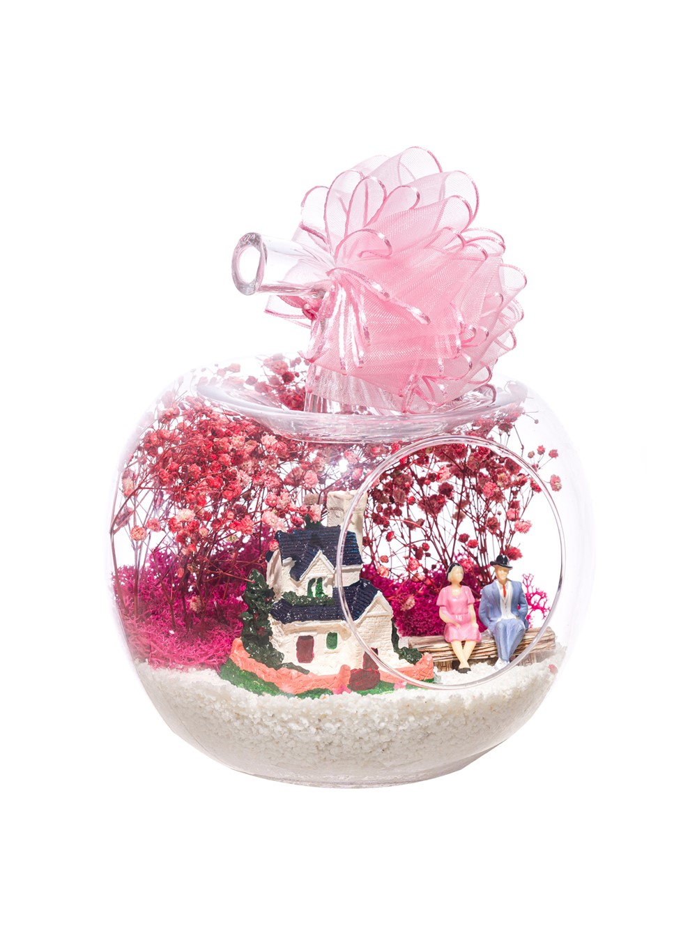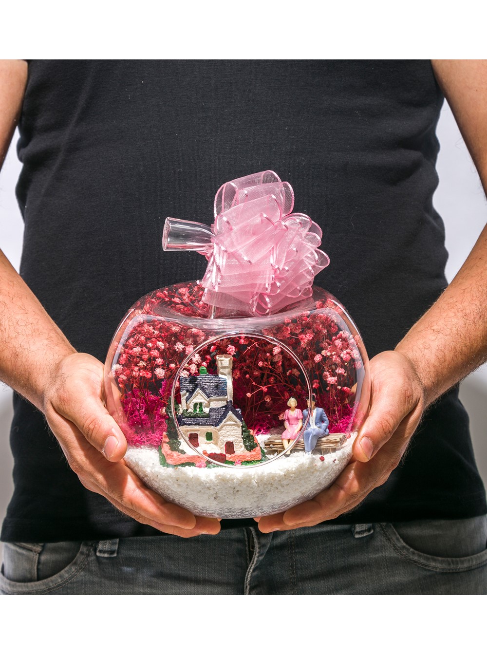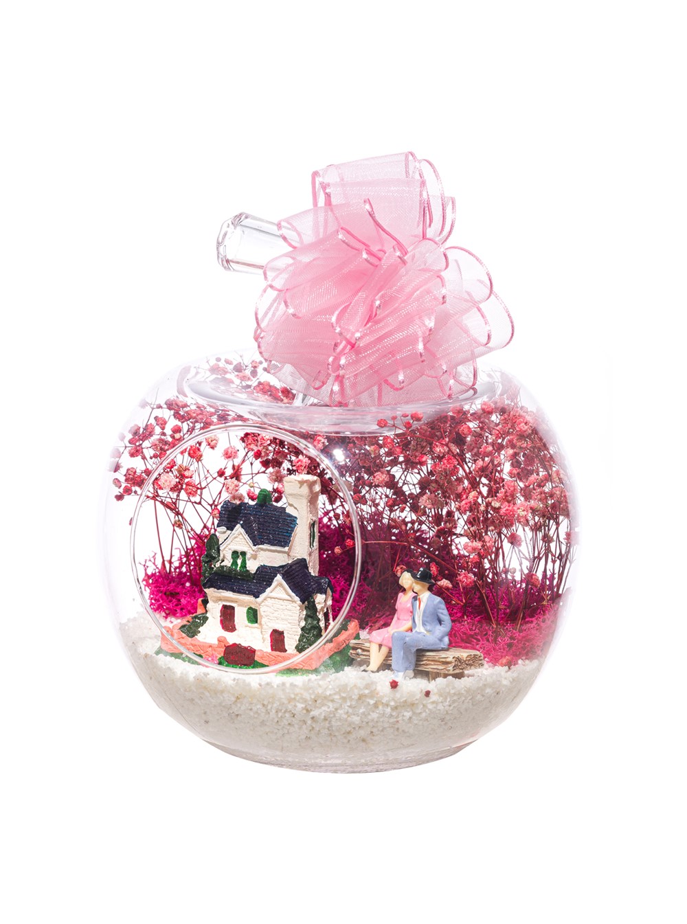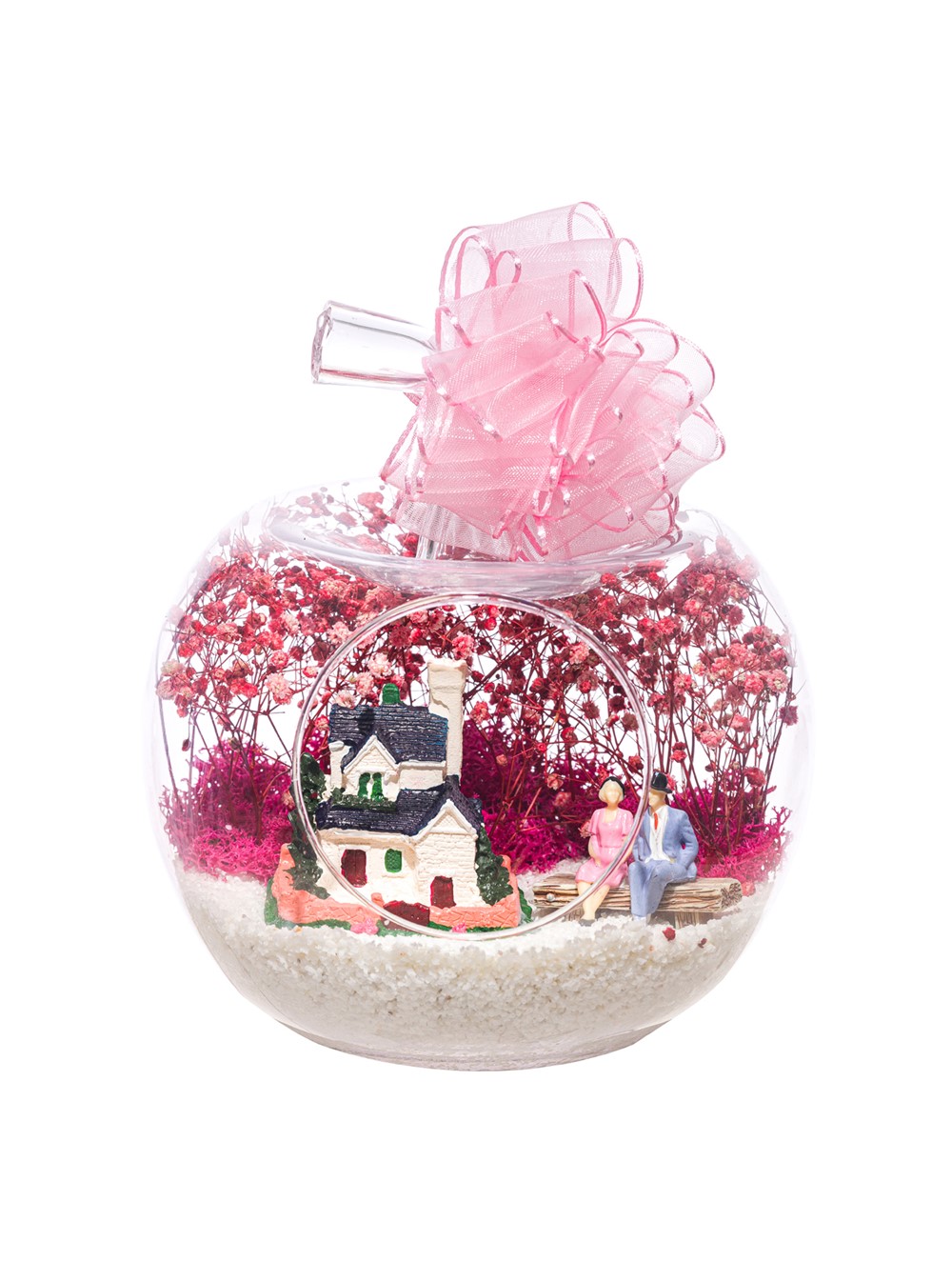 Kurdele takılı küçük boy elma cam fanus içerisinde tasarladığımız bu çok güzel teraryum; beyaz kum, şoklanmış yosunlar, kurutulmuş bitkiler, bir adet taş ev ve bahçede bankta yan yana sohbet eden yetişkinleri simgeleyen objelerle tamamlanmıştır. Ev ve ofis ortamlarının tamamında sergilenebilir teraryumun içinde, kurutulmuş ve şoklanmış bitkiler bulunduğundan hava alması önemlidir. Açık olan kısmının kapatılmaması veya büfe vb. kapalı alanlara konulmaması gereklidir. Özellikle her ortamda yıllarca, zevkle izlenebilecek özel bir teraryumdur. Yaklaşık Ölçüleri: 20x20cm NOT: Teraryumlarda kullanılan camlar, üfleme cam işçiliğiyle üretildiğinden bazı detaylarda farklılıklar gözlenebilir. Örneğin, sap kısmı ve ağız bitiş noktalarının her biri kendine özgüdür. Teraryum Huzur Dolu Pembe Bahçe