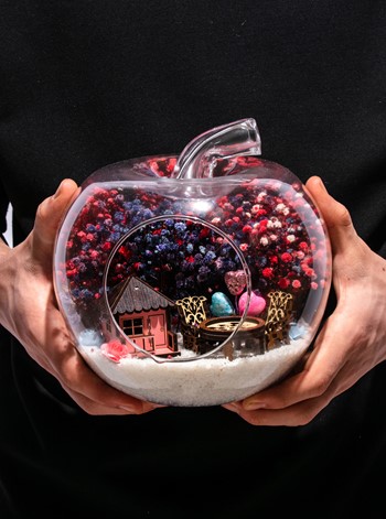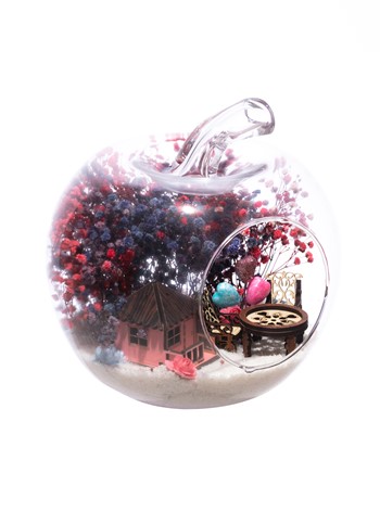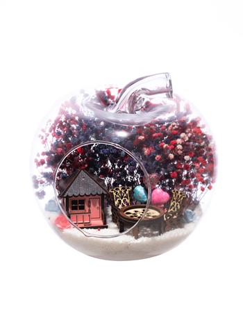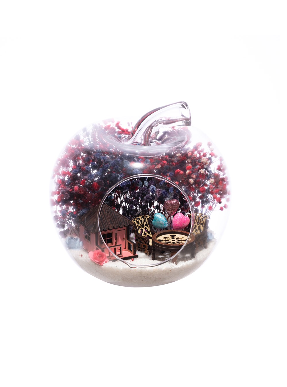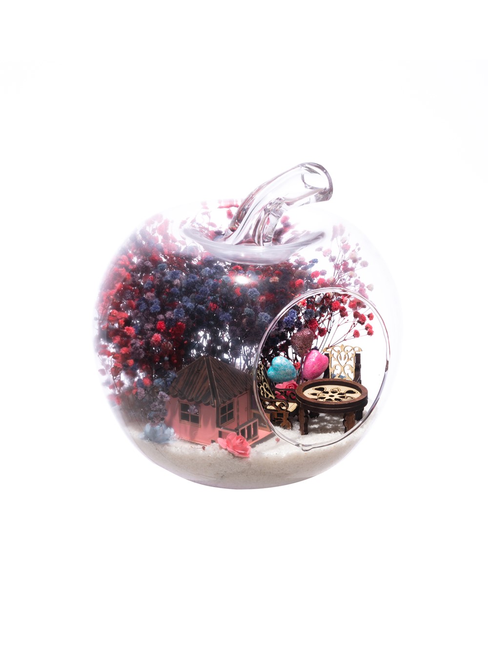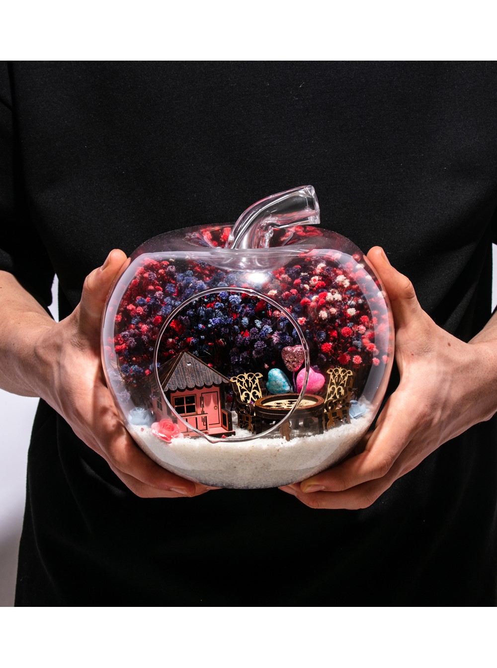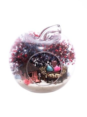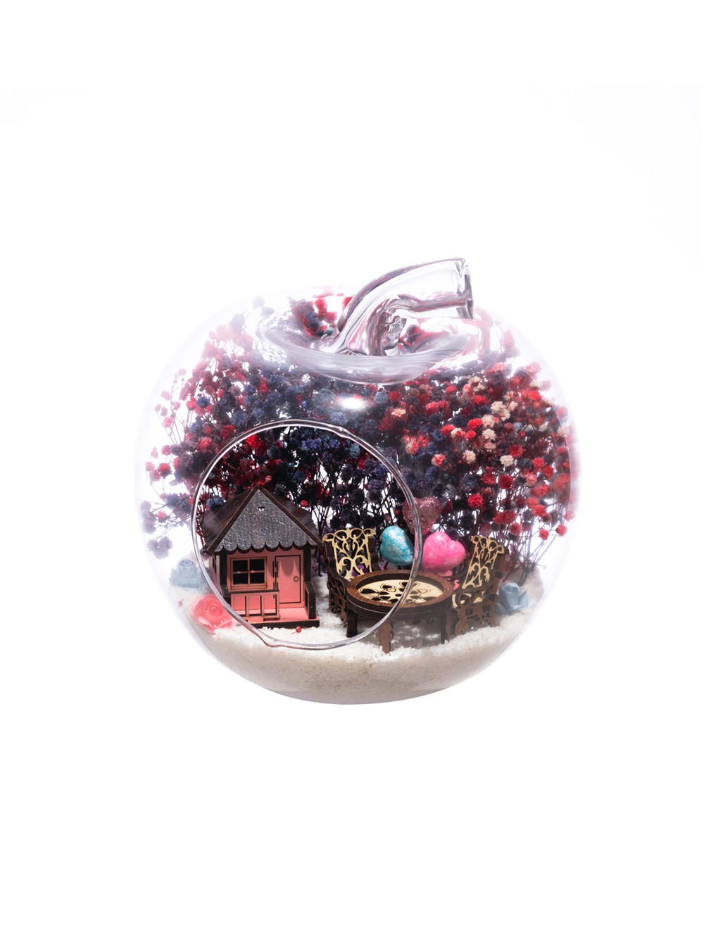 Küçük boy elma cam fanus içerisinde tasarladığımız bu çok güzel teraryum; beyaz kum, karışık renkli kurutulmuş bitkiler, renkli yapay mini güller, renkli simli kalpler, bir adet ahşap ev, iki adet sandalyesi ve masasıyla bahçe mobilyalarını simgeleyen objeler kullanılarak tamamlanmıştır. Ev ve ofis ortamlarının tamamında sergilenebilir teraryumun içinde, kurutulmuş bitkiler bulunduğundan hava alması önemlidir. Açık olan kısmının kapatılmaması veya büfe vb. kapalı alanlara konulmaması gereklidir. Özellikle her ortamda yıllarca, zevkle izlenebilecek özel bir teraryumdur. Yaklaşık Ölçüleri: 20x20cm NOT: Teraryumlarda kullanılan camlar, üfleme cam işçiliğiyle üretildiğinden bazı detaylarda farklılıklar gözlenebilir. Örneğin, sap kısmı ve ağız bitiş noktalarının her biri kendine özgüdür.