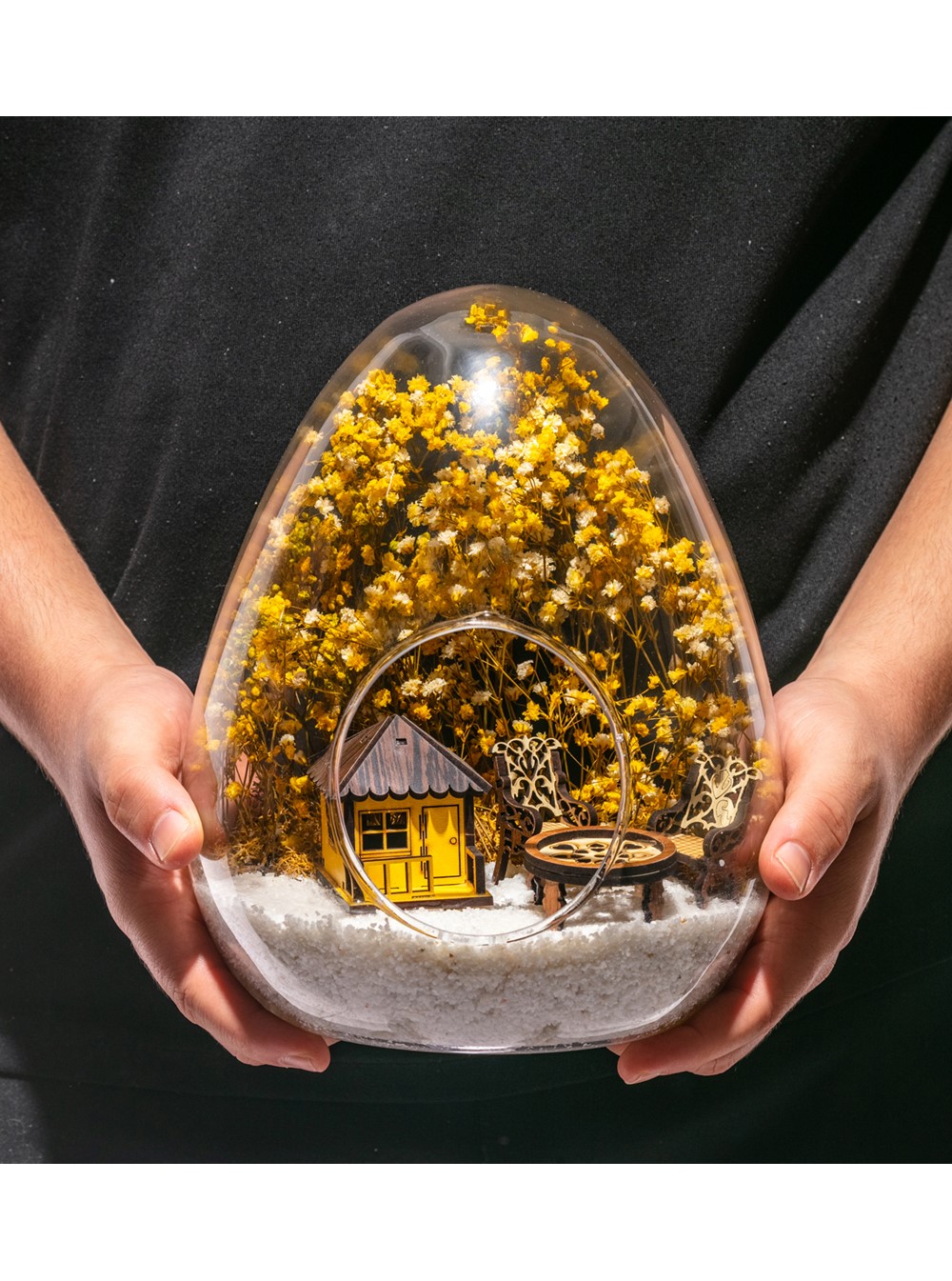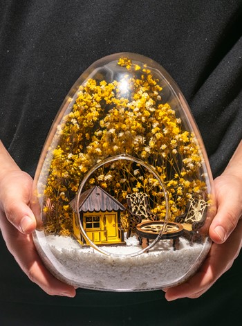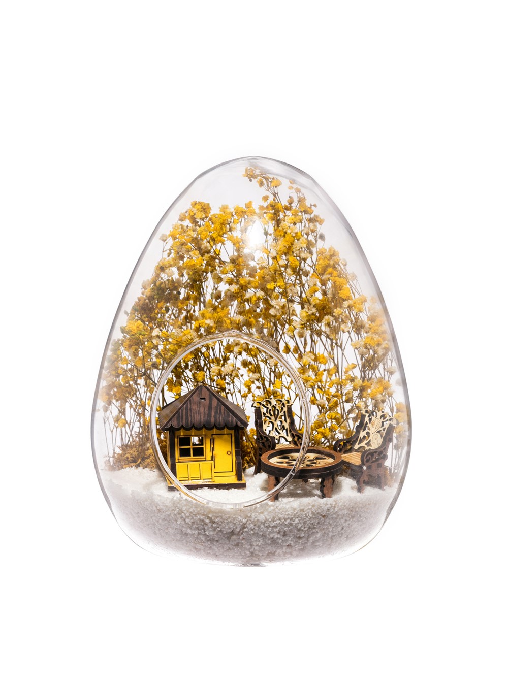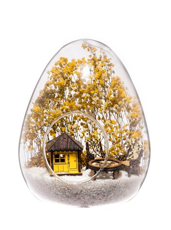 Küçük boy yumurta cam fanus içerisinde tasarladığımız bu güzel teraryum; beyaz kum, kurutulmuş bitkiler, şoklanmış yosunlar, bir adet ahşap sarı ev görseli, iki adet ahşap bahçe sandalyesi ve bir ahşap bahçe masası kullanılarak tamamlanmıştır. Ev ve ofis ortamlarının tamamında sergilenebilir teraryumun içinde, kurutulmuş ve şoklanmış bitkiler bulunduğundan hava alması önemlidir. Açık olan kısmının kapatılmaması veya büfe vb. kapalı alanlara konulmaması gereklidir. Özellikle her ortamda yıllarca, zevkle izlenebilecek özel bir teraryumdur. Yaklaşık Ölçüleri: 18x22cm NOT: Teraryumlarda kullanılan camlar, üfleme cam işçiliğiyle üretildiğinden bazı detaylarda farklılıklar gözlenebilir. Örneğin, yumurta şekli ve ağız bitiş noktalarının her biri kendine özgüdür.