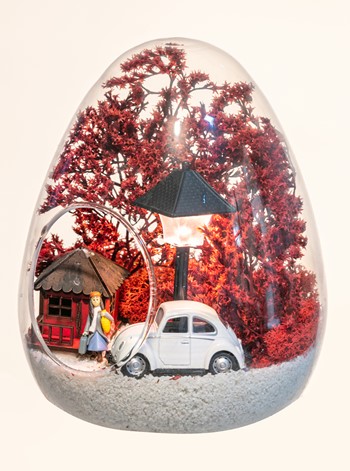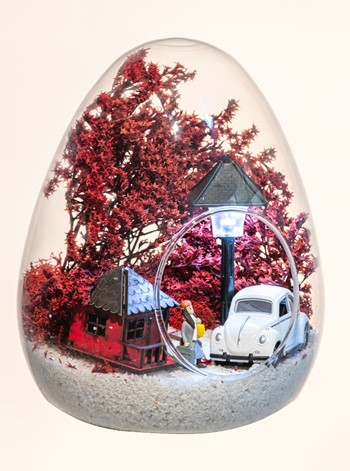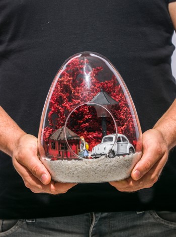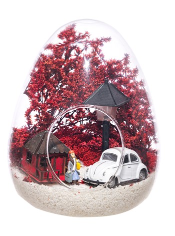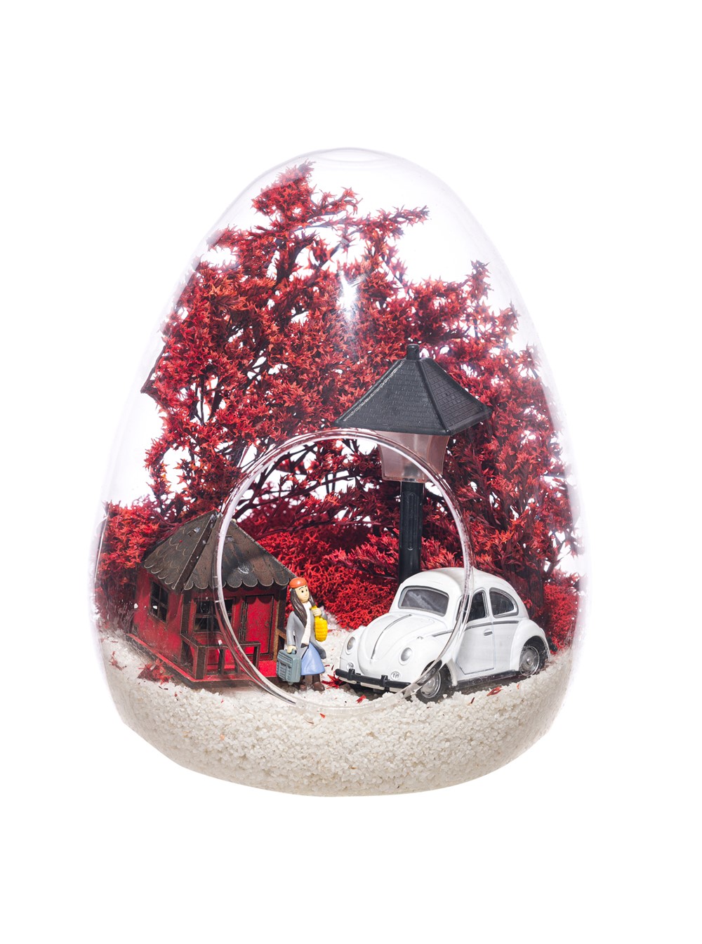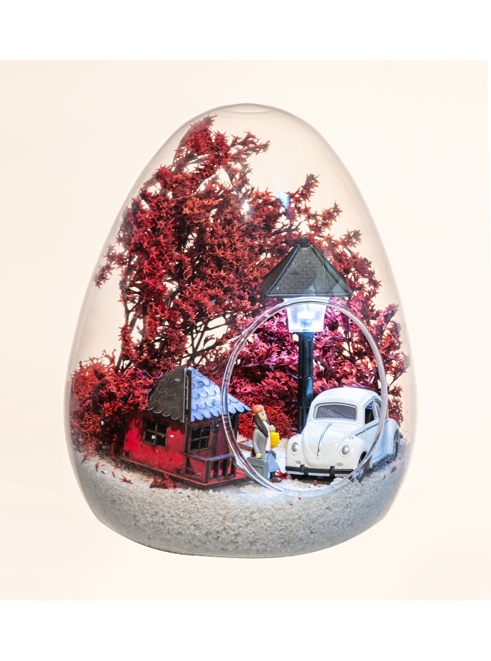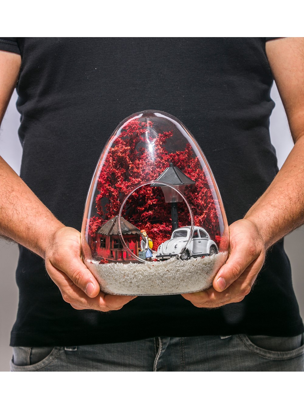 Küçük boy yumurta cam fanus içerisinde tasarladığımız bu güzel teraryum; beyaz kum, kurutulmuş bitkiler, şoklanmış yosunlar, mini güller, bir adet ışığı iki farklı renkte yanan lamba, bir adet kırmızı ahşap, bir adet otomobil ve iş seyahatine çıkmaya hazırlanan iş kadınını simgeleyen objelerle tamamlanmıştır. Ev ve ofis ortamlarının tamamında sergilenebilir teraryumun içinde, kurutulmuş ve şoklanmış bitkiler bulunduğundan hava alması önemlidir. Açık olan kısmının kapatılmaması veya büfe vb. kapalı alanlara konulmaması gereklidir. Özellikle her ortamda yıllarca, zevkle izlenebilecek özel bir teraryumdur. Yaklaşık Ölçüleri: 18x22cm NOT: Teraryumlarda kullanılan camlar, üfleme cam işçiliğiyle üretildiğinden bazı detaylarda farklılıklar gözlenebilir. Örneğin, sap kısmı ve ağız bitiş noktalarının her biri kendine özgüdür.