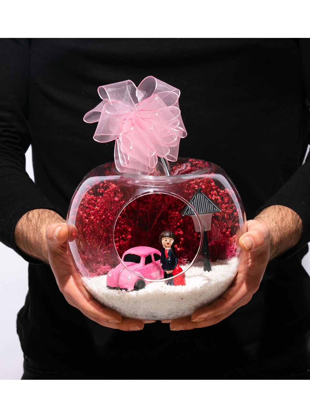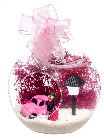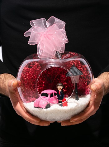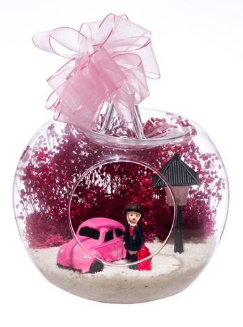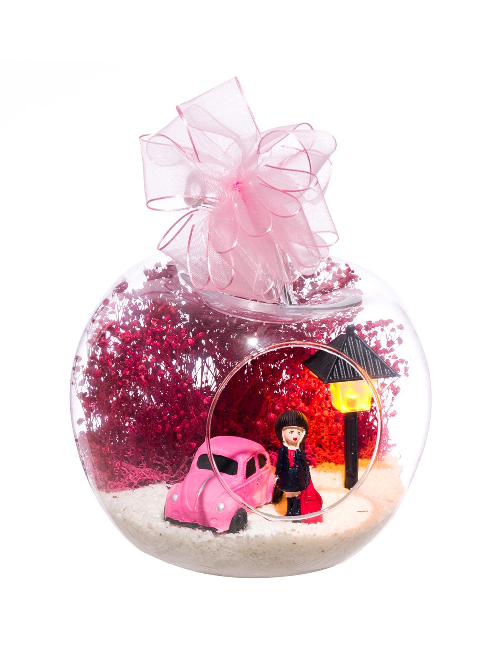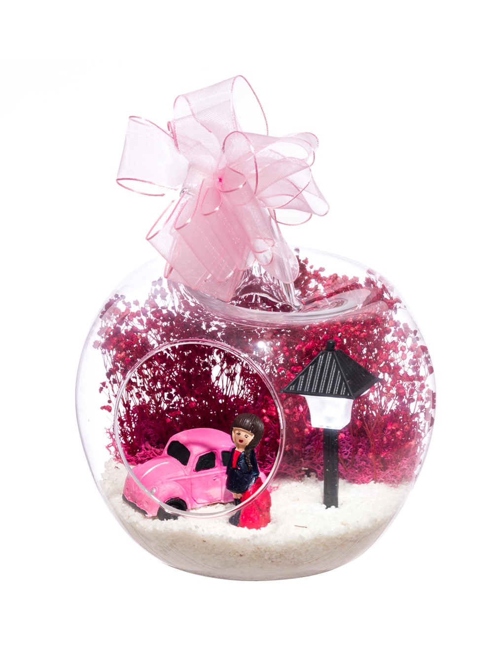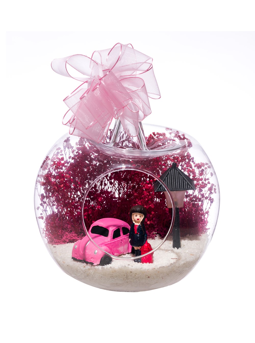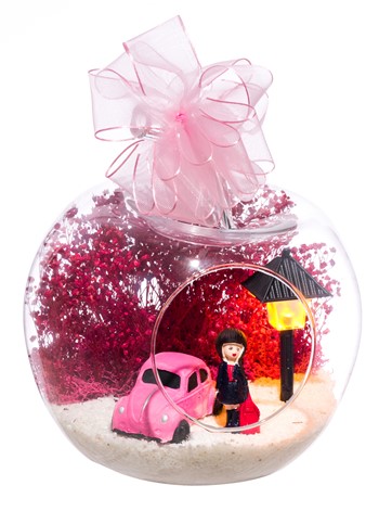 Kurdele takılı küçük boy elma cam fanus içerisinde tasarladığımız bu çok güzel teraryum; beyaz kum, şoklanmış yosunlar, kurutulmuş bitkiler, bir adet otomobil görseli, bir adet ışığı iki farklı renkte yanan led sokak lambası ve bir adet kumral iş kadınını simgeleyen obje ile tamamlanmıştır. Ev ve ofis ortamlarının tamamında sergilenebilir teraryumun içinde, kurutulmuş ve şoklanmış bitkiler bulunduğundan hava alması önemlidir. Açık olan kısmının kapatılmaması veya büfe vb. kapalı alanlara konulmaması gereklidir. Özellikle her ortamda yıllarca, zevkle izlenebilecek özel bir teraryumdur. Yaklaşık Ölçüleri: 20x20cm NOT: Teraryumlarda kullanılan camlar, üfleme cam işçiliğiyle üretildiğinden bazı detaylarda farklılıklar gözlenebilir. Örneğin, sap kısmı ve ağız bitiş noktalarının her biri kendine özgüdür.