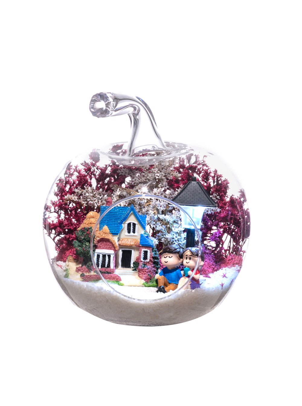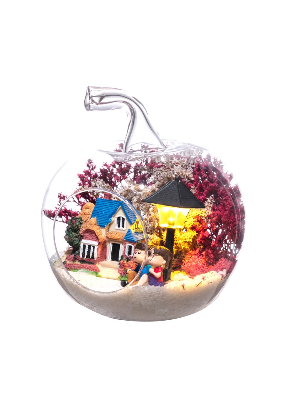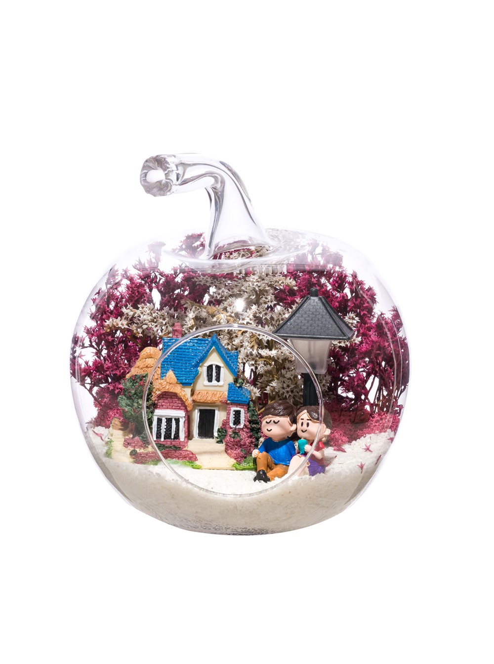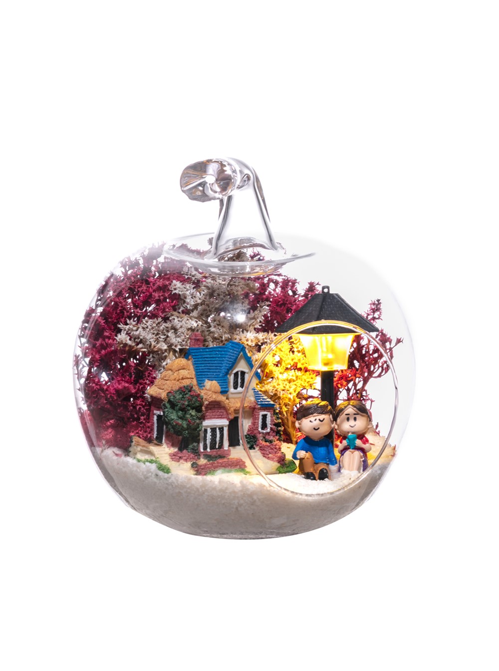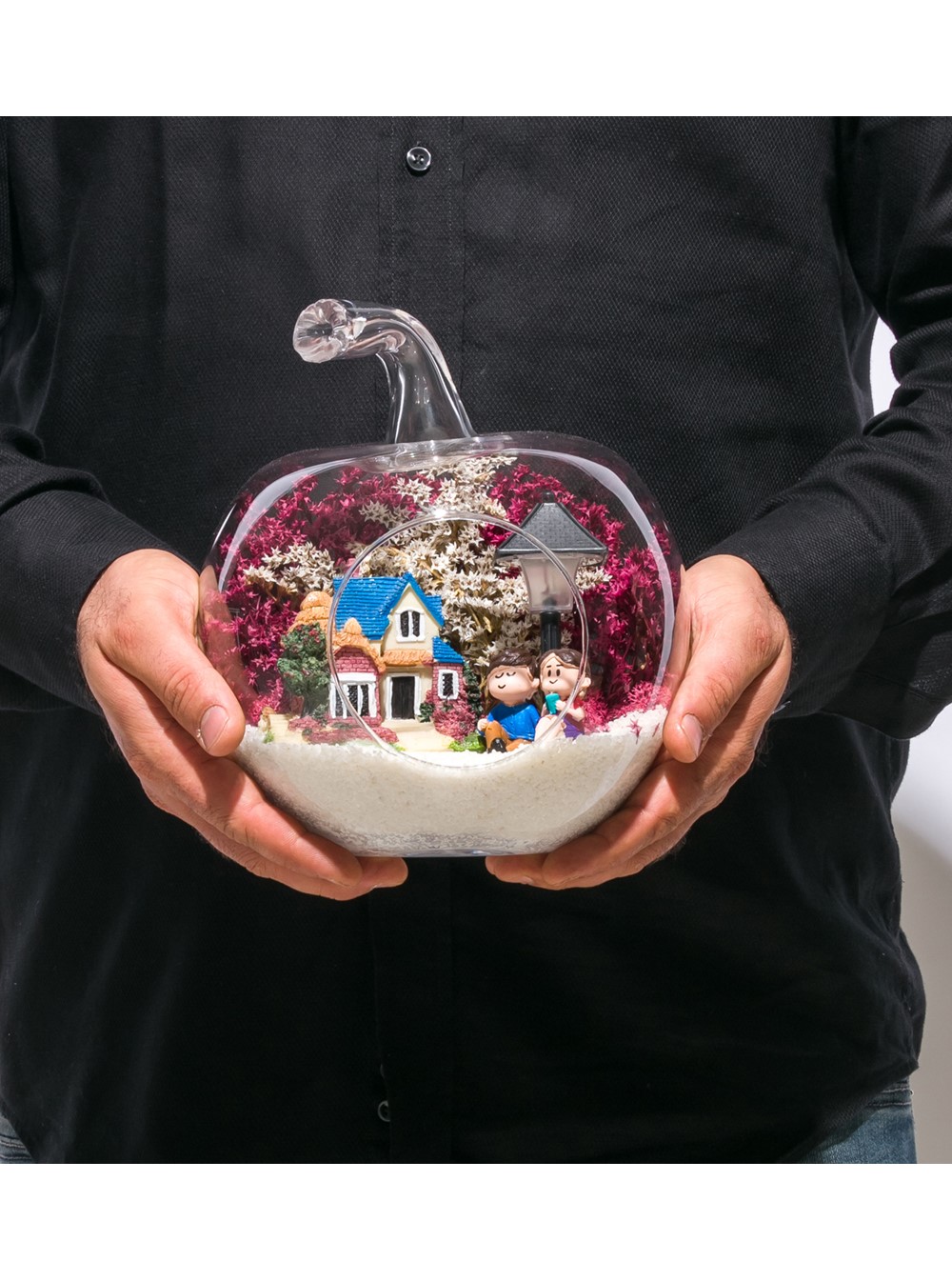 Küçük boy elma cam fanus içerisinde tasarladığımız bu çok güzel teraryum; beyaz kum, şoklanmış yosunlar, kurutulmuş bitkiler, bir adet ışığı iki farklı renkte yanan led sokak lambası görseli, bir adet kır evi ve yan yana bahçelerinde sohbet eden aşıklar görseli kullanılarak tamamlanmıştır. Ev ve ofis ortamlarının tamamında sergilenebilir teraryumun içinde, kurutulmuş ve şoklanmış bitkiler bulunduğundan hava alması önemlidir. Açık olan kısmının kapatılmaması veya büfe vb. kapalı alanlara konulmaması gereklidir. Özellikle her ortamda yıllarca, zevkle izlenebilecek özel bir teraryumdur. Yaklaşık Ölçüleri: 20x20cm NOT: Teraryumlarda kullanılan camlar, üfleme cam işçiliğiyle üretildiğinden bazı detaylarda farklılıklar gözlenebilir. Örneğin, sap kısmı ve ağız bitiş noktalarının her biri kendine özgüdür.