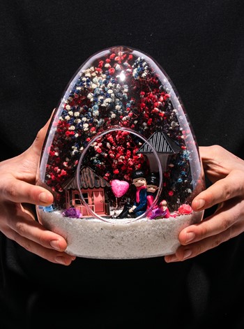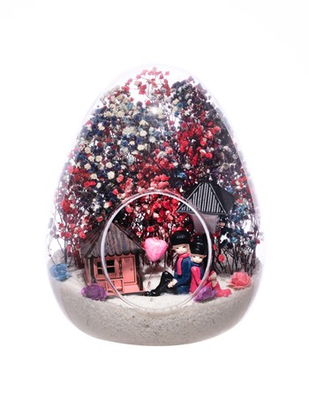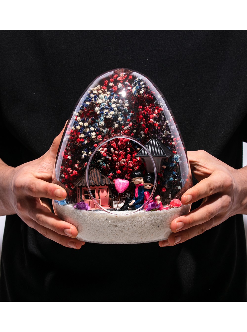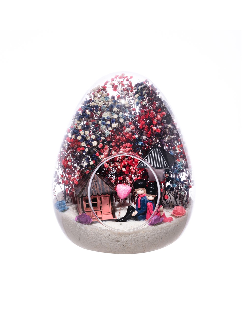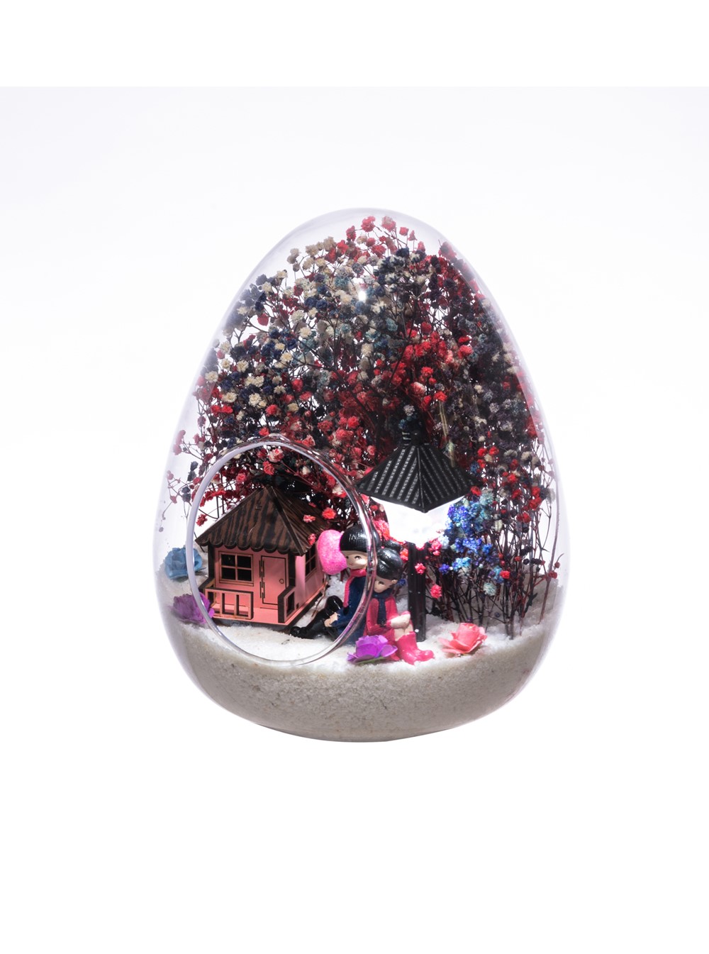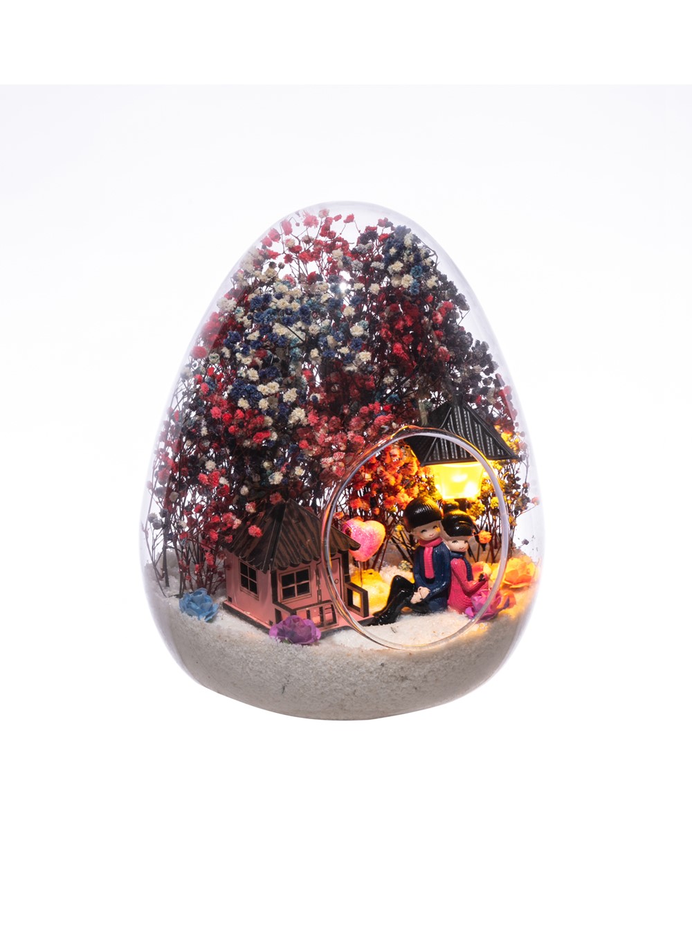 Küçük boy yumurta cam fanus içerisinde tasarladığımız bu güzel teraryum; beyaz kum, karışık renkli kurutulmuş bitkiler, renkli mini yapay güller, simli kalp, bir adet ahşap ev, bir adet ışığı iki farklı renkte yanan led sokak lambası görseli ve bir adet sırt sırta anın tadını çıkartan sevgilileri simgeleyen obje ile kurgulanmıştır. Ev ve ofis ortamlarının tamamında sergilenebilir teraryumun içinde, kurutulmuş bitkiler bulunduğundan hava alması önemlidir. Açık olan kısmının kapatılmaması veya büfe vb. kapalı alanlara konulmaması gereklidir. Özellikle her ortamda yıllarca, zevkle izlenebilecek özel bir teraryumdur. Yaklaşık Ölçüleri: 18x22cm NOT: Teraryumlarda kullanılan camlar, üfleme cam işçiliğiyle üretildiğinden bazı detaylarda farklılıklar gözlenebilir. Örneğin, yumurta şekli ve ağız bitiş noktalarının her biri kendine özgüdür.