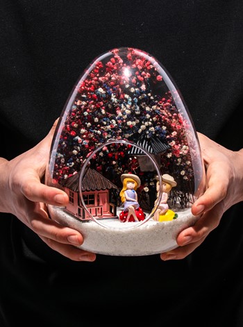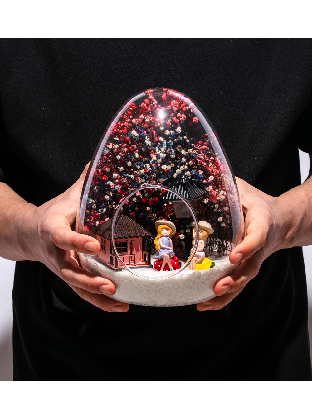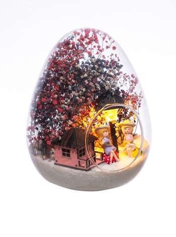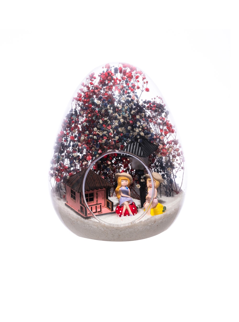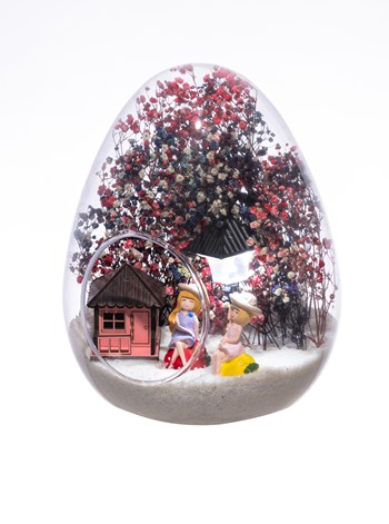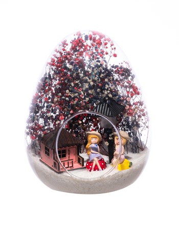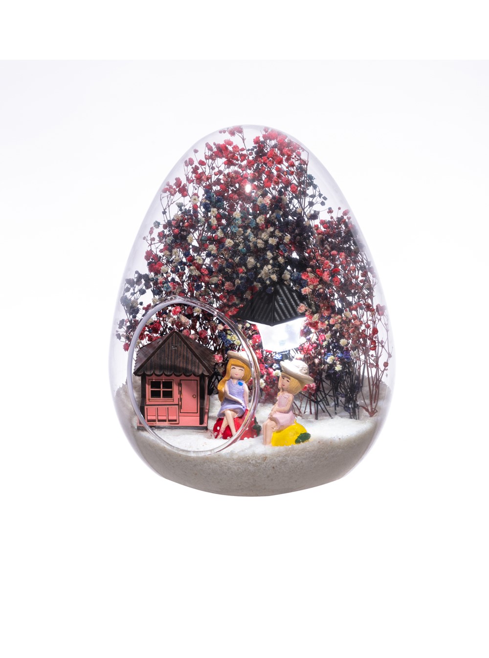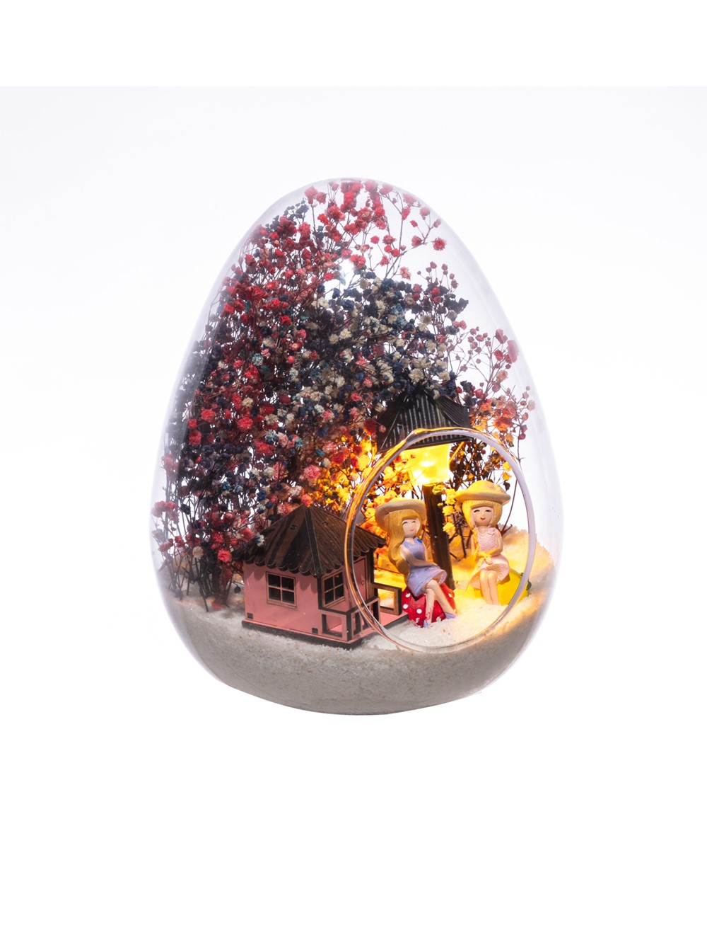 Küçük boy yumurta cam fanus içerisinde tasarladığımız, bu özgün teraryum; beyaz kum, karışık renkli kurutulmuş bitkiler, bir adet ahşap ev, bir adet ışığı iki farklı renkte yanan lamba ve yan yana sohbet eden genç kızları simgeleyen objeler kullanılarak tamamlanmıştır. Ev ve ofis ortamlarının tamamında sergilenebilir teraryumun içinde, kurutulmuş ve şoklanmış bitkiler olduğundan hava alması önemlidir. Açık olan kısmının kapatılmaması veya büfe vb. kapalı alanlara konulmaması gereklidir. Özellikle her ortamda yıllarca, zevkle izlenebilecek özel bir teraryumdur. Yaklaşık Ölçüleri: 18x22cm NOT: Teraryumlarda kullanılan camlar, üfleme cam işçiliğiyle üretildiğinden bazı detaylarda farklılıklar gözlenebilir. Örneğin, ağız bitiş noktalarının her biri kendine özgüdür.