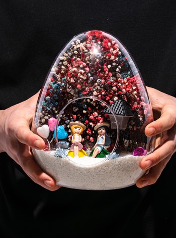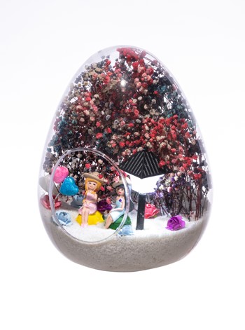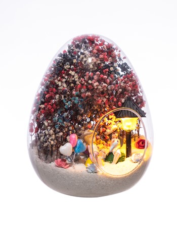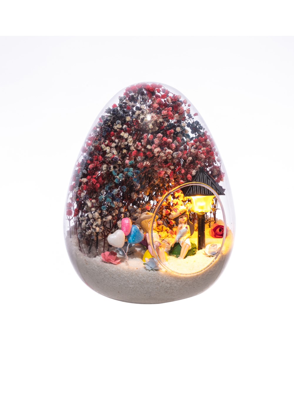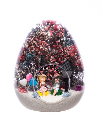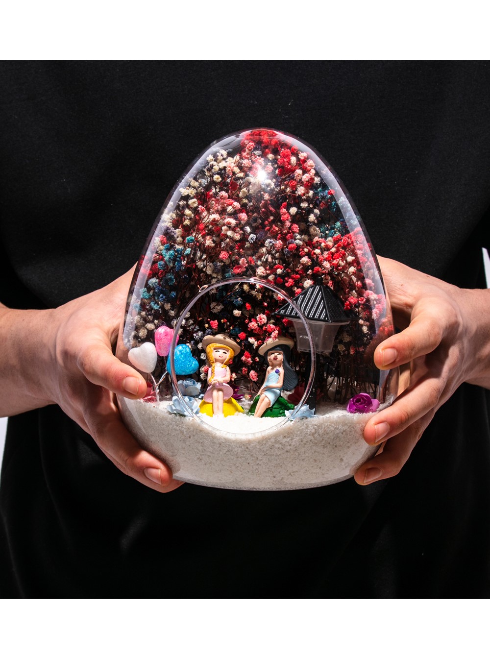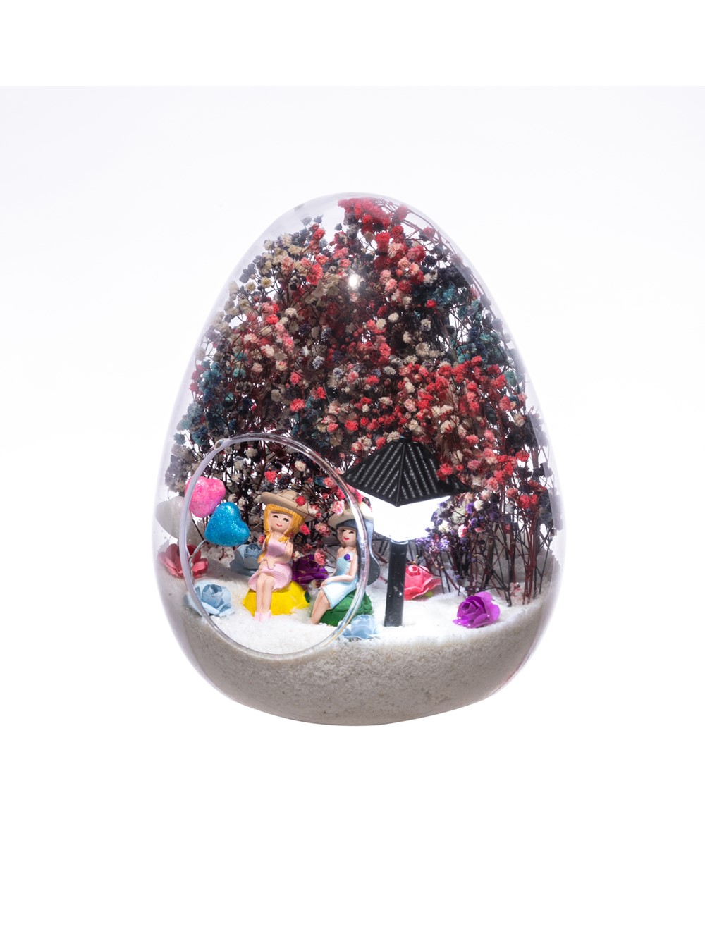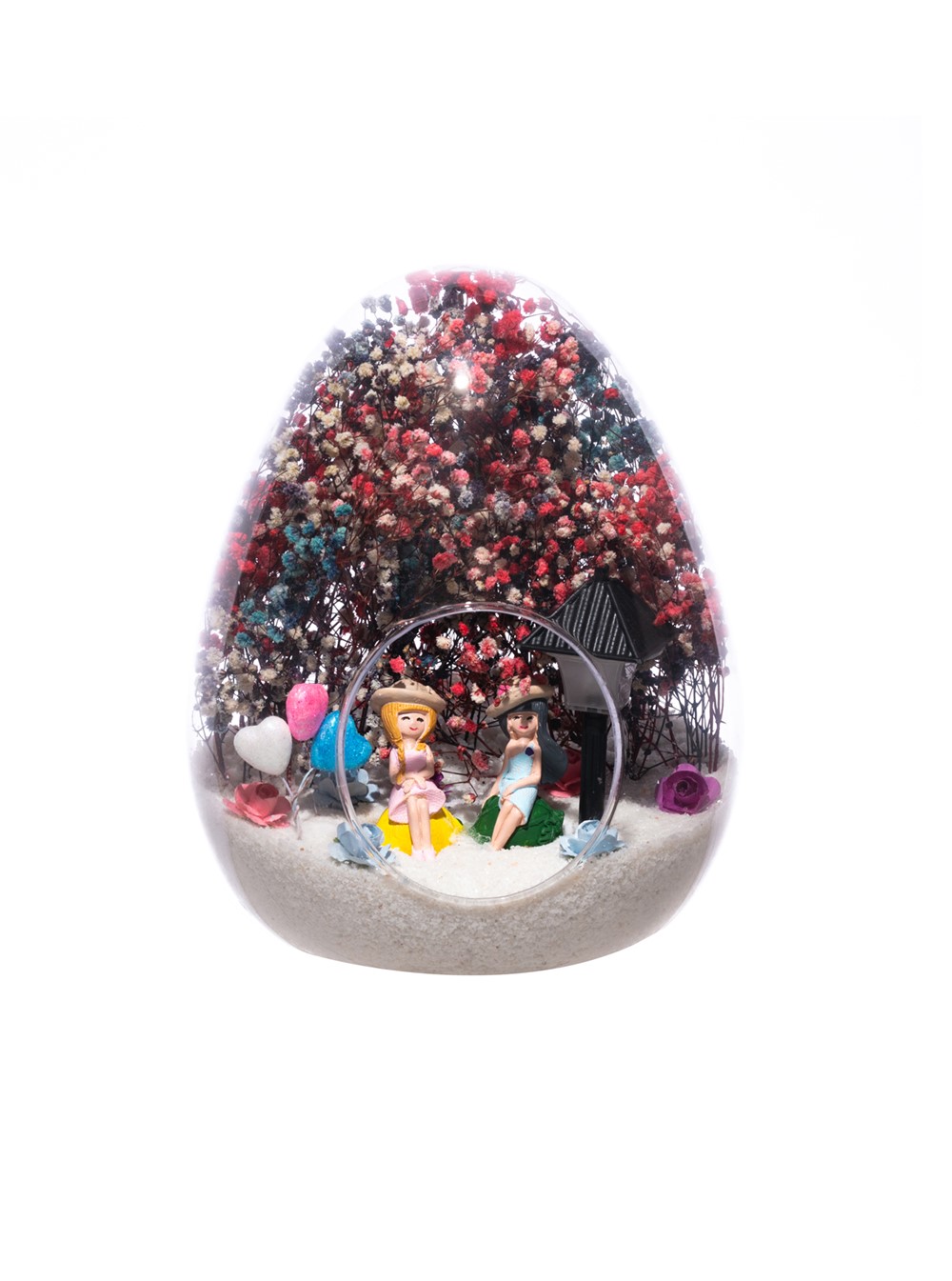 Küçük boy yumurta cam fanus içerisinde tasarladığımız, bu özgün teraryum; beyaz kum, karışık renkli kurutulmuş bitkiler, renkli mini yapay güller, renkli simli kalpler, bir adet ışığı iki farklı renkte yanan lamba ve bahçede yan yana sohbet eden bir çift genç kızı simgeleyen objeler kullanılarak tamamlanmıştır. Ev ve ofis ortamlarının tamamında sergilenebilir teraryumun içinde, kurutulmuş ve şoklanmış bitkiler olduğundan hava alması önemlidir. Açık olan kısmının kapatılmaması veya büfe vb. kapalı alanlara konulmaması gereklidir. Özellikle her ortamda yıllarca, zevkle izlenebilecek özel bir teraryumdur. Yaklaşık Ölçüleri: 18x22cm NOT: Teraryumlarda kullanılan camlar, üfleme cam işçiliğiyle üretildiğinden bazı detaylarda farklılıklar gözlenebilir. Örneğin, ağız bitiş noktalarının her biri kendine özgüdür.