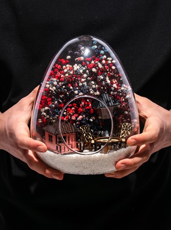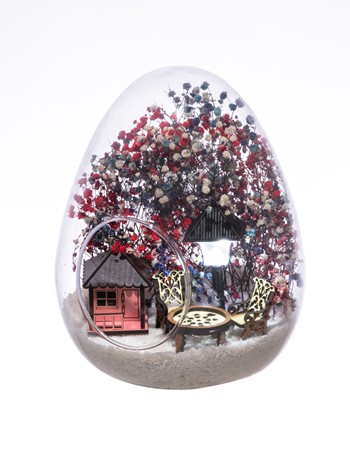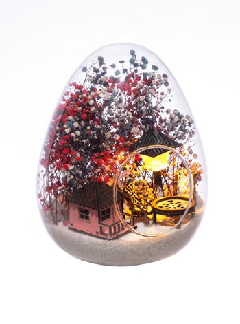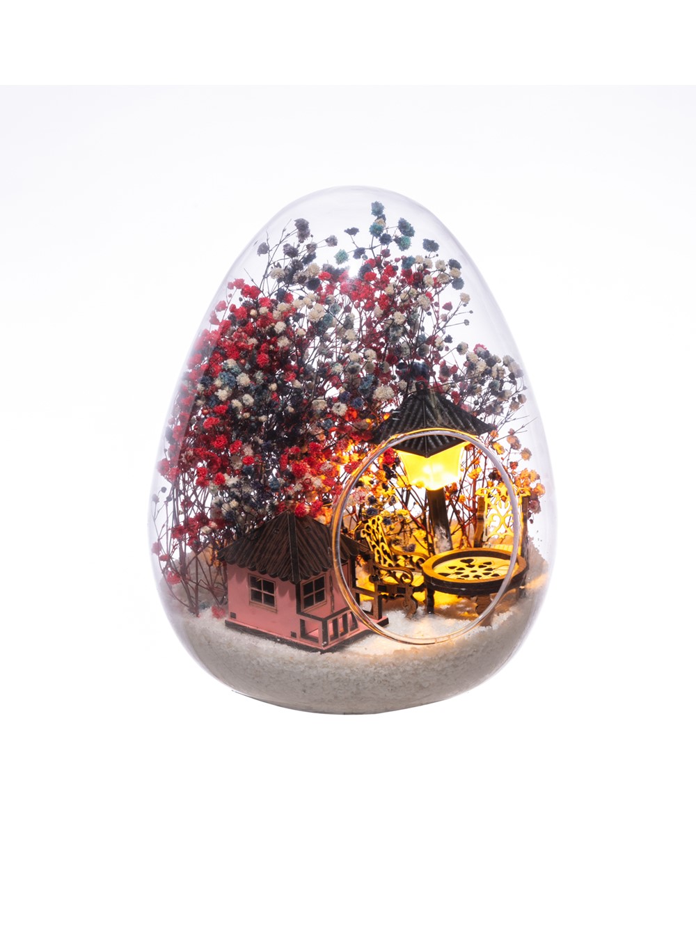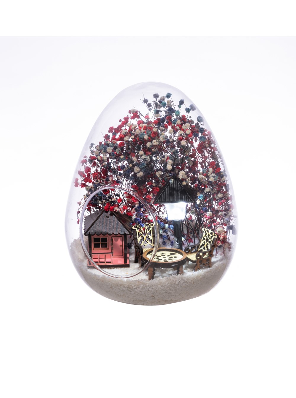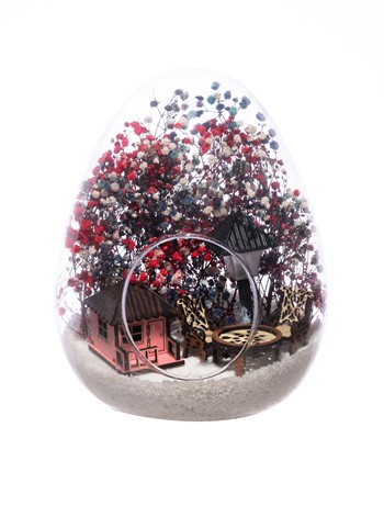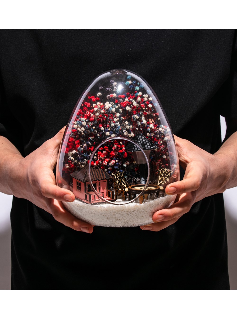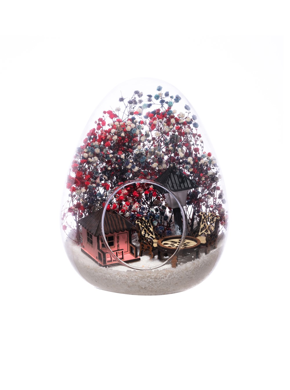 Küçük boy yumurta cam fanus içerisinde tasarladığımız, bu özgün teraryum; beyaz kum, karışık renkli kurutulmuş bitkiler, bir adet ahşap ev, bir adet ışığı iki farklı renkte yanan lamba, iki adet sandalye ve sehpasıyla bahçe mobilyalarını simgeleyen objeler kullanılarak tamamlanmıştır. Ev ve ofis ortamlarının tamamında sergilenebilir teraryumun içinde, kurutulmuş ve şoklanmış bitkiler olduğundan hava alması önemlidir. Açık olan kısmının kapatılmaması veya büfe vb. kapalı alanlara konulmaması gereklidir. Özellikle her ortamda yıllarca, zevkle izlenebilecek özel bir teraryumdur. Yaklaşık Ölçüleri: 18x22cm NOT: Teraryumlarda kullanılan camlar, üfleme cam işçiliğiyle üretildiğinden bazı detaylarda farklılıklar gözlenebilir. Örneğin, ağız bitiş noktalarının her biri kendine özgüdür.