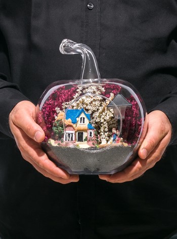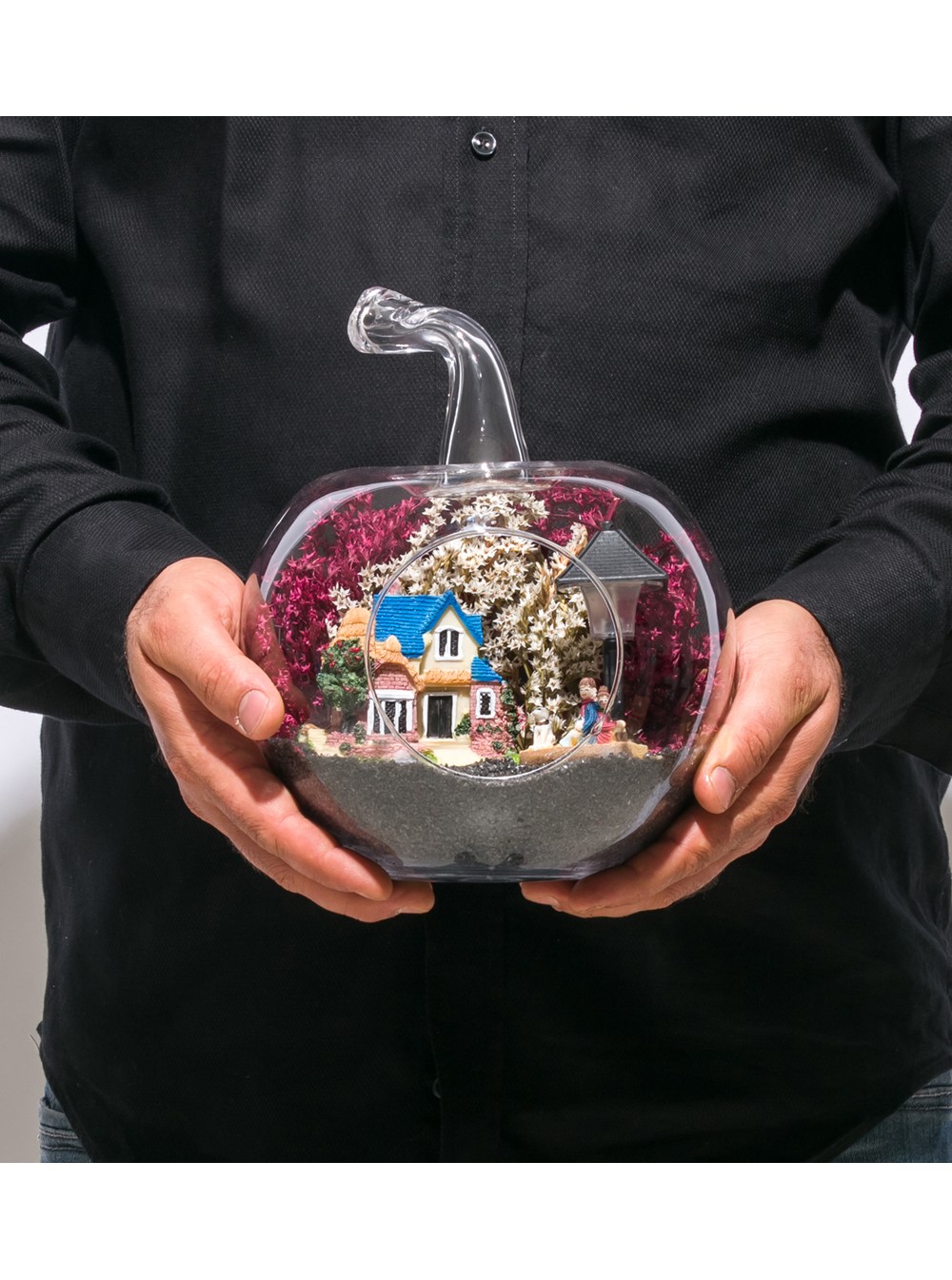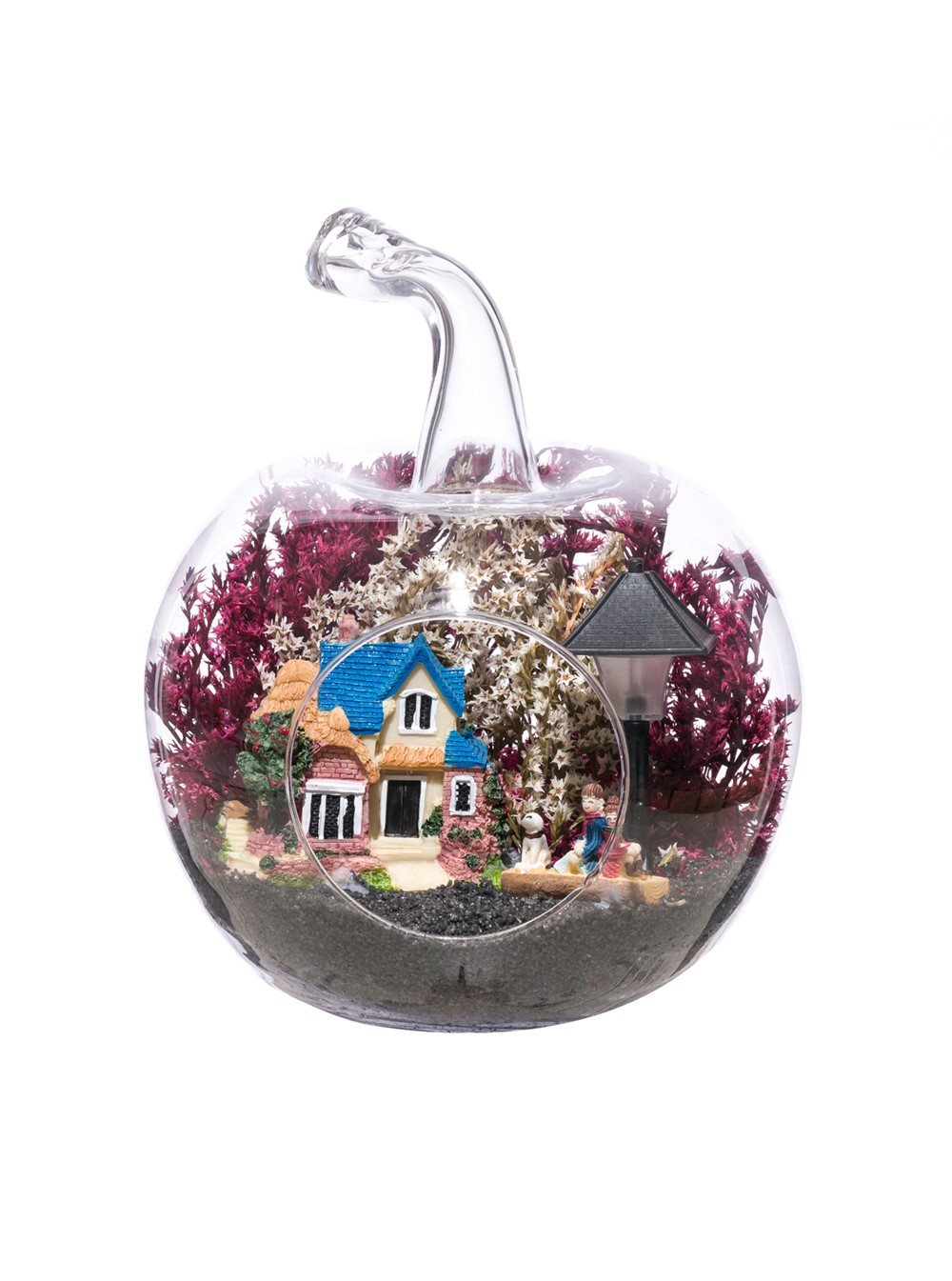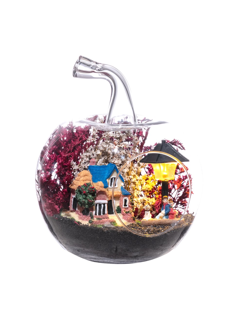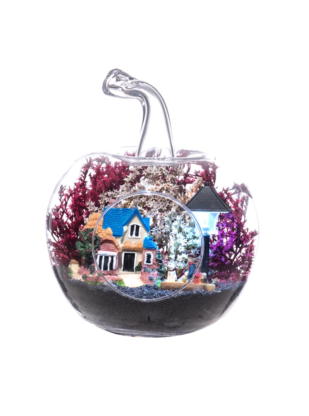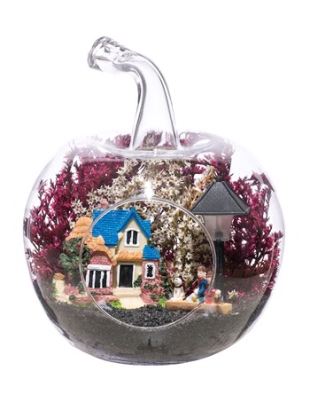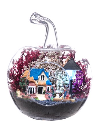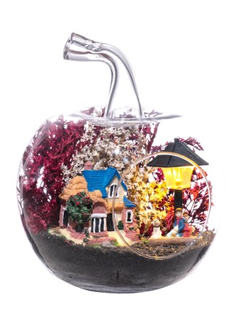 Küçük boy elma cam fanus içerisinde tasarladığımız bu çok güzel teraryum; siyah kum, şoklanmış yosunlar, kurutulmuş bitkiler, bir adet ışığı iki farklı renkte yanan led sokak lambası görseli, bir adet kır evi ve sırt sırta bankta oturmuş sohbet eden aşıklar görseli kullanılarak tamamlanmıştır. Ev ve ofis ortamlarının tamamında sergilenebilir teraryumun içinde, kurutulmuş ve şoklanmış bitkiler bulunduğundan hava alması önemlidir. Açık olan kısmının kapatılmaması veya büfe vb. kapalı alanlara konulmaması gereklidir. Özellikle her ortamda yıllarca, zevkle izlenebilecek özel bir teraryumdur. Yaklaşık Ölçüleri: 20x20cm NOT: Teraryumlarda kullanılan camlar, üfleme cam işçiliğiyle üretildiğinden bazı detaylarda farklılıklar gözlenebilir. Örneğin, sap kısmı ve ağız bitiş noktalarının her biri kendine özgüdür.