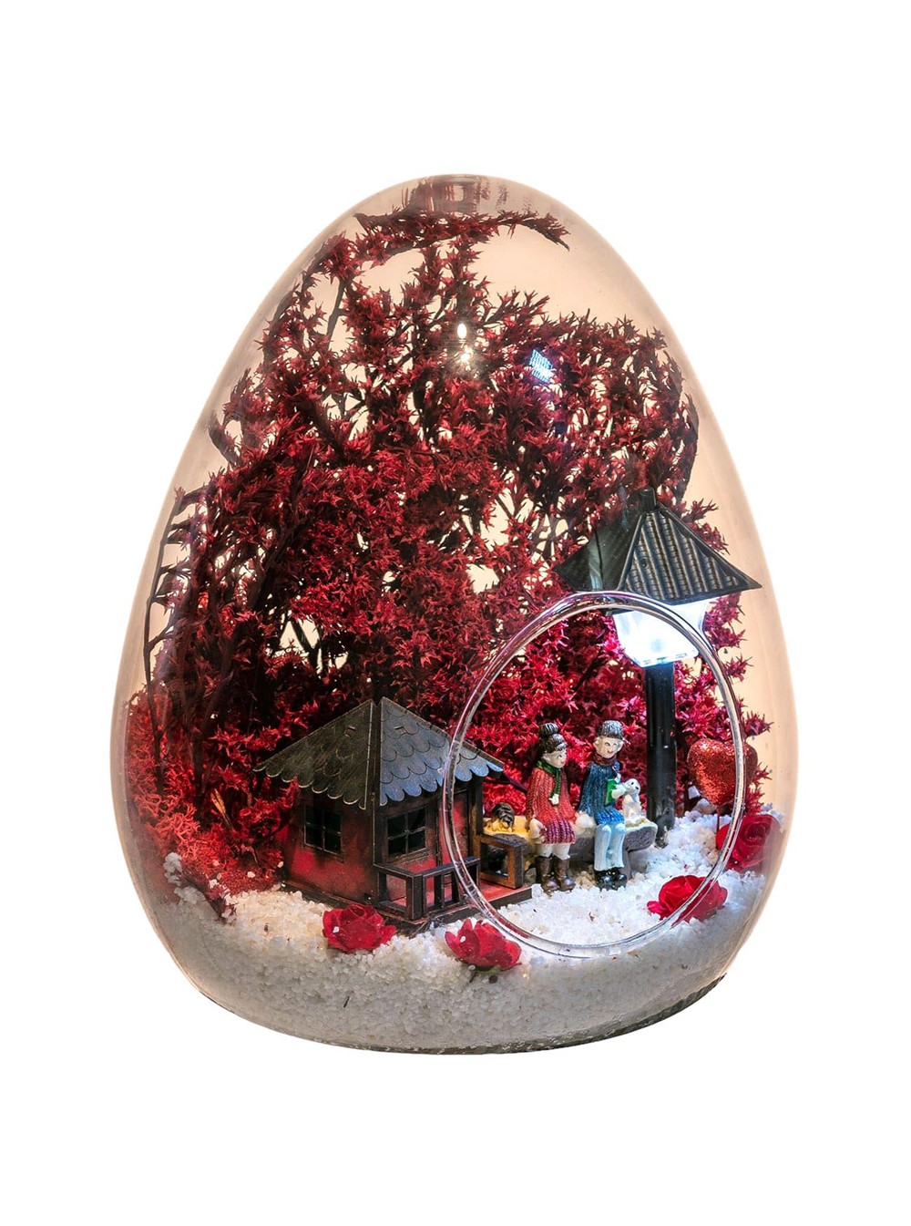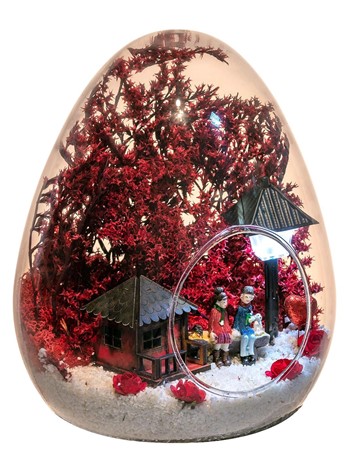 Küçük boy yumurta cam fanus içerisinde tasarladığımız bu güzel teraryum; beyaz kum, şoklanmış yosunlar, kurutulmuş bitkiler, yapay çiçekler, bir adet ahşap kırmızı ev, bir adet köpekleriyle yan yana oturan mutlu çift, bir adet işığı 2 farklı renkte yanan lamba objeler kullanılarak sizler için tasarlanmıştır. Ev ve ofis ortamlarının tamamında sergilenebilir teraryumun içinde canlı bitki bulunmadığından, herhangi bir bakıma ihtiyacı yoktur. Özellikle her ortamda yıllarca, zevkle izlenebilecek özel bir teraryumdur. Yaklaşık Ölçüleri: 18x22cm NOT:Teraryumlarda kullanılan camlar, üfleme cam işçiliğiyle üretildiğinden bazı detaylarda farklılıklar gözlenebilir. Örneğin, ağız bitiş noktalarının her biri kendine özgüdür. Teraryum Işıklı Kırmızı Aşk Bahçemiz