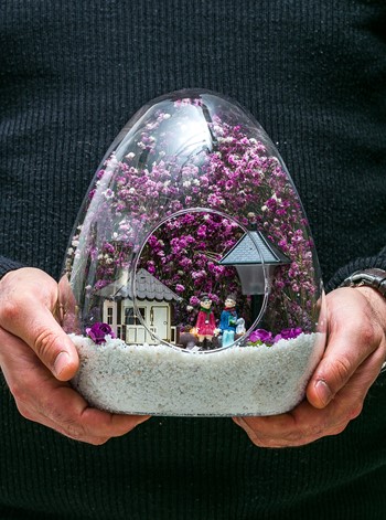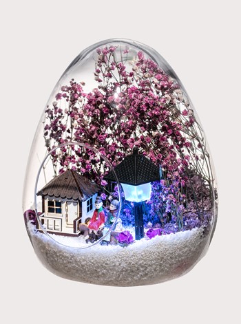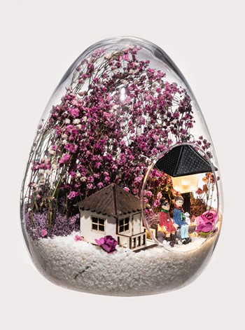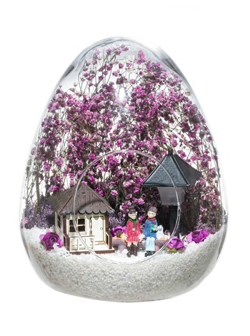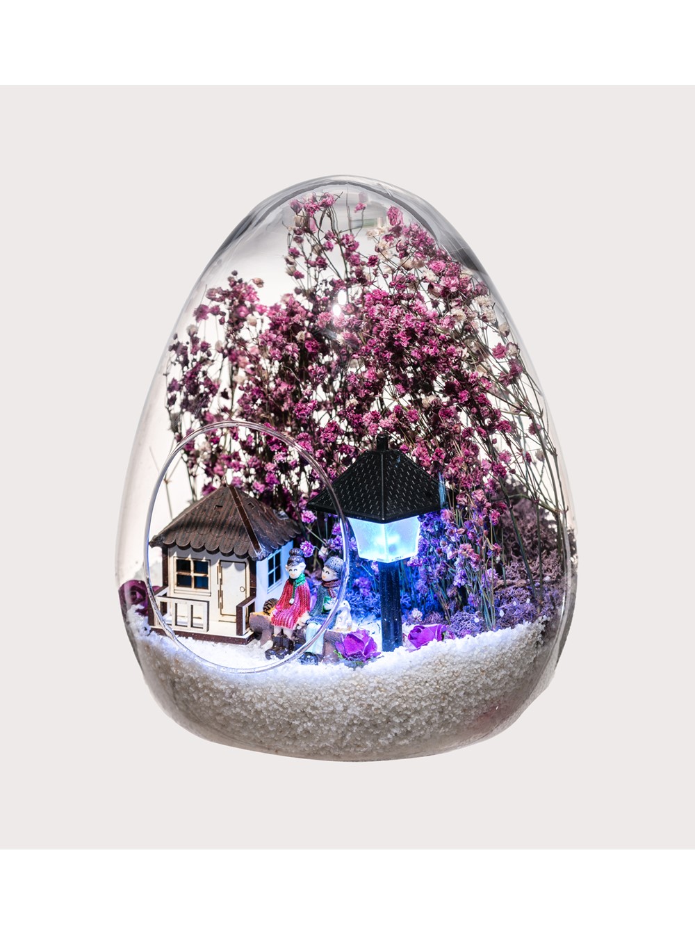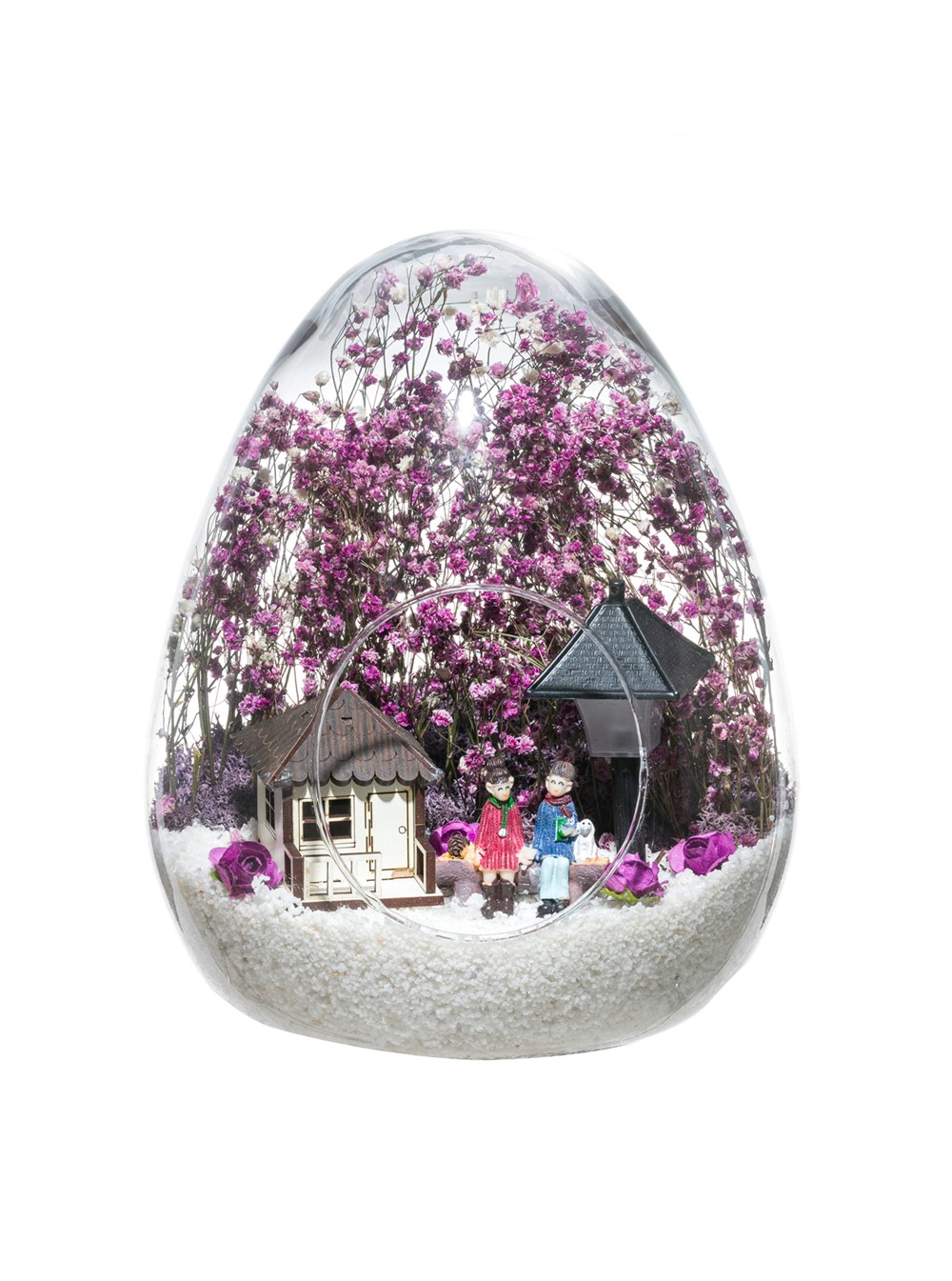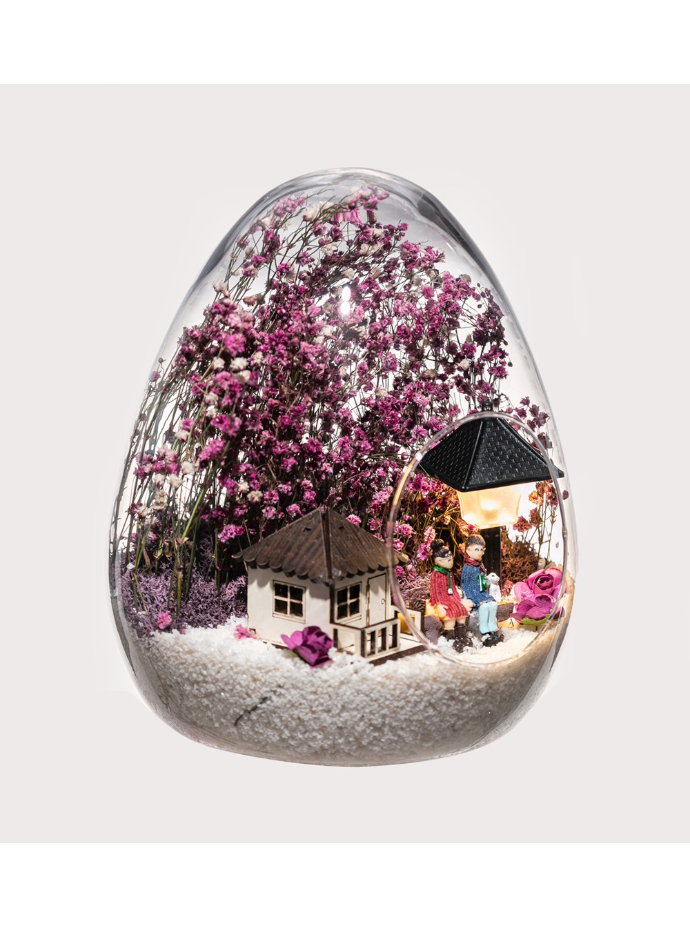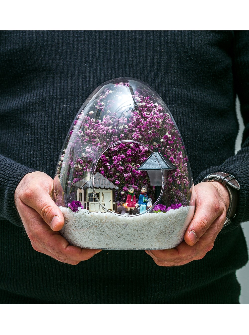 Küçük boy yumurta cam fanus içerisinde tasarladığımız, bu özgün teraryum; beyaz kum, kuru bitkiler, şoklanmış yosunlar, yapay mini güller, bir adet ışığı 2 farklı renkte yanan lamba, bir adet bankta köpekleriyle yan yana sohbet eden iki yetişkin, bir adet beyaz ahşap ev objeleri kullanılarak tamamlanmıştır. Ev ve ofis ortamlarının tamamında sergilenebilir teraryumun içinde, kurutulmuş ve şoklanmış bitkiler olduğundan hava alması önemlidir. Açık olan kısmının kapatılmaması veya büfe vb. kapalı alanlara konulmaması gereklidir. Özellikle her ortamda yıllarca, zevkle izlenebilecek özel bir teraryumdur. Yaklaşık Ölçüleri: 18x22cm NOT: Teraryumlarda kullanılan camlar, üfleme cam işçiliğiyle üretildiğinden bazı detaylarda farklılıklar gözlenebilir. Örneğin, ağız bitiş noktalarının her biri kendine özgüdür.