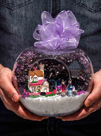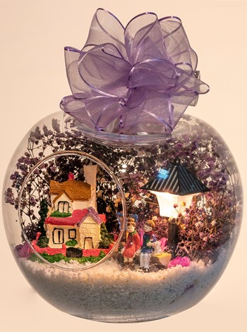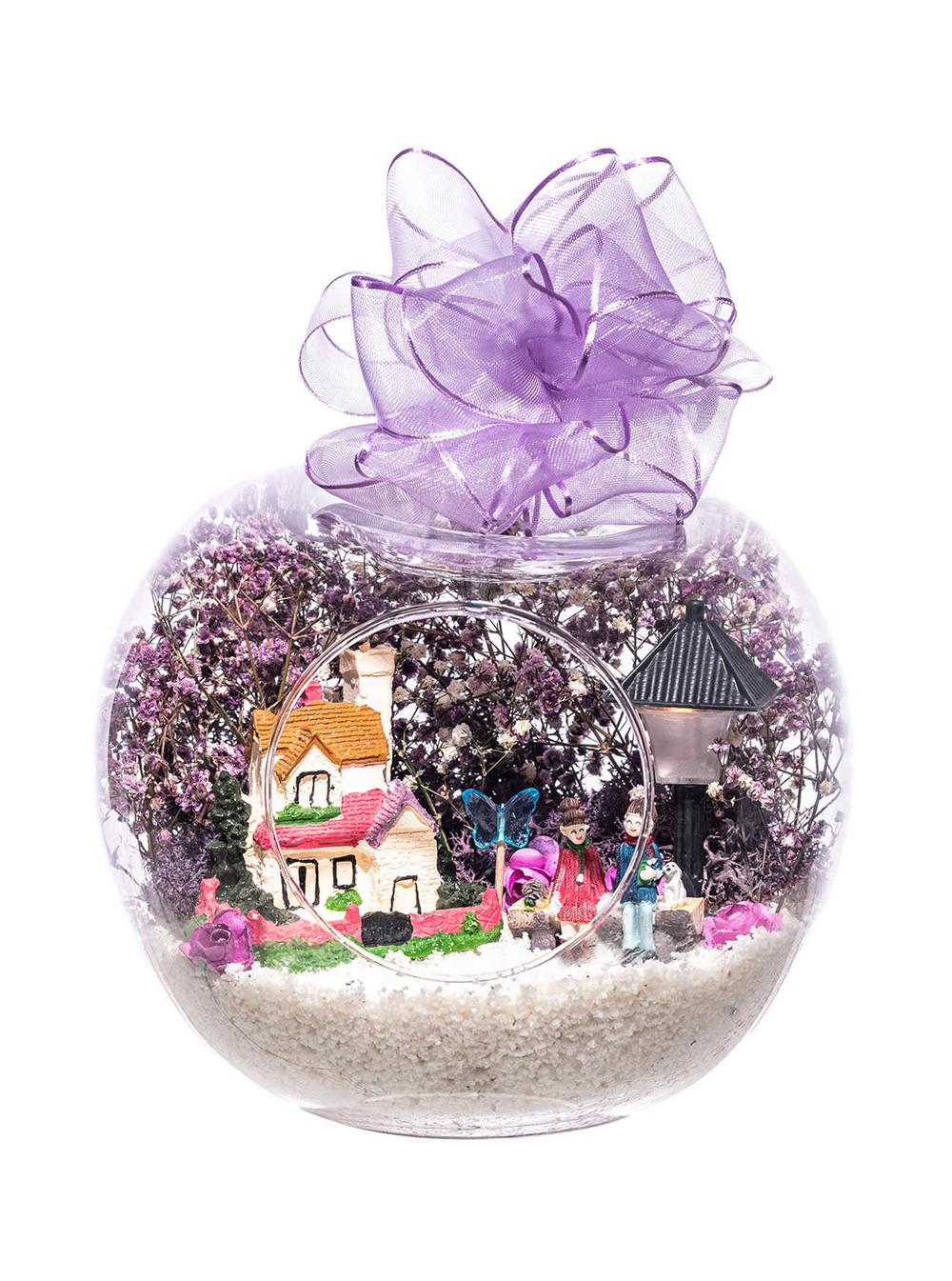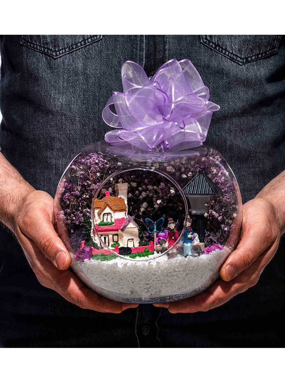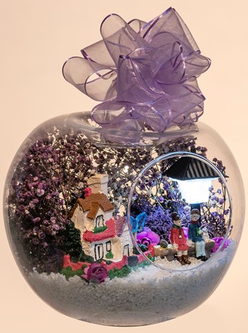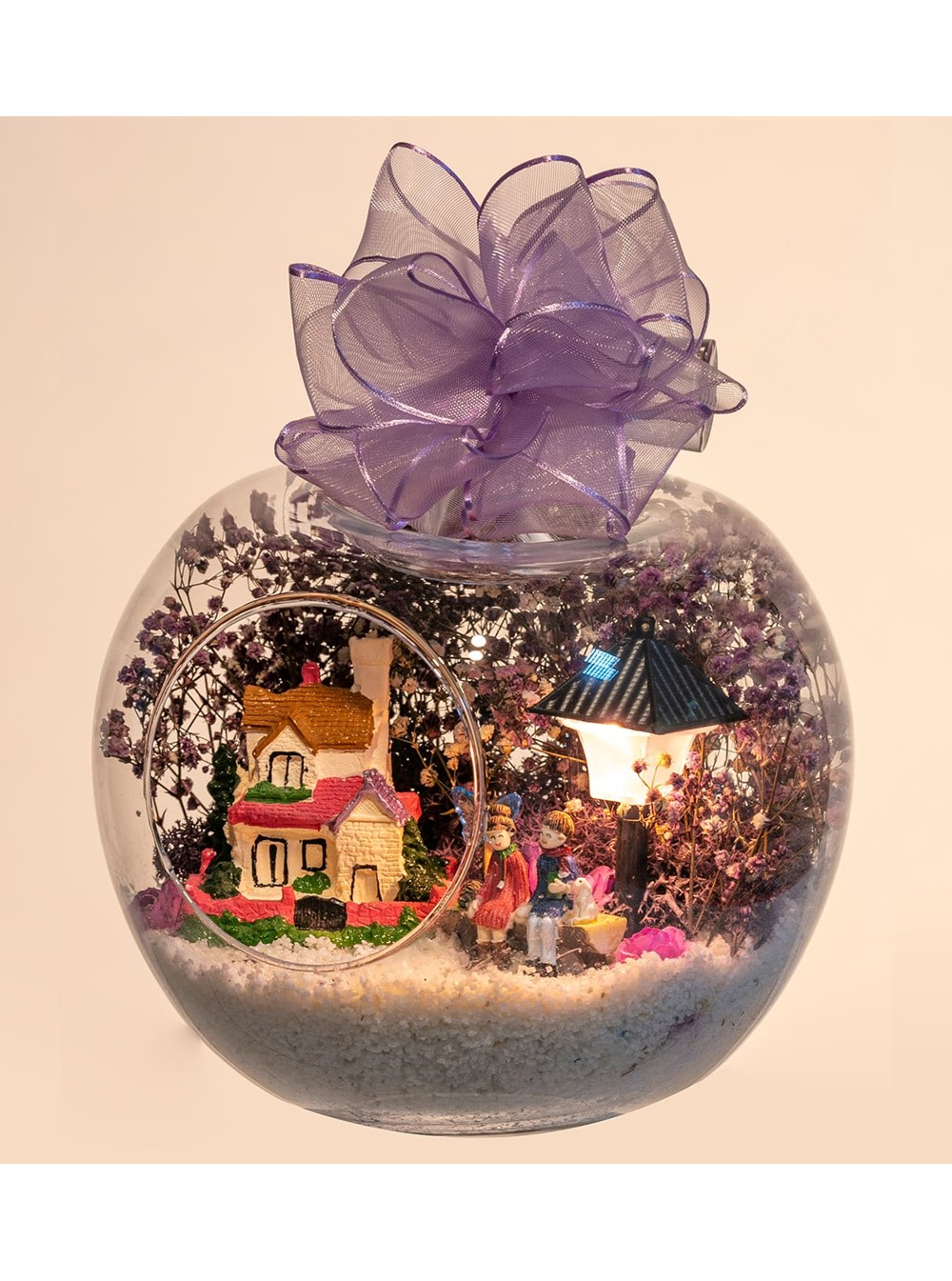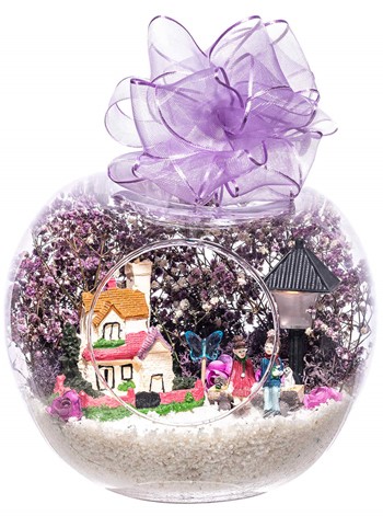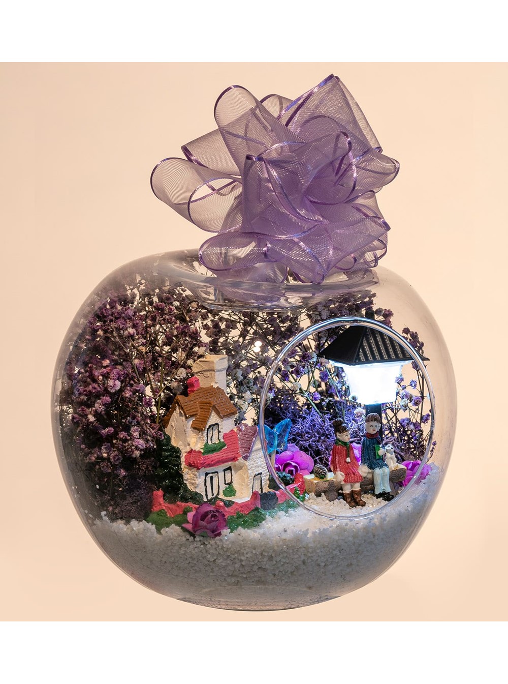 Küçük boy elma cam fanus içerisinde tasarladığımız bu güzelteraryum; beyaz kum, şoklanmış yosunlar, kurutulmuş bitkiler, yapay çiçekler, bir adet kır evi, bir adet köpekleriyle yan yana oturan mutlu çift, bir adet kelebek, bir adet ışığı 2 farklı renkte yanan lamba ve üzerinde kurdelesiyle sizler için tasarlanmıştır. Ev ve ofis ortamlarının tamamında sergilenebilir teraryumun içinde, kurutulmuş bitkiler olduğundan hava alması önemlidir. Açık olan kısmının kapatılmaması veya büfe vb. kapalı alanlara konulmaması gereklidir. Özellikle her ortamda yıllarca, zevkle izlenebilecek özel bir teraryumdur. Yaklaşık Ölçüleri: 20x20cm NOT:Teraryumlarda kullanılan camlar, üfleme cam işçiliğiyleüretildiğinden bazı detaylarda farklılıklar gözlenebilir. Örneğin, sap kısmı ve ağız bitiş noktalarının her biri kendine özgüdür.