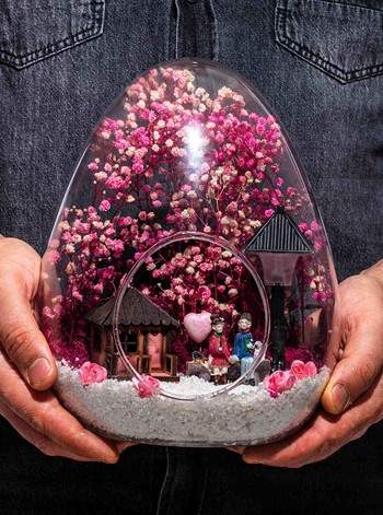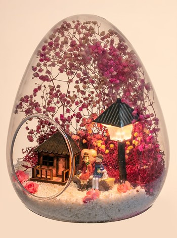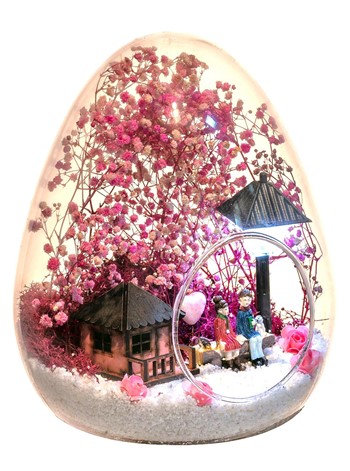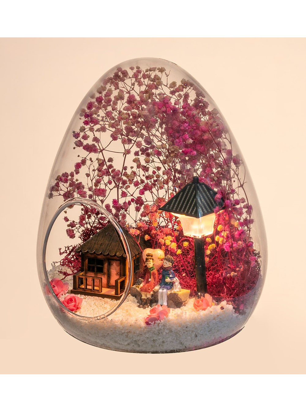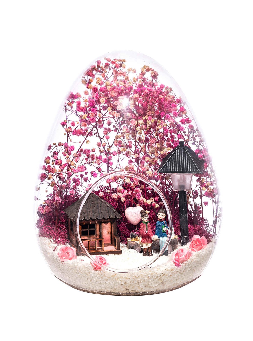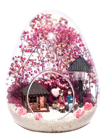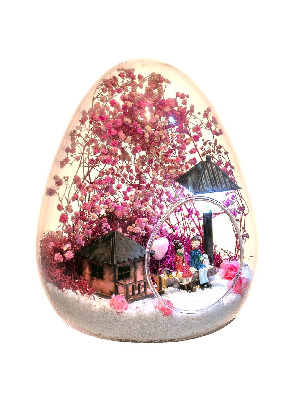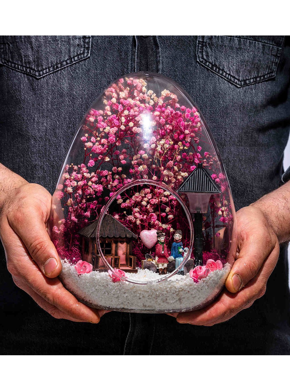 Küçük boy yumurta cam fanus içerisinde tasarladığımız bu çok güzel teraryum; beyaz kum, şoklanmış yosunlar, kurutulmuş bitkiler, yapay çiçekler, bir adet ahşap pembe ev, bir adet köpekleriyle yan yana oturan mutlu çift, bir adet simli kalp, bir adet işığı 2 farklı renkte yanan lamba objeler kullanılarak sizler için tasarlanmıştır. Ev ve ofis ortamlarının tamamında sergilenebilir teraryumun içinde, kurutulmuş bitkiler olduğundan hava alması önemlidir. Açık olan kısmının kapatılmaması veya büfe vb. kapalı alanlara konulmaması gereklidir. Özellikle her ortamda yıllarca, zevkle izlenebilecek özel bir teraryumdur. Yaklaşık Ölçüleri: 18x22cm NOT: Teraryumlarda kullanılan camlar, üfleme cam işçiliğiyle üretildiğinden bazı detaylarda farklılıklar gözlenebilir. Örneğin, ağız bitiş noktalarının her biri kendine özgüdür. Teraryum Işıklı Pembe Aşk Bahçesi