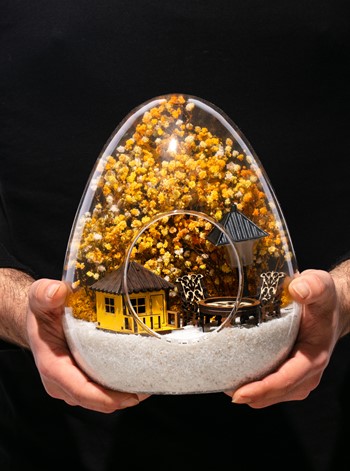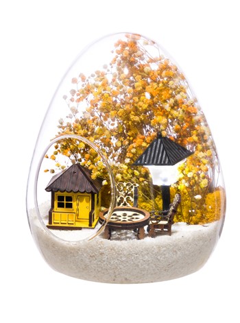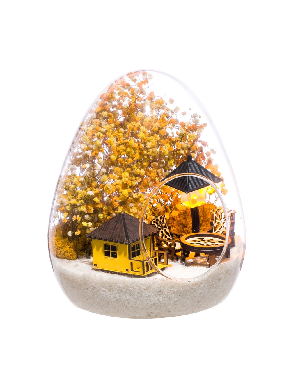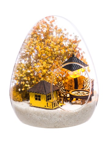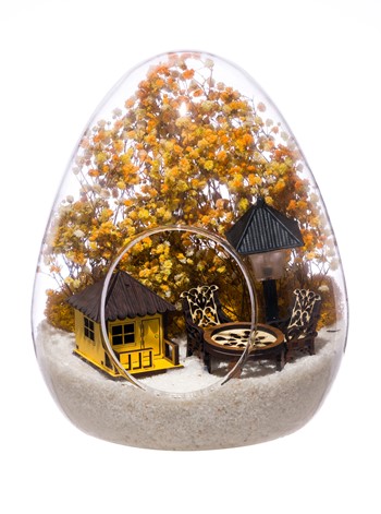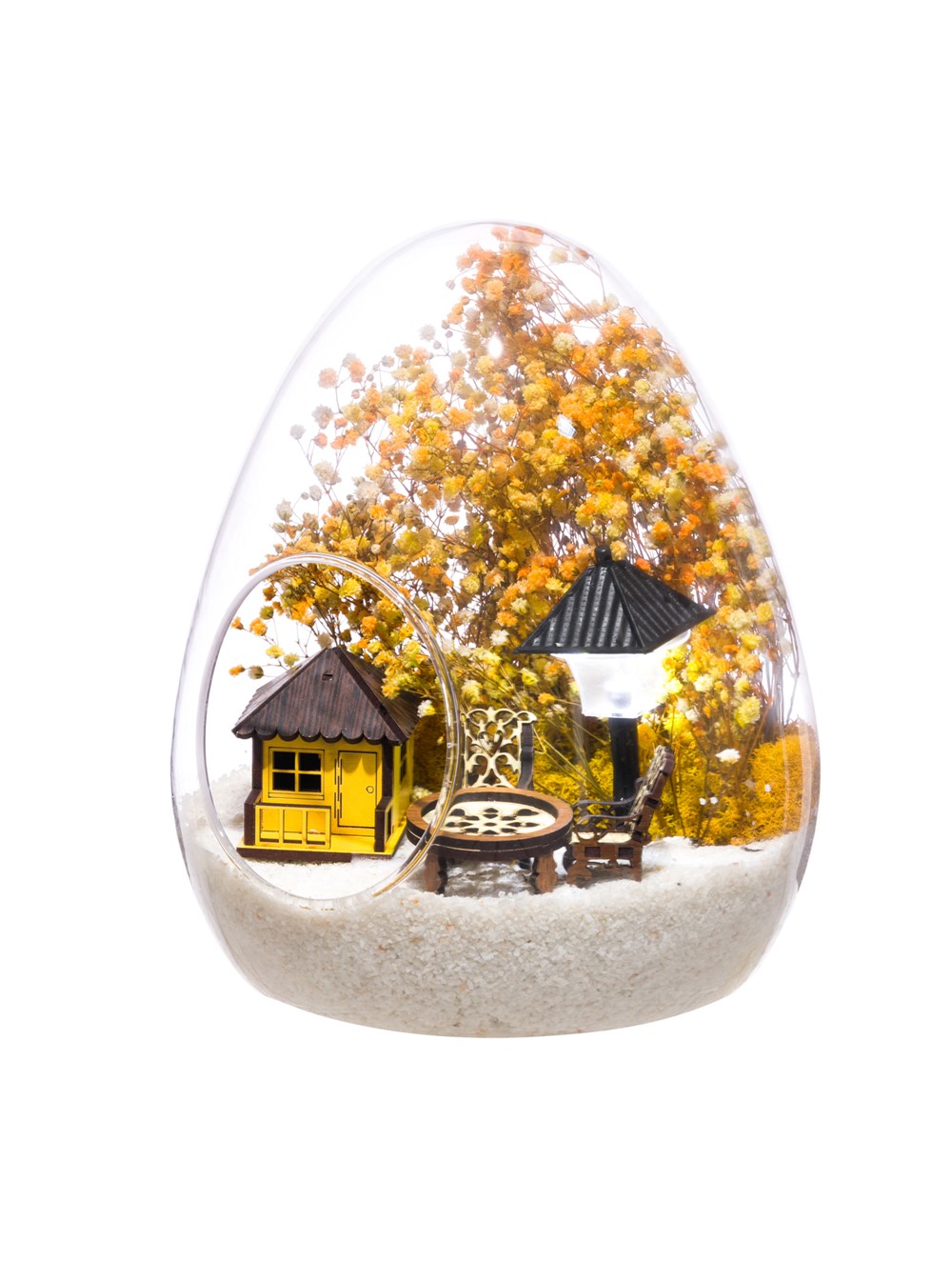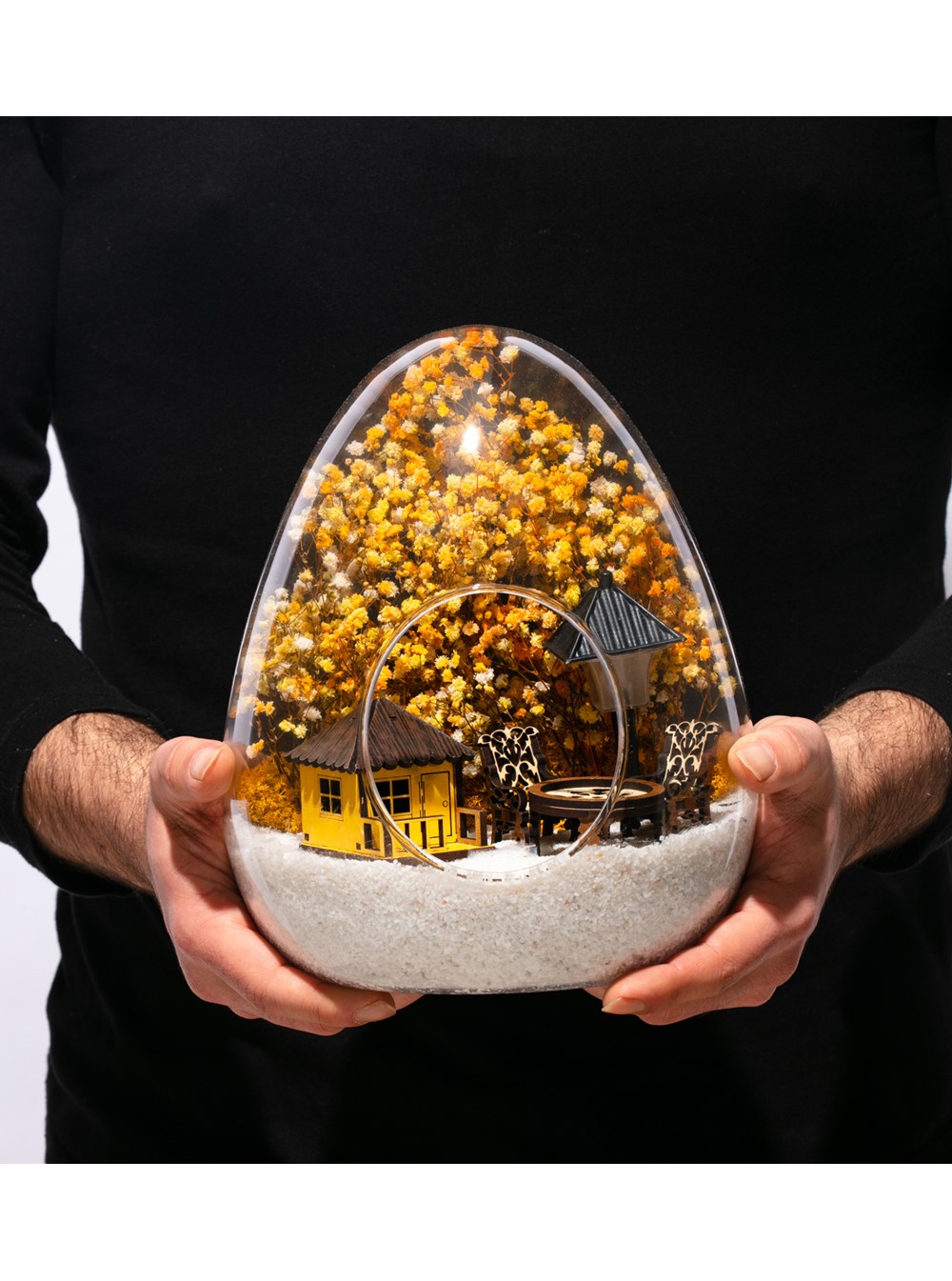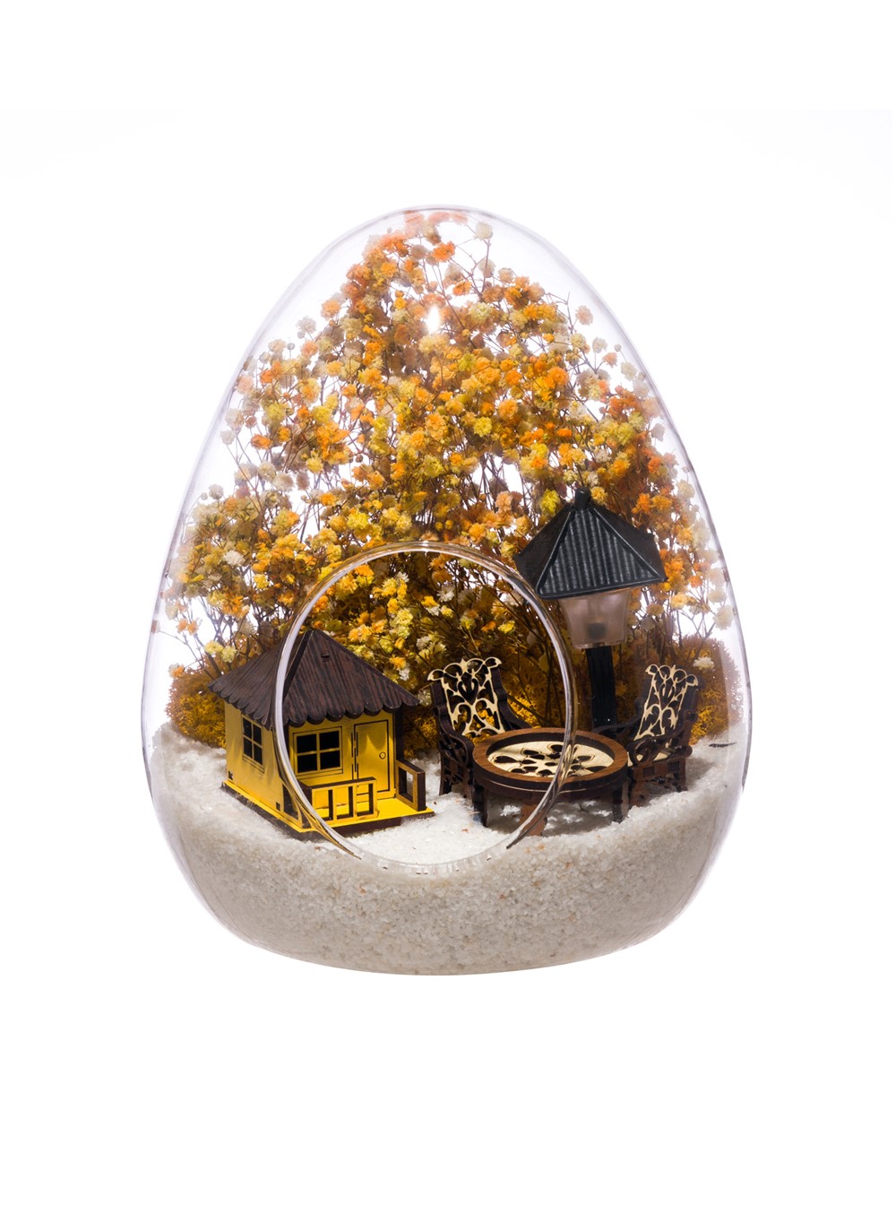 Küçük boy yumurta cam fanus içerisinde tasarladığımız bu güzel teraryum; beyaz kum, kurutulmuş bitkiler, şoklanmış yosunlar, bir adet ışığı iki farklı renkte yanan led sokak lambası görseli, bir adet ahşap sarı ev görseli, iki adet ahşap bahçe sandalyesi ve bir ahşap bahçe masası kullanılarak tamamlanmıştır. Ev ve ofis ortamlarının tamamında sergilenebilir teraryumun içinde, kurutulmuş ve şoklanmış bitkiler bulunduğundan hava alması önemlidir. Açık olan kısmının kapatılmaması veya büfe vb. kapalı alanlara konulmaması gereklidir. Özellikle her ortamda yıllarca, zevkle izlenebilecek özel bir teraryumdur. Yaklaşık Ölçüleri: 18x22cm NOT: Teraryumlarda kullanılan camlar, üfleme cam işçiliğiyle üretildiğinden bazı detaylarda farklılıklar gözlenebilir. Örneğin, yumurta şekli ve ağız bitiş noktalarının her biri kendine özgüdür.