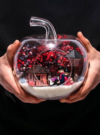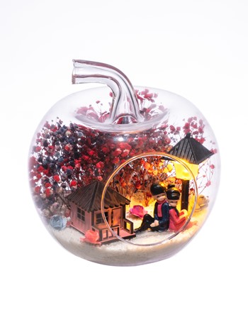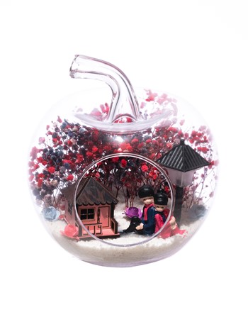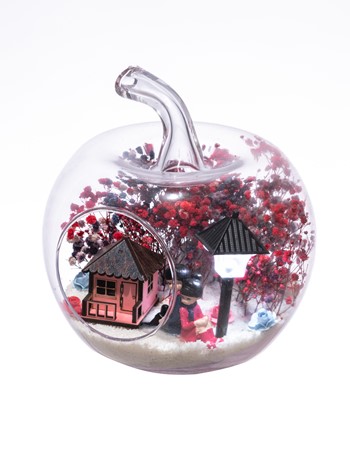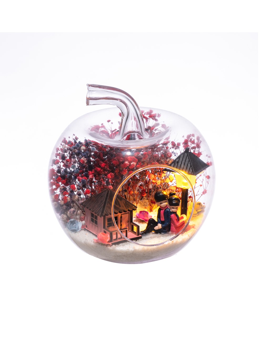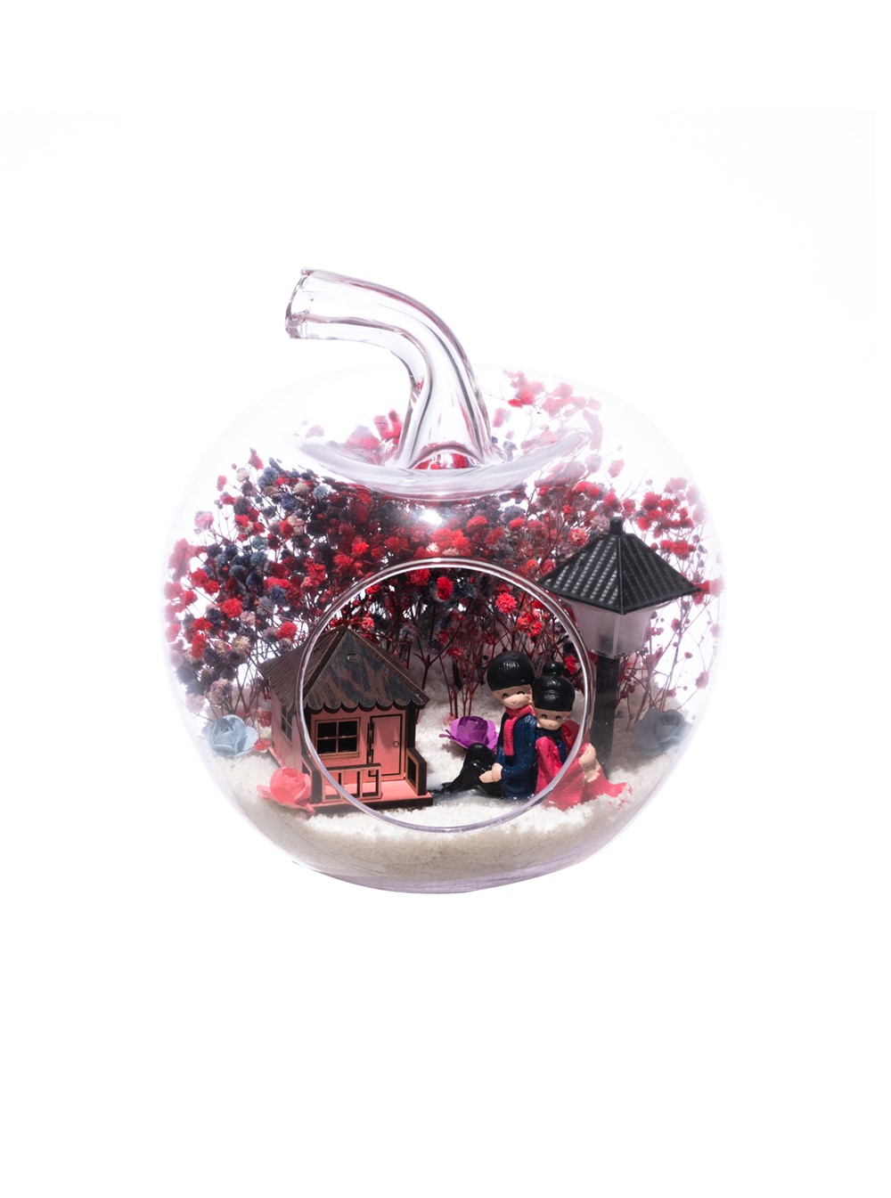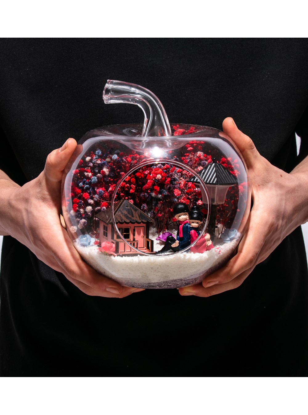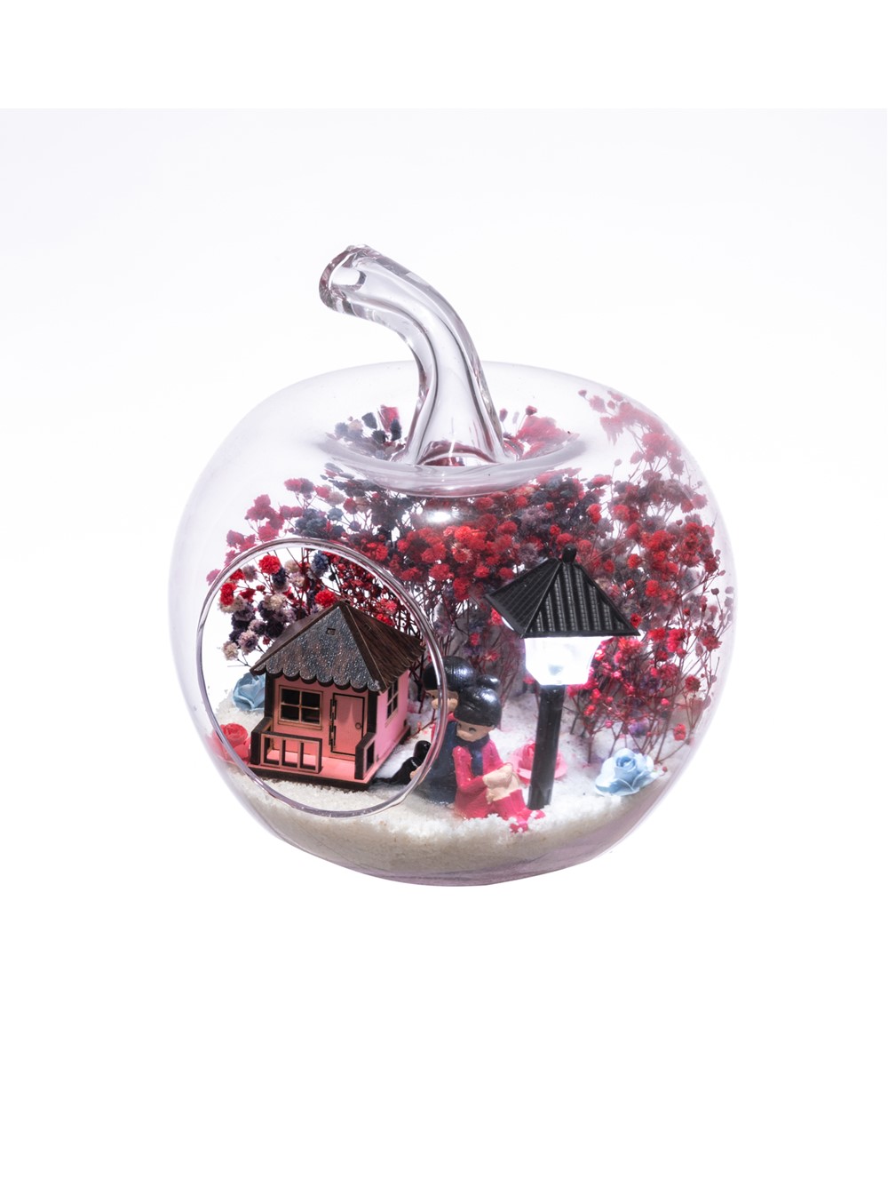 Küçük boy elma cam fanus içerisinde tasarladığımız bu çok güzel teraryum; beyaz kum, karışık renkli kurutulmuş bitkiler, renkli yapay mini güller, bir adet ahşap ev, bir adet ışığı iki farklı renkte yanan led lamba ve sırt sırta oturmuş, anı paylaşan aşıkları simgeleyen objeler kullanılarak tamamlanmıştır. Ev ve ofis ortamlarının tamamında sergilenebilir teraryumun içinde, kurutulmuş bitkiler bulunduğundan hava alması önemlidir. Açık olan kısmının kapatılmaması veya büfe vb. kapalı alanlara konulmaması gereklidir. Özellikle her ortamda yıllarca, zevkle izlenebilecek özel bir teraryumdur. Yaklaşık Ölçüleri: 20x20cm NOT: Teraryumlarda kullanılan camlar, üfleme cam işçiliğiyle üretildiğinden bazı detaylarda farklılıklar gözlenebilir. Örneğin, sap kısmı ve ağız bitiş noktalarının her biri kendine özgüdür.