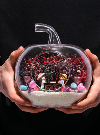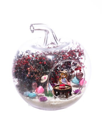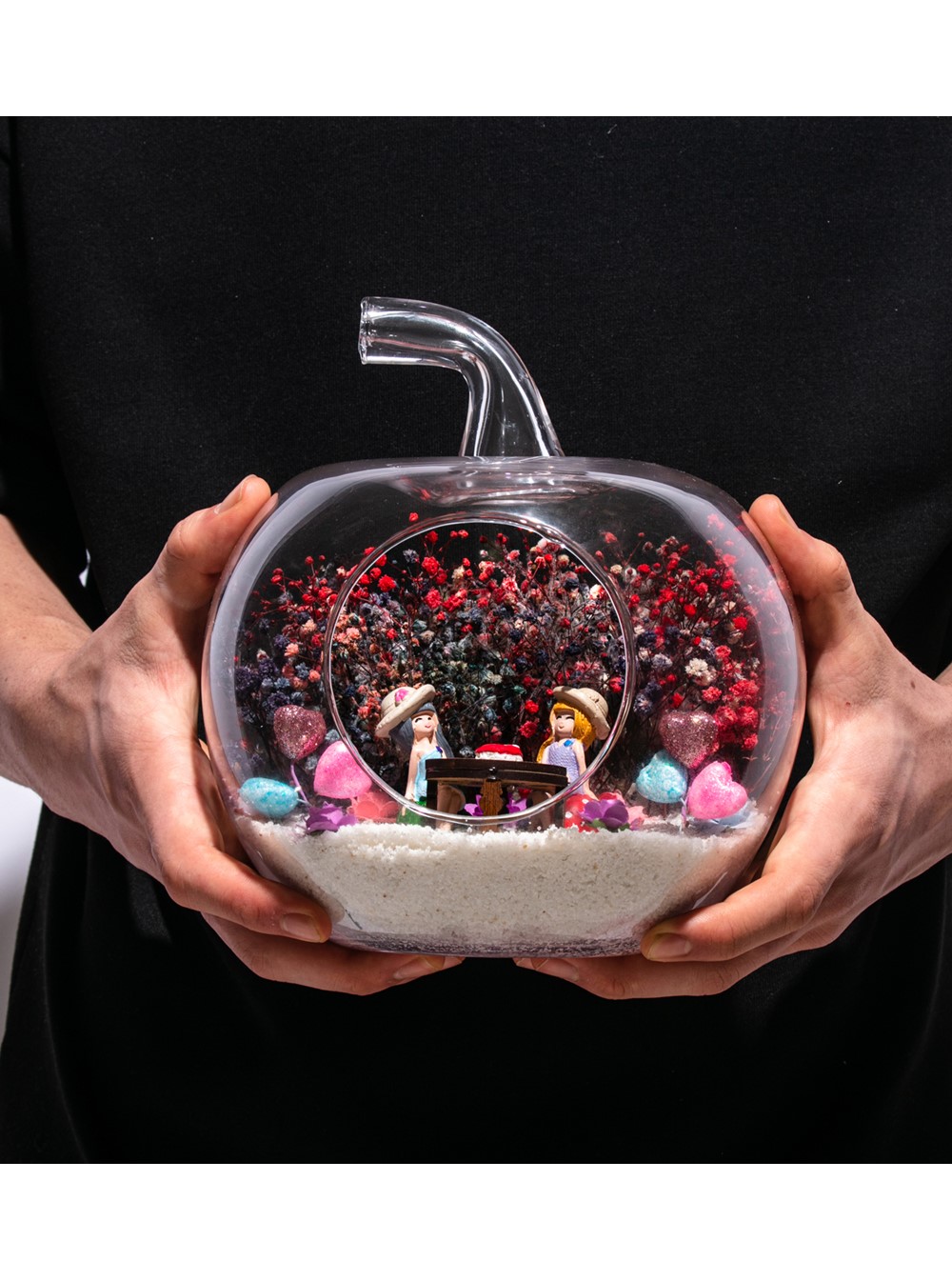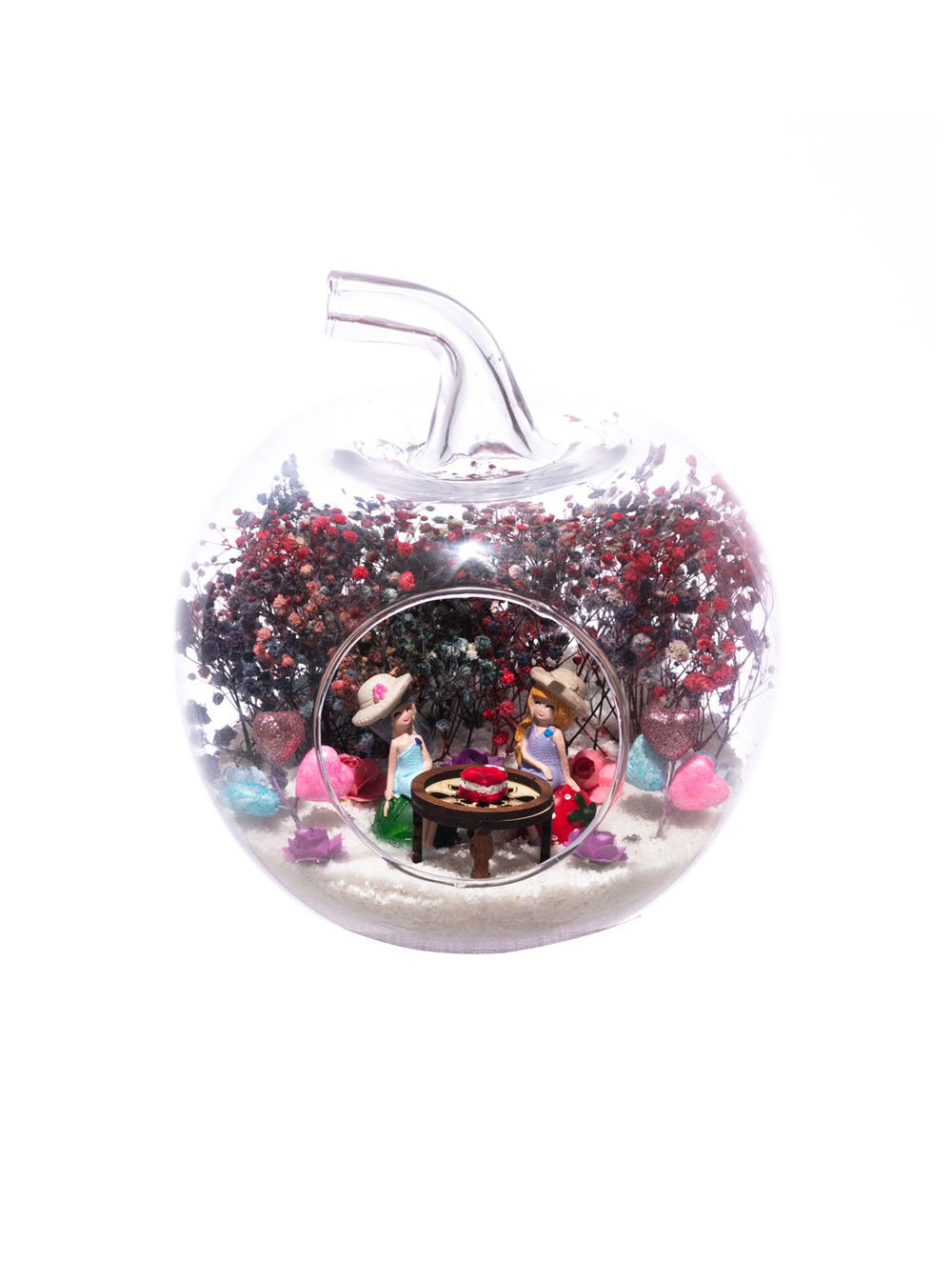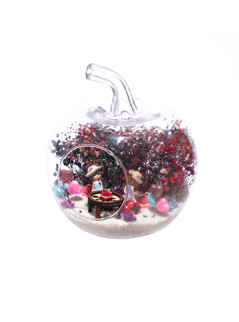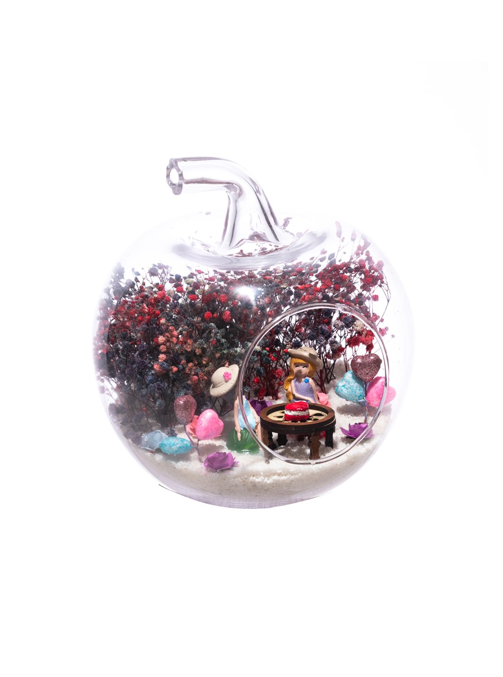 Küçük boy elma cam fanus içerisinde tasarladığımız bu çok güzel teraryum; beyaz kum, karışık renkli kurutulmuş bitkiler, renkli simli kalpler, renkli yapay mini güller, bir adet otantik ahşap, üzerinde pastasıyla doğum günü masası ve iki adet genç kadını simgeleyen objeler kullanılarak tamamlanmıştır. Ev ve ofis ortamlarının tamamında sergilenebilir teraryumun içinde, kurutulmuş bitkiler bulunduğundan hava alması önemlidir. Açık olan kısmının kapatılmaması veya büfe vb. kapalı alanlara konulmaması gereklidir. Özellikle her ortamda yıllarca, zevkle izlenebilecek özel bir teraryumdur. Yaklaşık Ölçüleri: 20x20cm NOT: Teraryumlarda kullanılan camlar, üfleme cam işçiliğiyle üretildiğinden bazı detaylarda farklılıklar gözlenebilir. Örneğin, sap kısmı ve ağız bitiş noktalarının her biri kendine özgüdür.