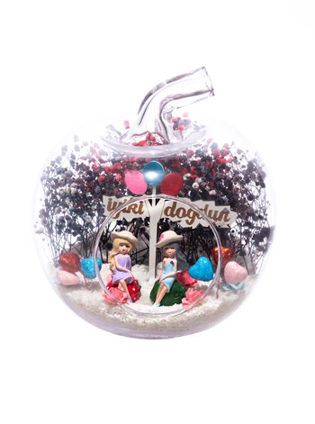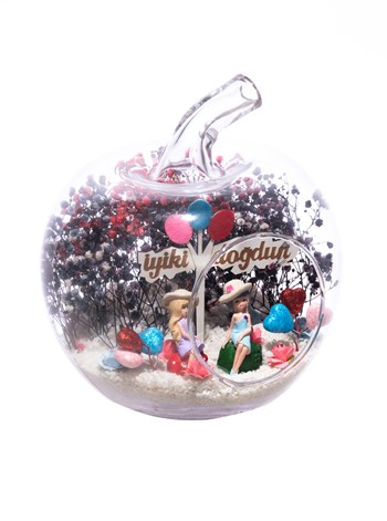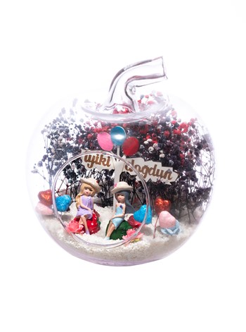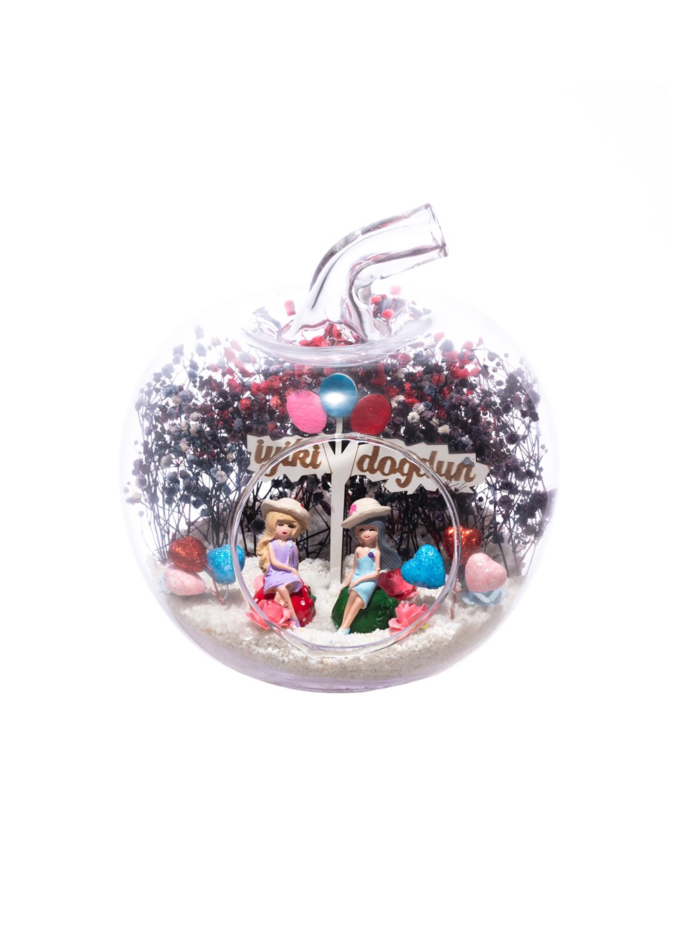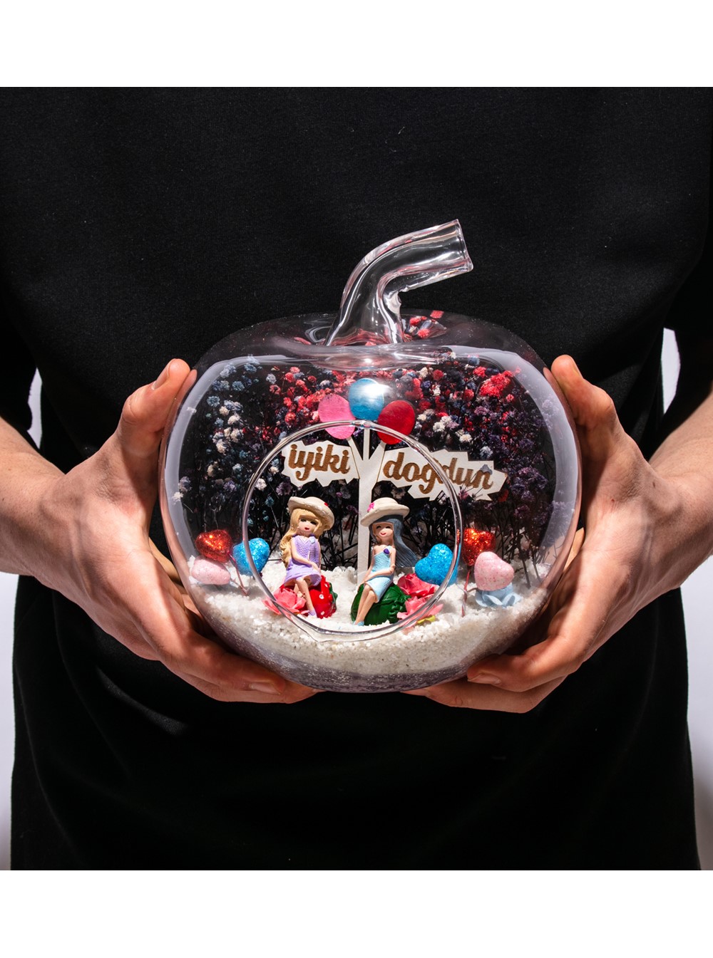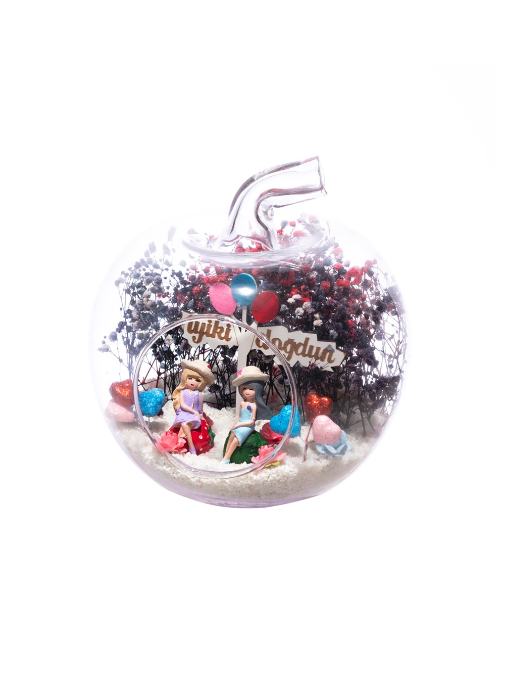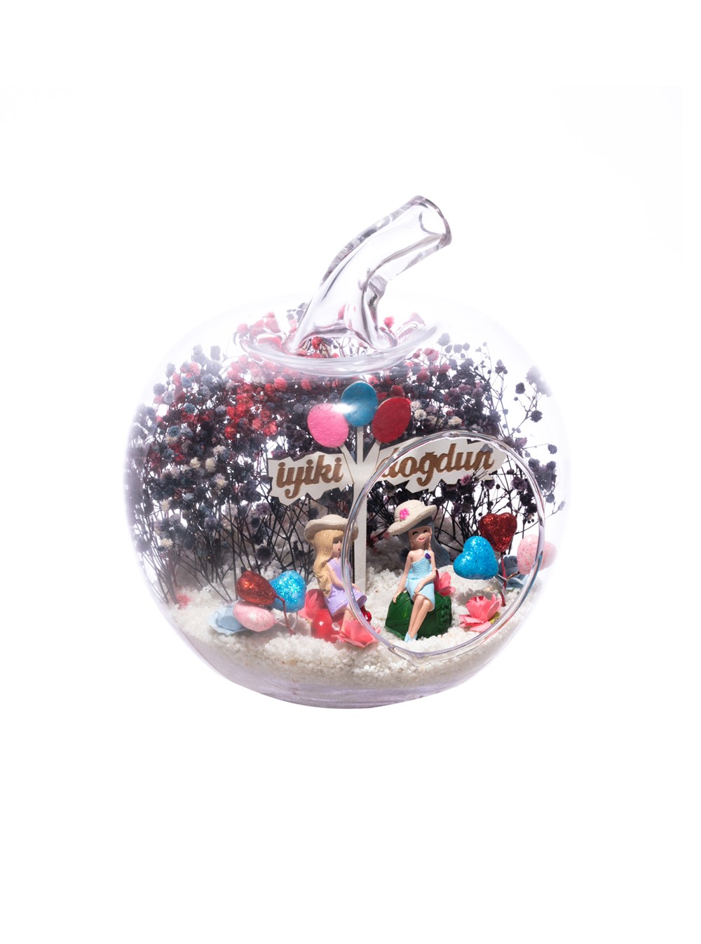 Küçük boy elma cam fanus içerisinde tasarladığımız bu çok güzel teraryum; beyaz kum, karışık renkli kurutulmuş bitkiler, renkli yapay mini güller, renkli simli kalpler, bir adet ahşap iyi ki doğdun yazılı balonlu tabela ve iki adet genç kadını simgeleyen objeler kullanılarak tamamlanmıştır. Ev ve ofis ortamlarının tamamında sergilenebilir teraryumun içinde, kurutulmuş bitkiler bulunduğundan hava alması önemlidir. Açık olan kısmının kapatılmaması veya büfe vb. kapalı alanlara konulmaması gereklidir. Özellikle her ortamda yıllarca, zevkle izlenebilecek özel bir teraryumdur. Yaklaşık Ölçüleri: 20x20cm NOT: Teraryumlarda kullanılan camlar, üfleme cam işçiliğiyle üretildiğinden bazı detaylarda farklılıklar gözlenebilir. Örneğin, sap kısmı ve ağız bitiş noktalarının her biri kendine özgüdür.