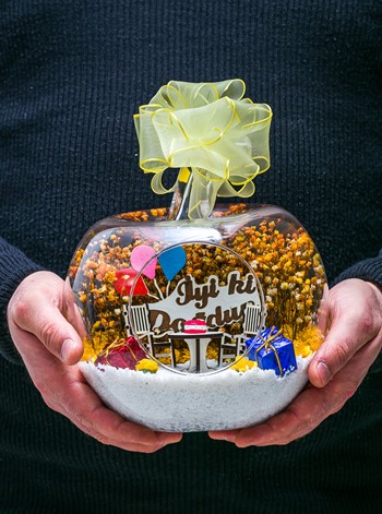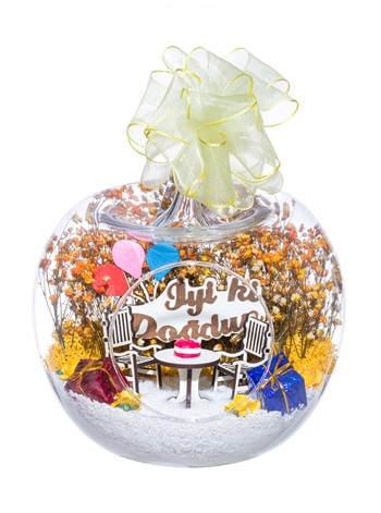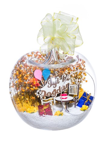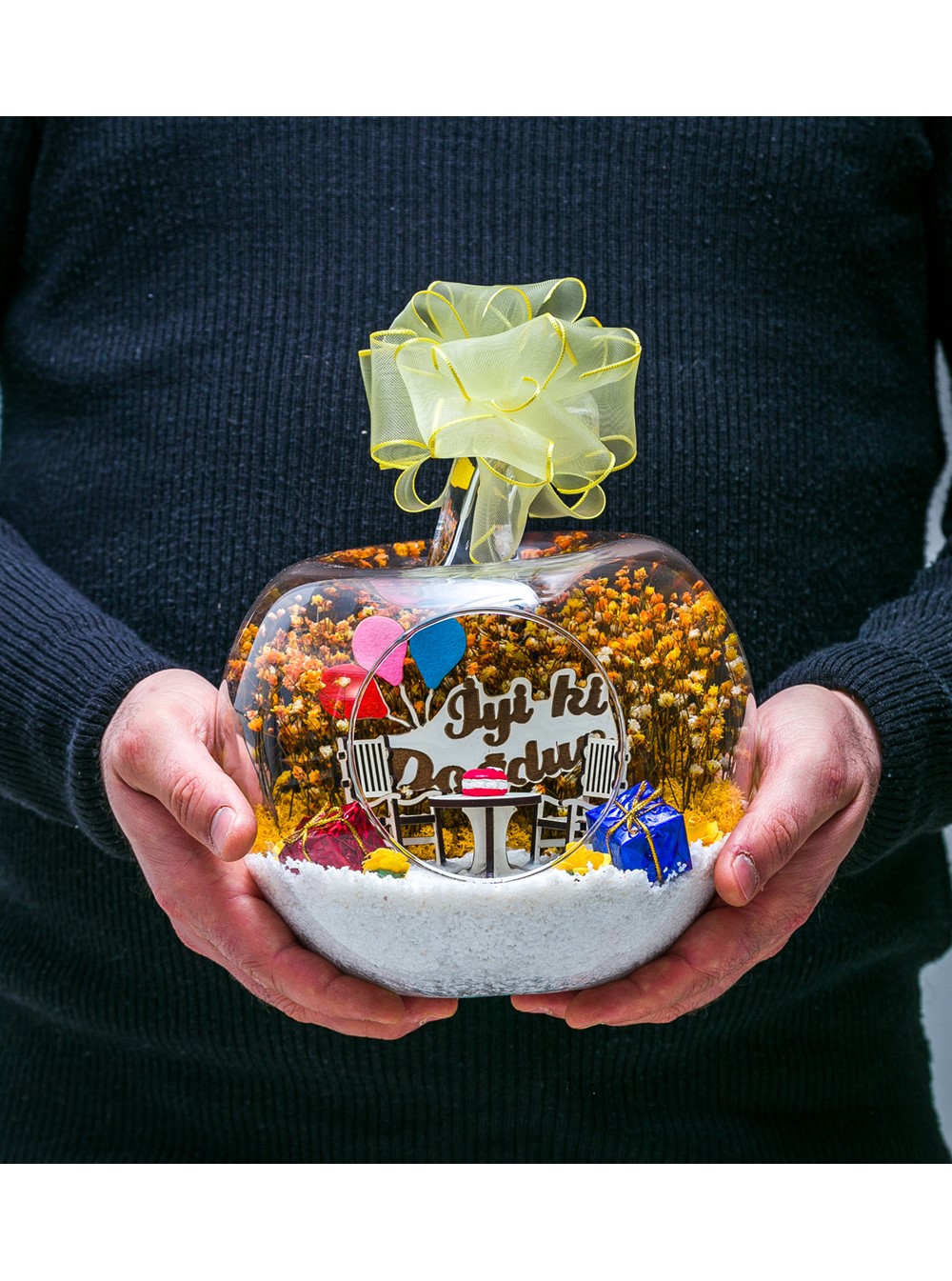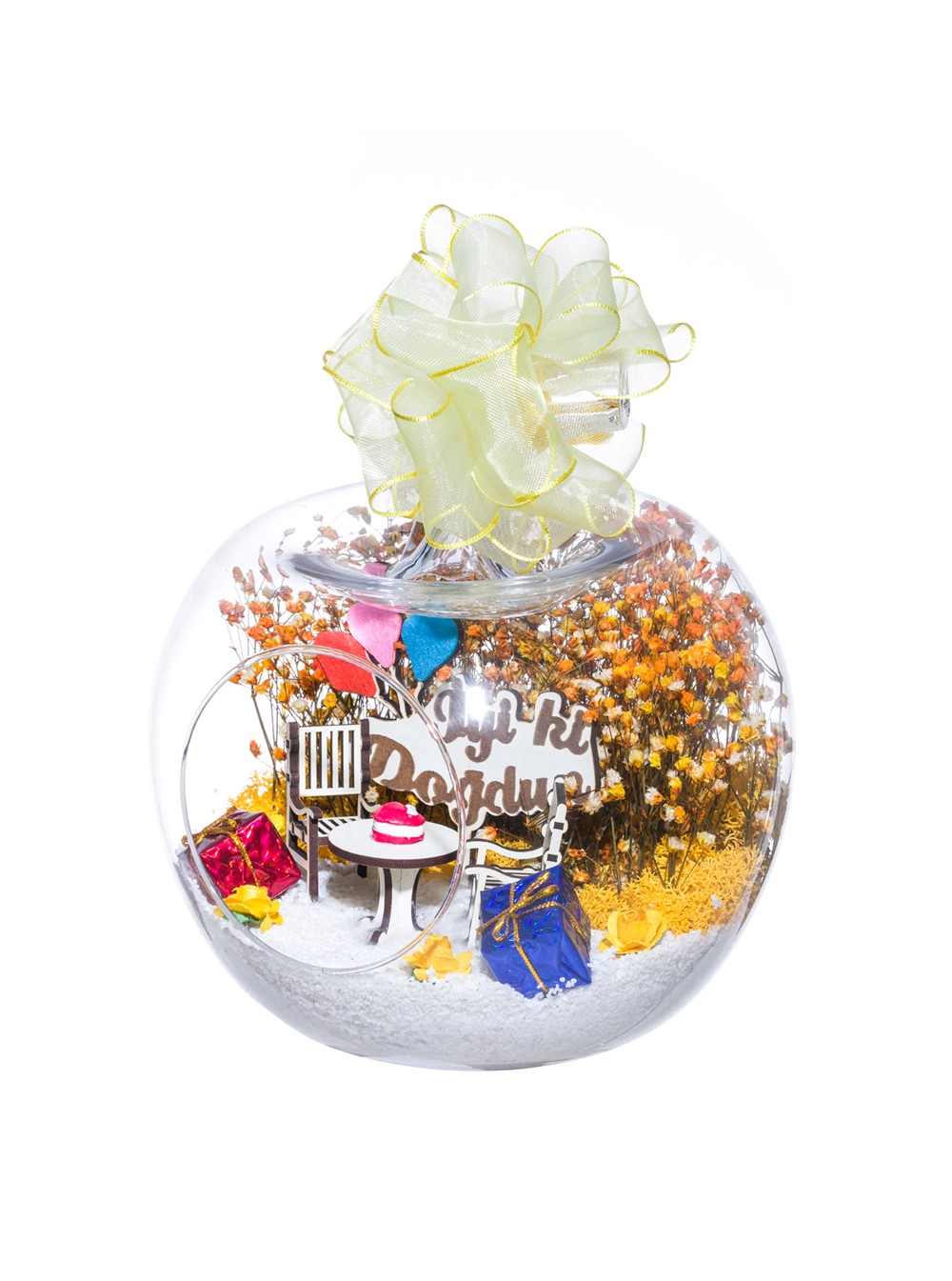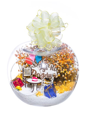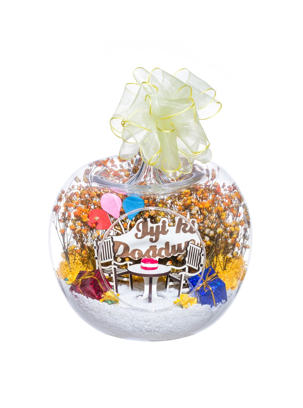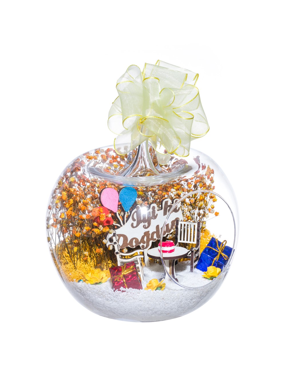 Kurdele takılı küçük boy elma cam fanus içerisinde tasarladığımız bu özel teraryum; beyaz kum, şoklanmış yosunlar, kurutulmuş bitkiler, mini yapay güller, bir adet üzerinde doğum günü pastası bulunan ahşap bahçe sehpa, iki adet ahşap oymalı bahçe sandalyesi, bir adet üzerinde İYİ Kİ DOĞDUN yazılı ahşap balonlu tabela ve hediye paketlerini simgeleyen objelerle tamamlanmıştır. Ev ve ofis ortamlarının tamamında sergilenebilir teraryumun içinde, kurutulmuş ve şoklanmış bitkiler bulunduğundan hava alması önemlidir. Açık olan kısmının kapatılmaması veya büfe vb. kapalı alanlara konulmaması gereklidir. Özellikle her ortamda yıllarca, zevkle izlenebilecek özel bir teraryumdur. Yaklaşık Ölçüleri: 20x20cm NOT: Teraryumlarda kullanılan camlar, üfleme cam işçiliğiyle üretildiğinden bazı detaylarda farklılıklar gözlenebilir. Örneğin, sap kısmı ve ağız bitiş noktalarının her biri kendine özgüdür.