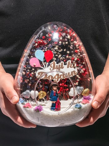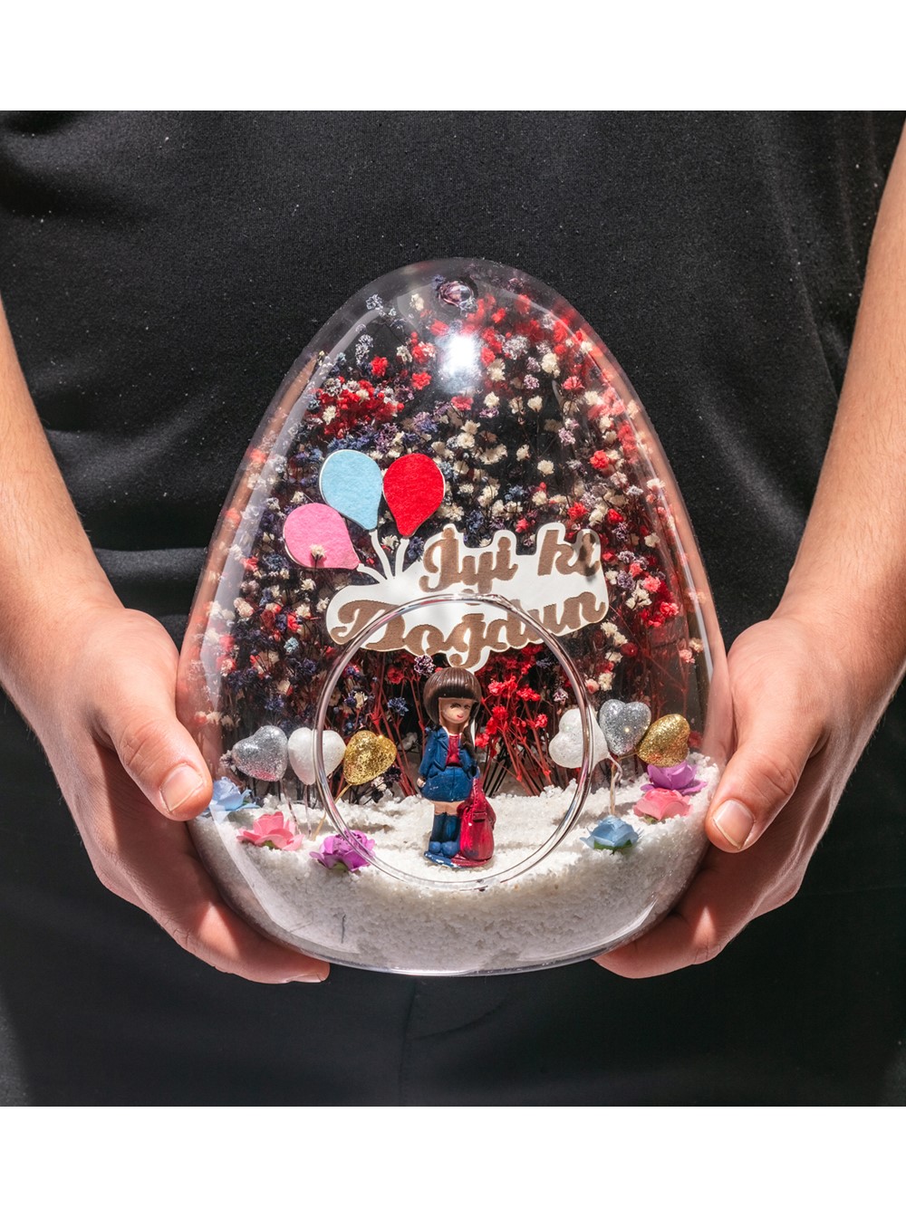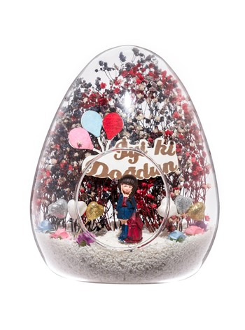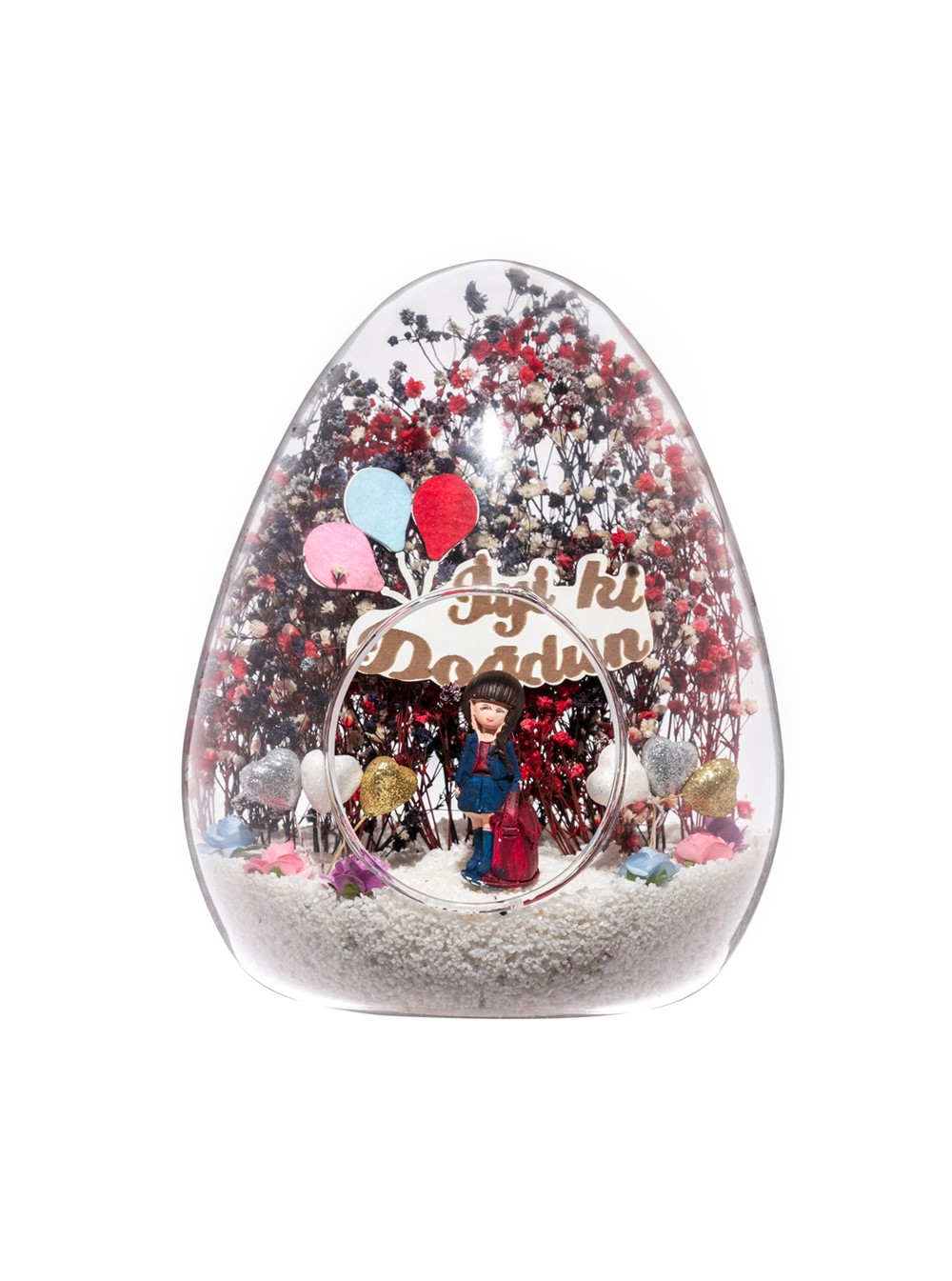 Küçük boy yumurta cam fanus içerisinde tasarladığımız bu özgün teraryum; beyaz kum, karışık renkli kurutulmuş bitkiler, renkli simli kalpler, renkli yapay mini güller, bir adet İYİ Kİ DOĞDUN yazılı ahşap balonlu tabela ve bayan obje kullanılarak tamamlanmıştır. Ev ve ofis ortamlarının tamamında sergilenebilir teraryumun içinde, kurutulmuş bitkiler olduğundan hava alması önemlidir. Açık olan kısmının kapatılmaması veya büfe vb. kapalı alanlara konulmaması gereklidir. Özellikle her ortamda, zevkle izlenebilecek özel bir teraryumdur. Yaklaşık Ölçüleri: 18x22cm NOT: Teraryumlarda kullanılan camlar, üfleme cam işçiliğiyle üretildiğinden bazı detaylarda farklılıklar gözlenebilir. Örneğin, ağız bitiş noktalarının her biri kendine özgüdür.