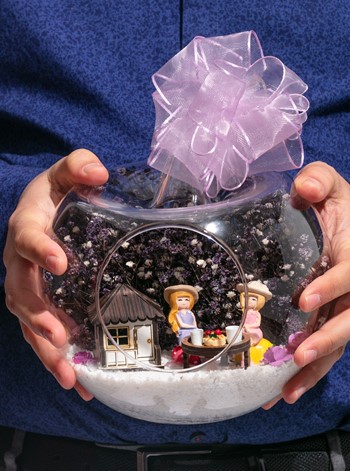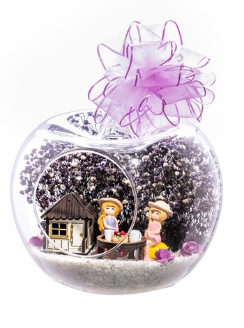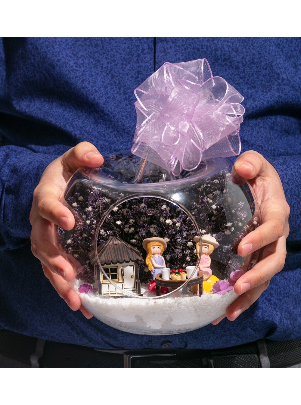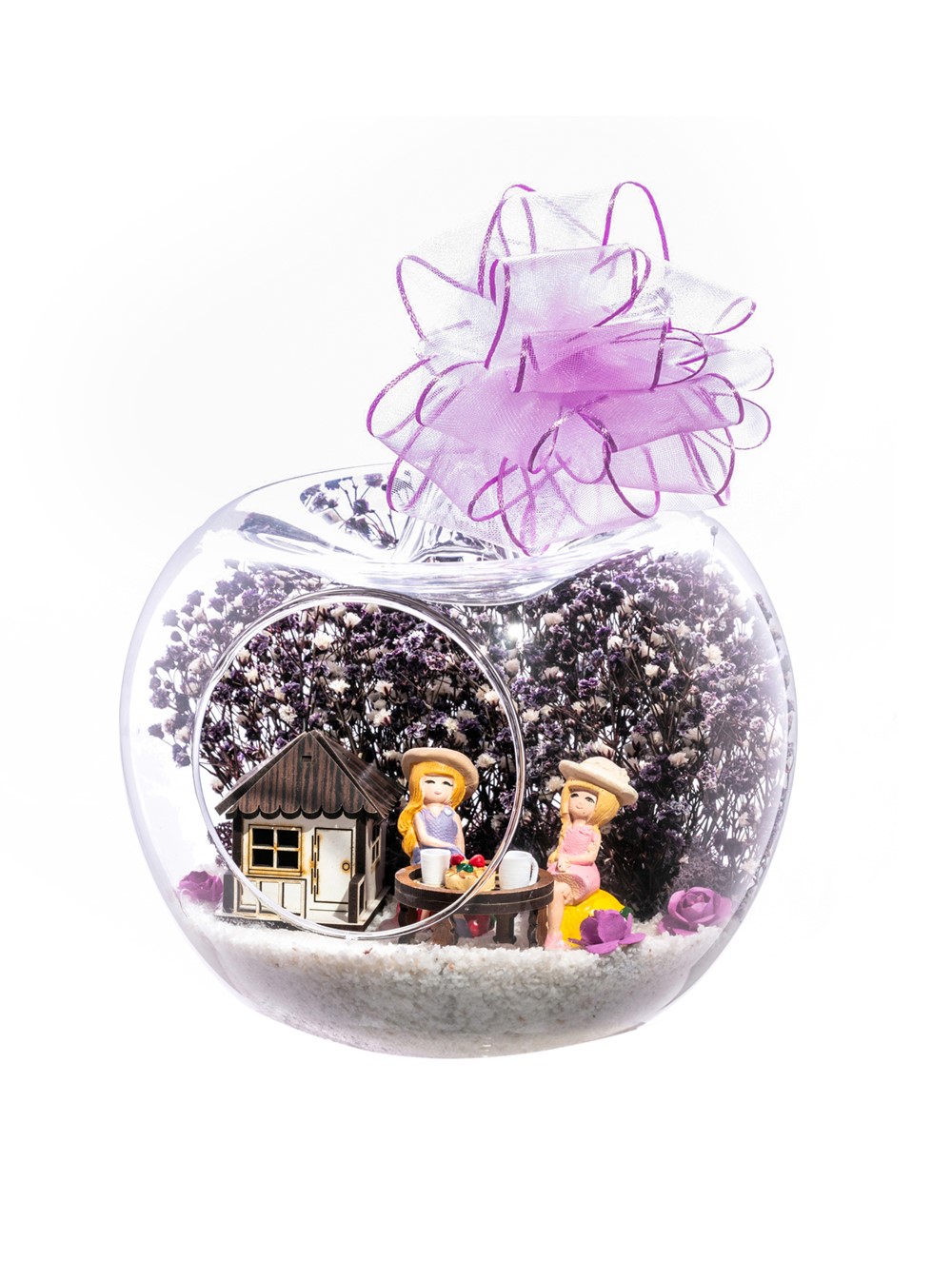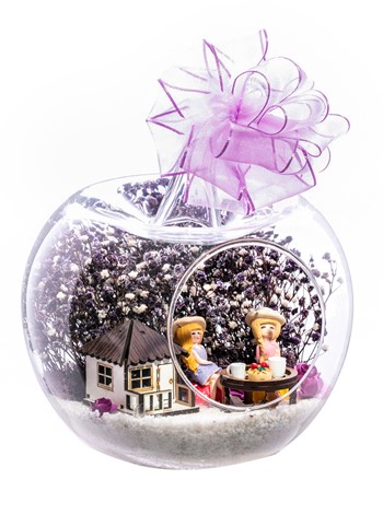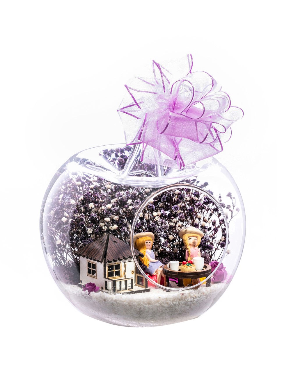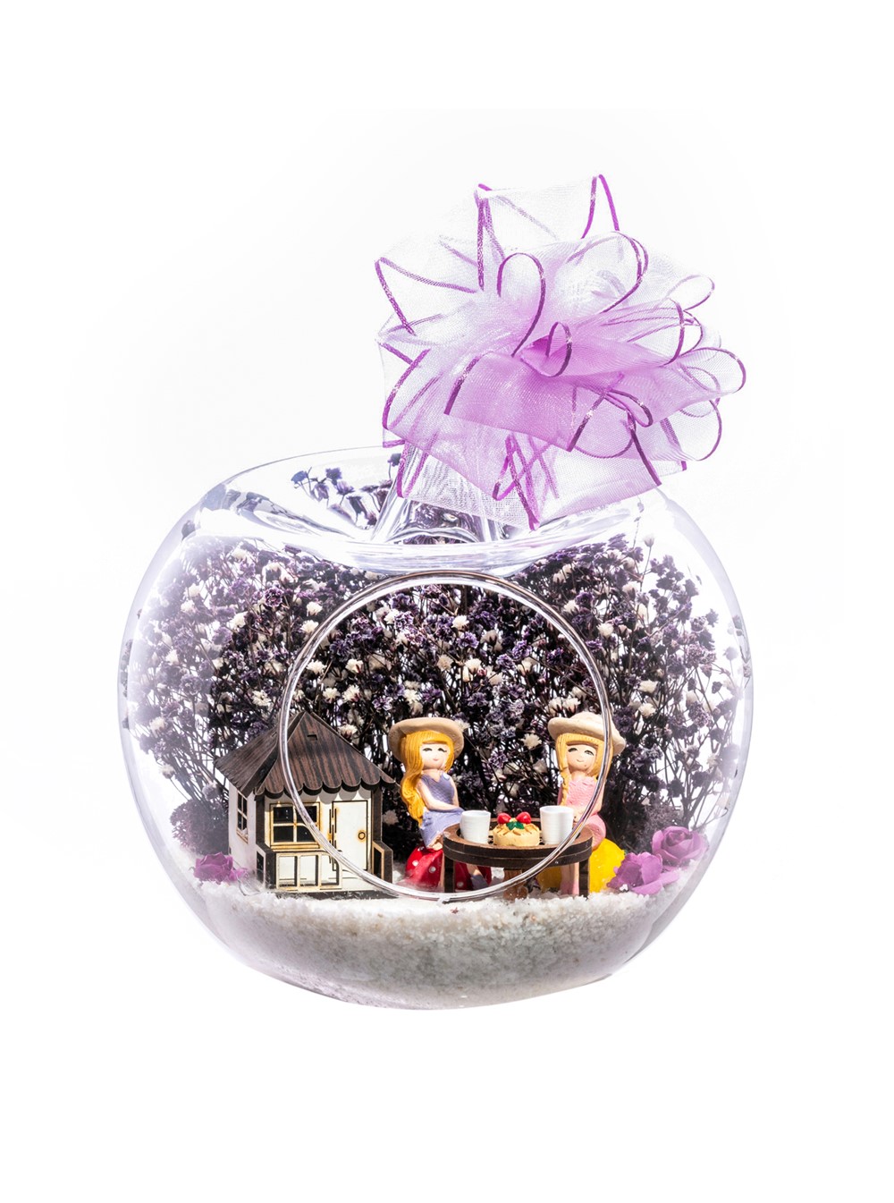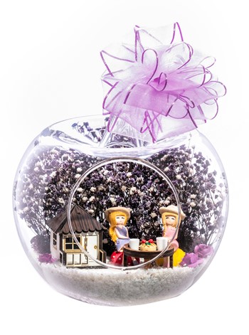 Küçük boy elma cam fanus içerisinde tasarladığımız bu kurdeleli güzel teraryum; beyaz kum, kurutulmuş bitkiler, şoklanmış yosunlar, yapay mini güller, bir adet beyaz ahşap ev, bir adet üzerinde turtası ve kupalarıyla otantik ahşap sehpa ve sohbet eden iki genç kadını simgeleyen objeler kullanılarak tamamlanmıştır. Ev ve ofis ortamlarının tamamında sergilenebilir teraryumun içinde, kurutulmuş bitkiler bulunduğundan hava alması önemlidir. Açık olan kısmının kapatılmaması veya büfe vb. kapalı alanlara konulmaması gereklidir. Özellikle her ortamda yıllarca, zevkle izlenebilecek özel bir teraryumdur. Yaklaşık Ölçüleri: 20x20cm NOT: Teraryumlarda kullanılan camlar, üfleme cam işçiliğiyle üretildiğinden bazı detaylarda farklılıklar gözlenebilir. Örneğin, sap kısmı ve ağız bitiş noktalarının her biri kendine özgüdür. Teraryum Keyifli Sohbet -Mor