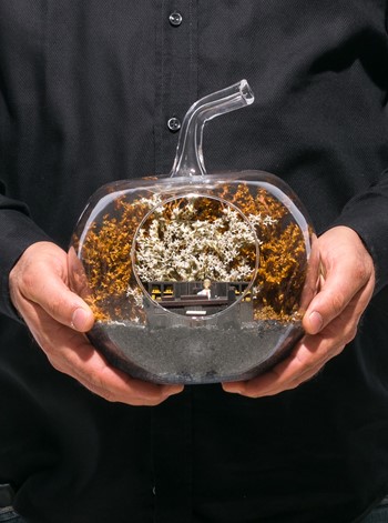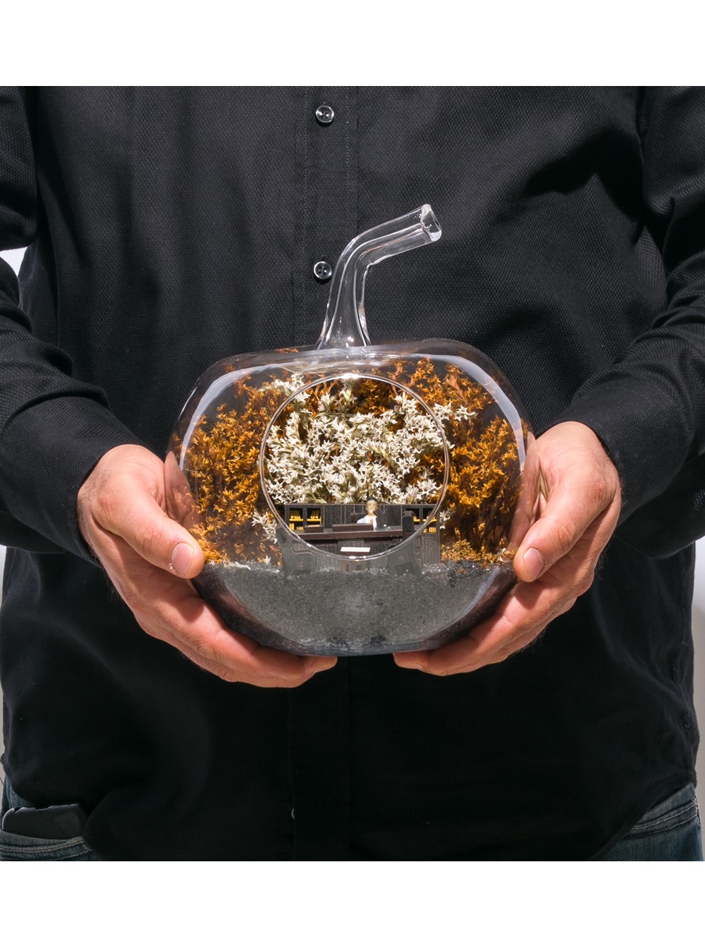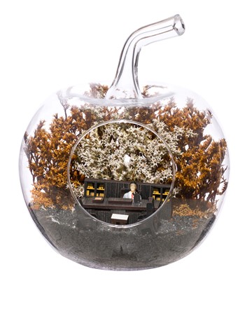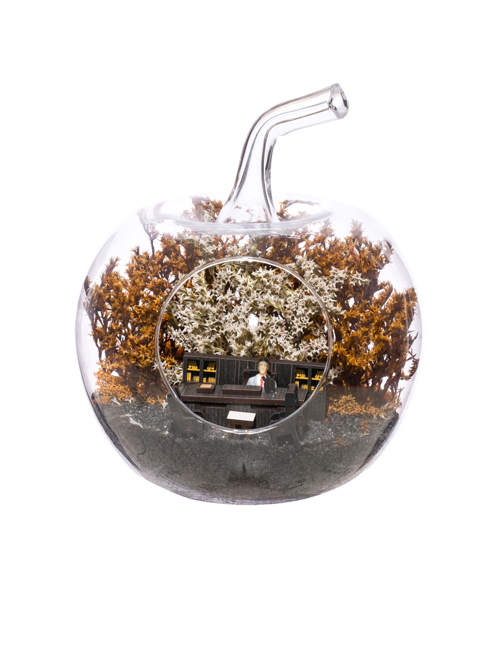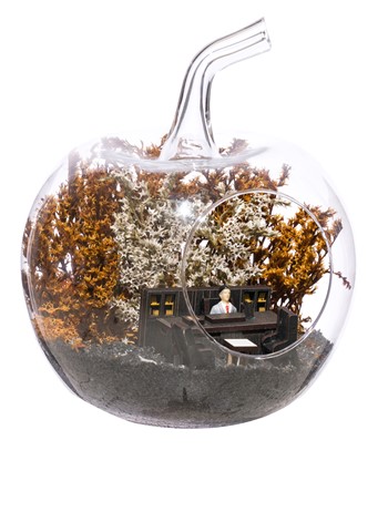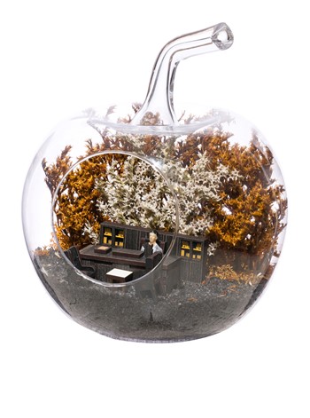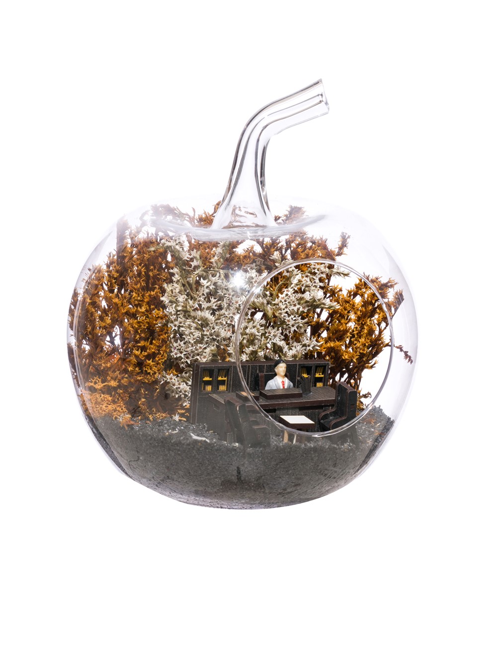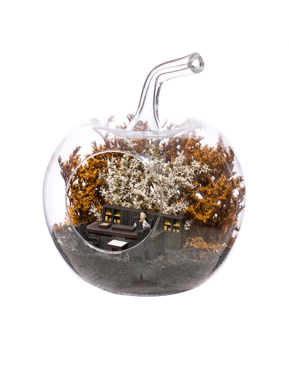 Küçük boy elma cam fanus içerisinde tasarladığımız bu çok güzel teraryum; siyah kum, şoklanmış yosunlar, kurutulmuş bitkiler, bir adet ahşap ofis görseli ve bir adet masasında çalışan erkek görseli kullanılarak tamamlanmıştır. Ev ve ofis ortamlarının tamamında sergilenebilir teraryumun içinde, kurutulmuş ve şoklanmış bitkiler bulunduğundan hava alması önemlidir. Açık olan kısmının kapatılmaması veya büfe vb. kapalı alanlara konulmaması gereklidir. Özellikle her ortamda yıllarca, zevkle izlenebilecek özel bir teraryumdur. Yaklaşık Ölçüleri: 20x20cm NOT: Teraryumlarda kullanılan camlar, üfleme cam işçiliğiyle üretildiğinden bazı detaylarda farklılıklar gözlenebilir. Örneğin, sap kısmı ve ağız bitiş noktalarının her biri kendine özgüdür.